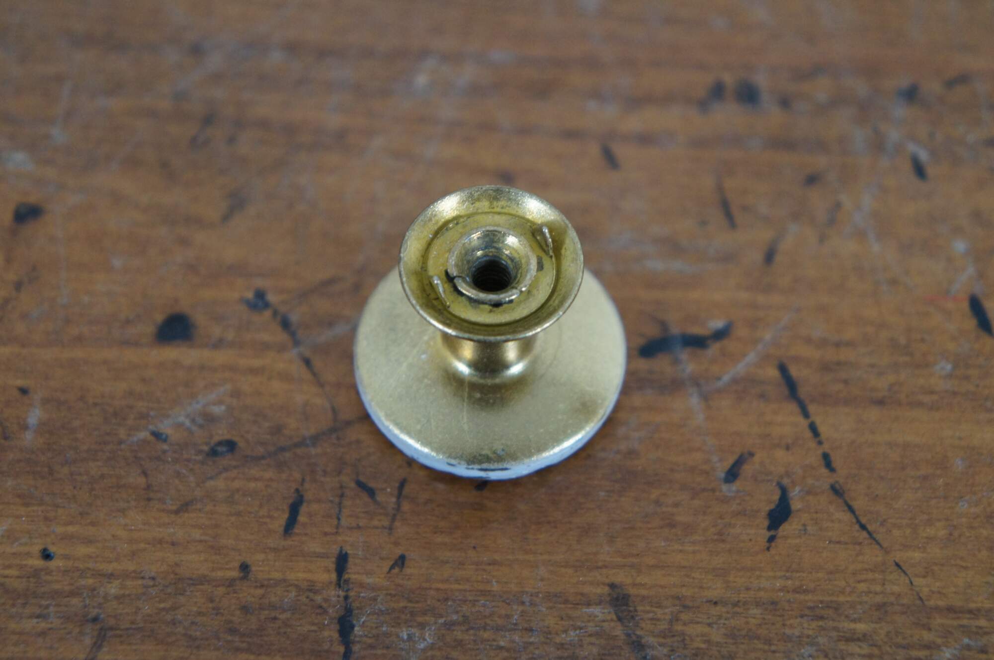 20 Available - Mid to late 20th century old-stock drawer / cabinet pulls. National Lock Company - Medalist, item number C645-5C, Knob, White Gold. Hollywood Regency styling. Round knob with recessed scallop shell detail, pearl at center framed with three scrolls. Painted white with gilded edges and raised details.