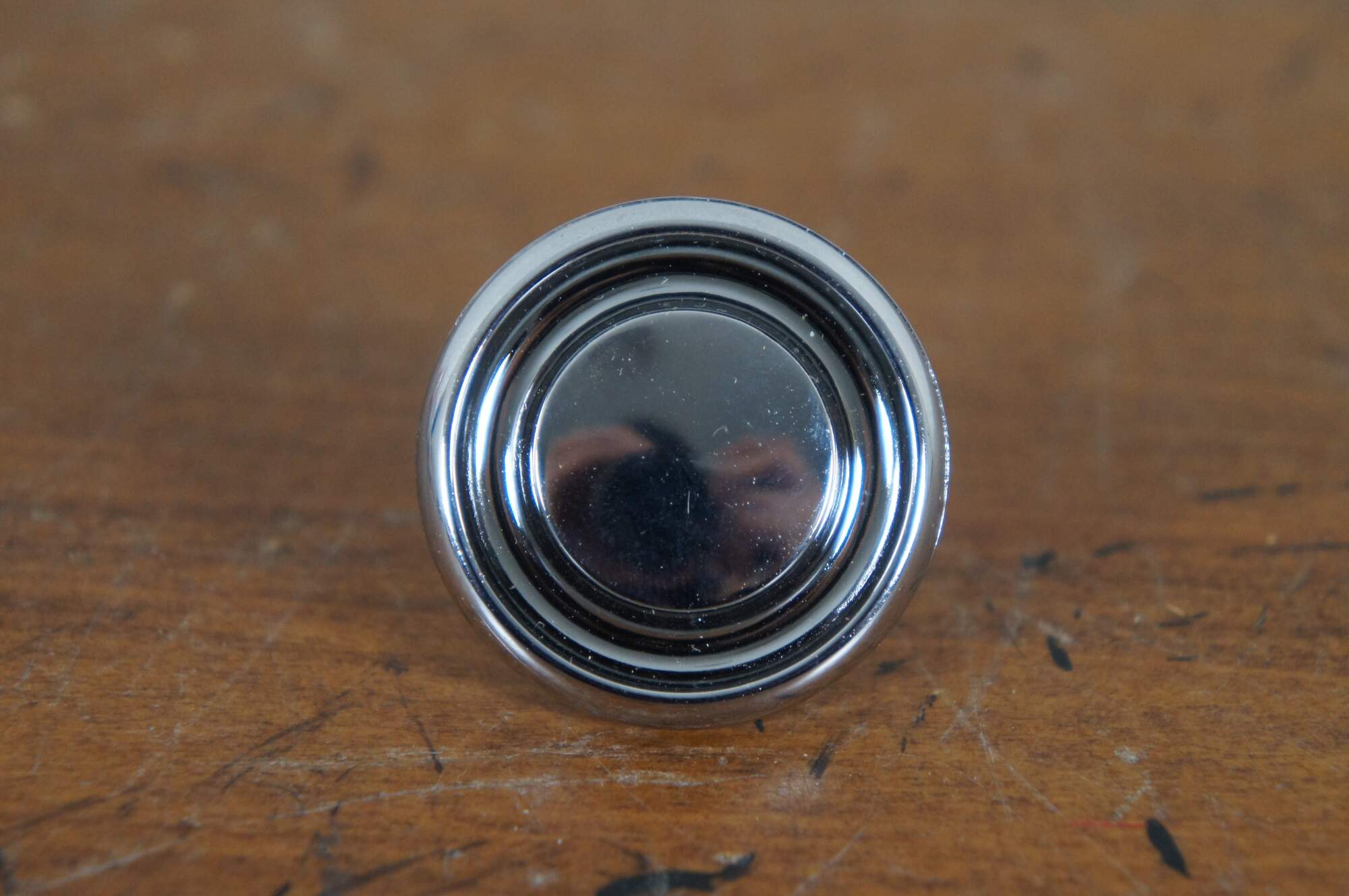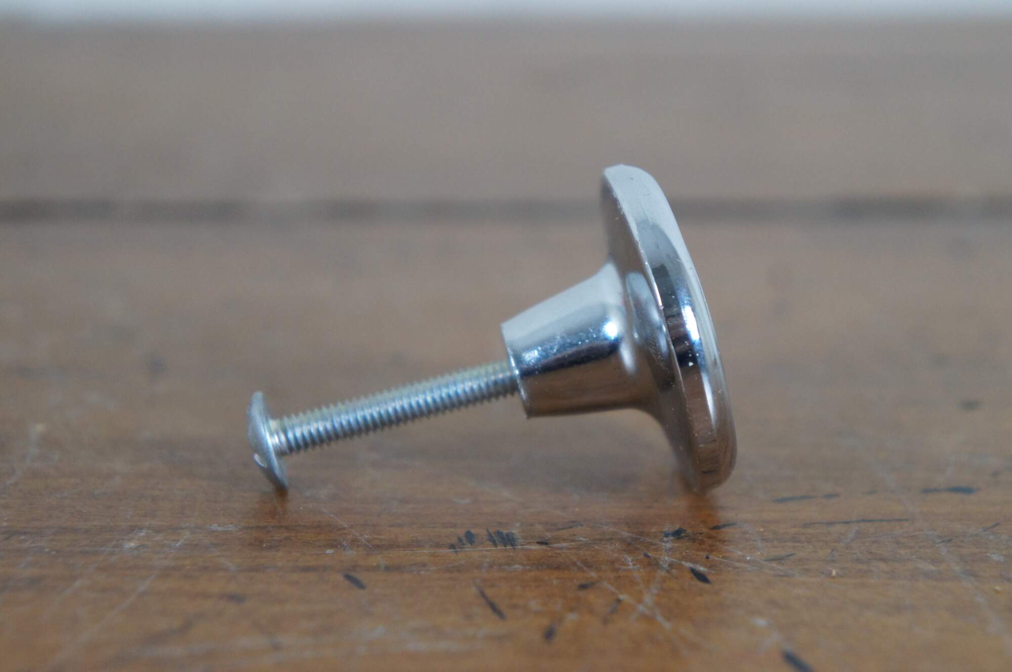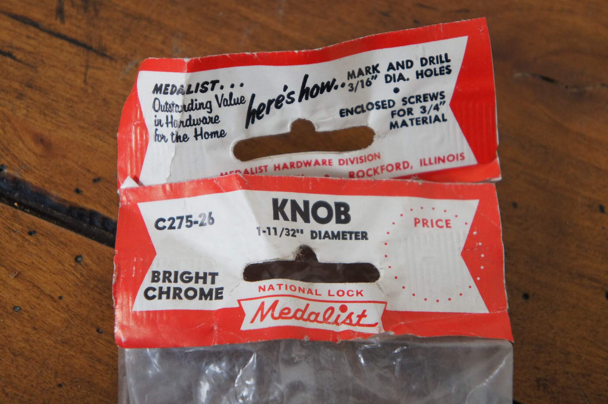 8 Available - Mid to late 20th century old-stock drawer / cabinet pulls. National Lock Company - Medalist, item number C275-26 Knob, Bright Chrome. Round button shape with recessed groove.
