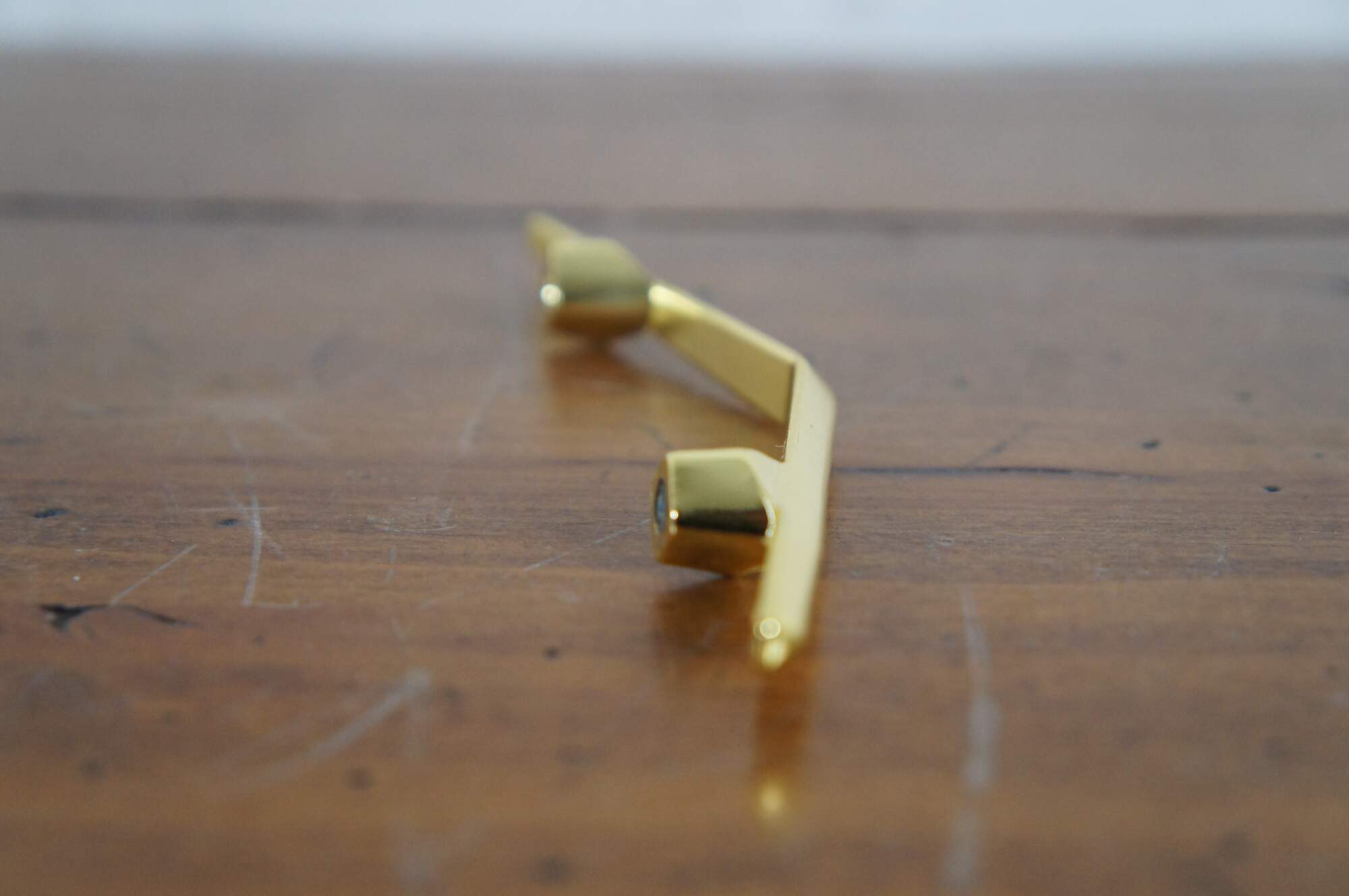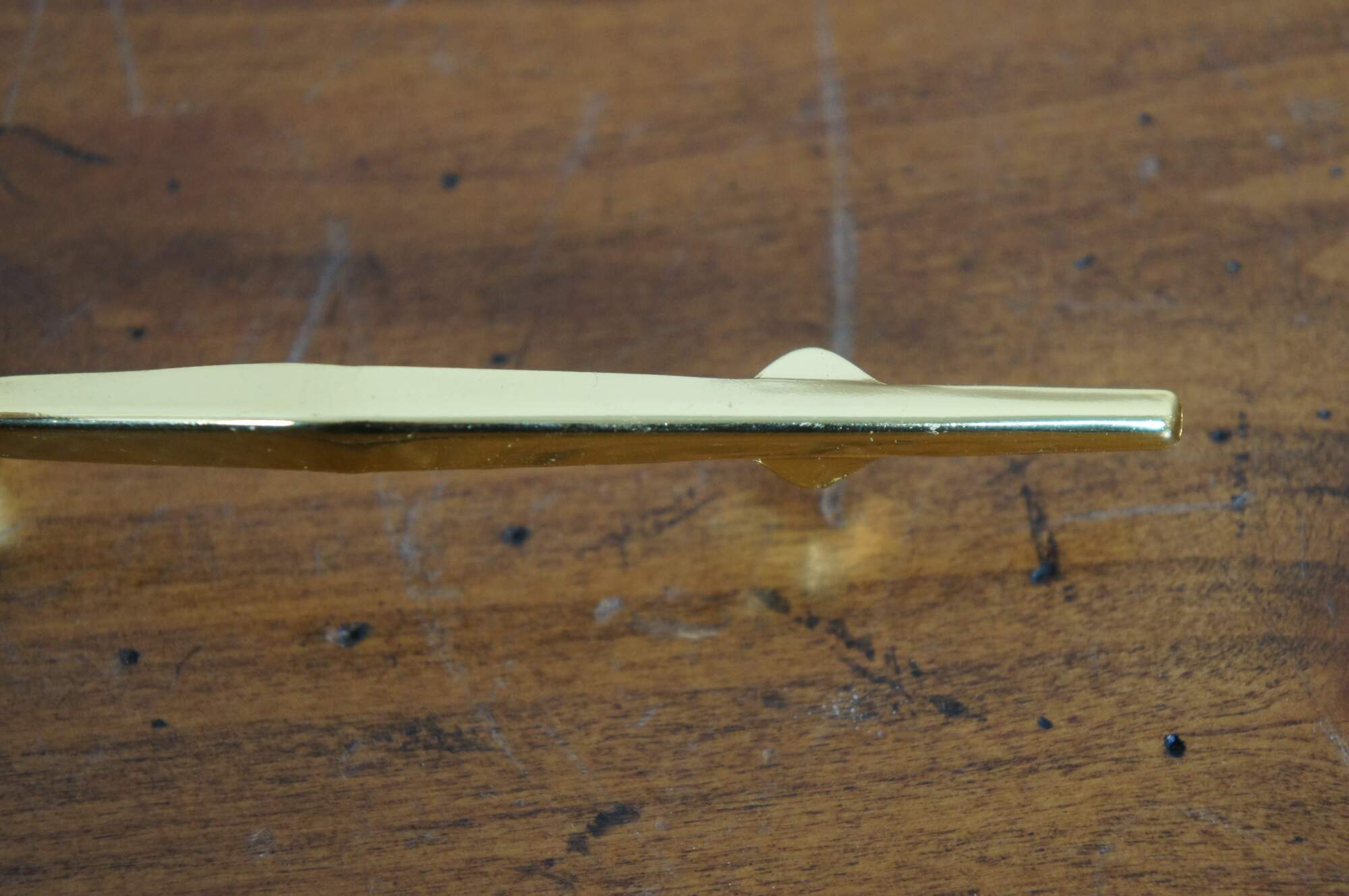 25 Available - Mid to late 20th century old-stock drawer / cabinet pulls. National Lock Company - Medalist, item number C279-3 Starflite Pull, Bright Brass. Mid Century Modern styling. Triangular, airplane or arrow-like shape.