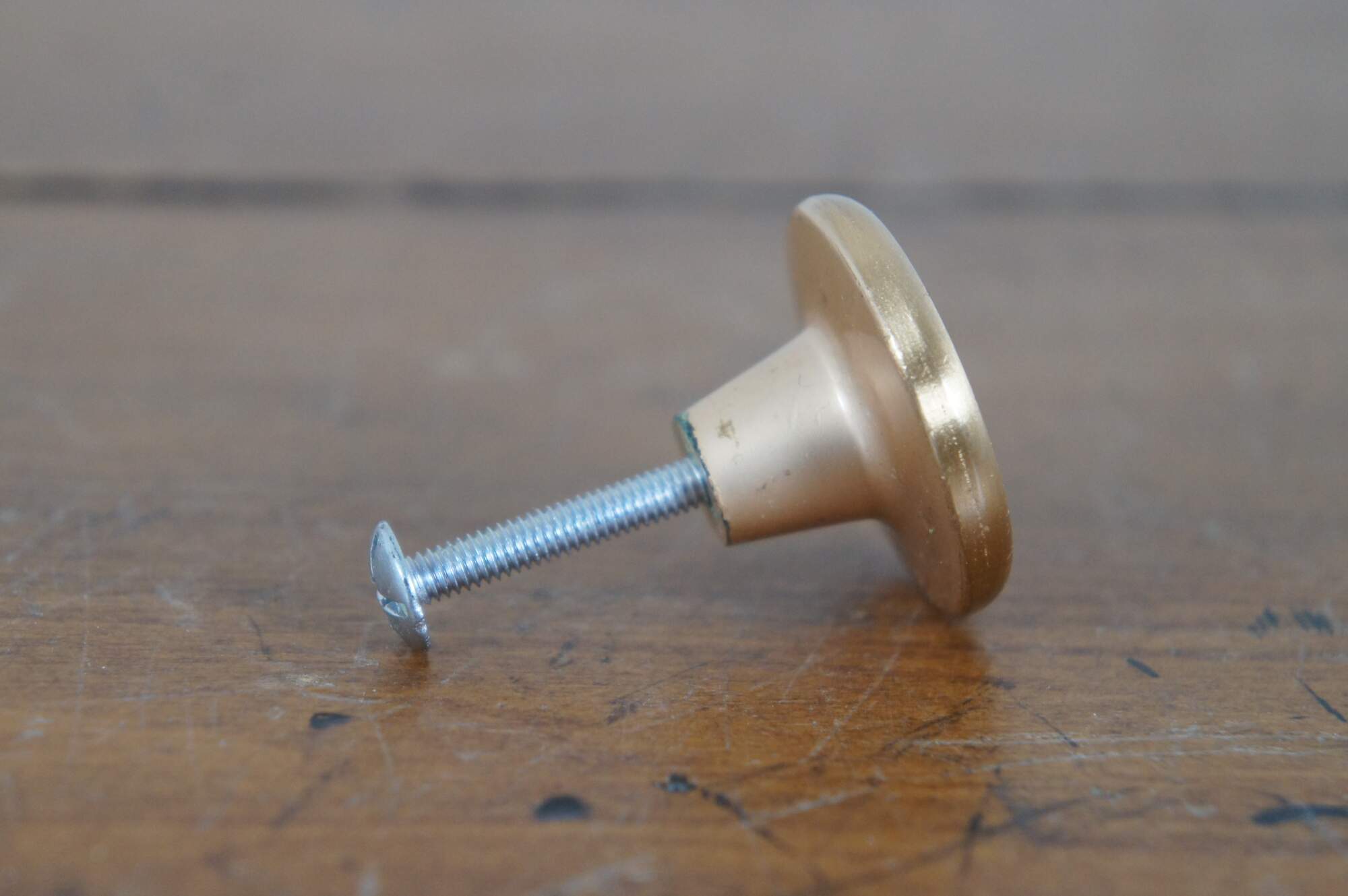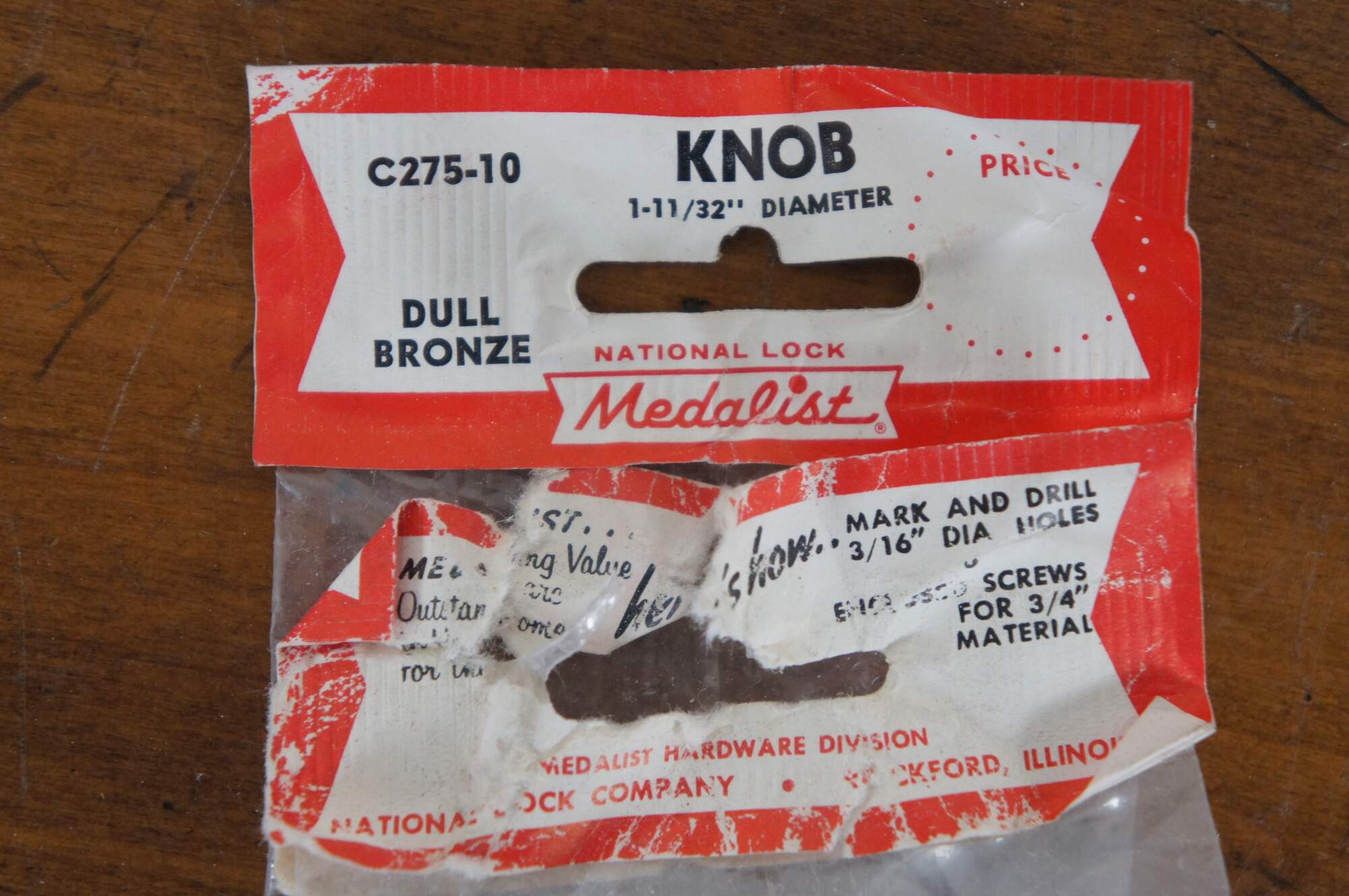 Mid to late 20th century old-stock drawer / cabinet pull pair. National Lock Company - Medalist, item number C275-10 Knob, Dull Bronze. Simple round button shape with recessed groove.
