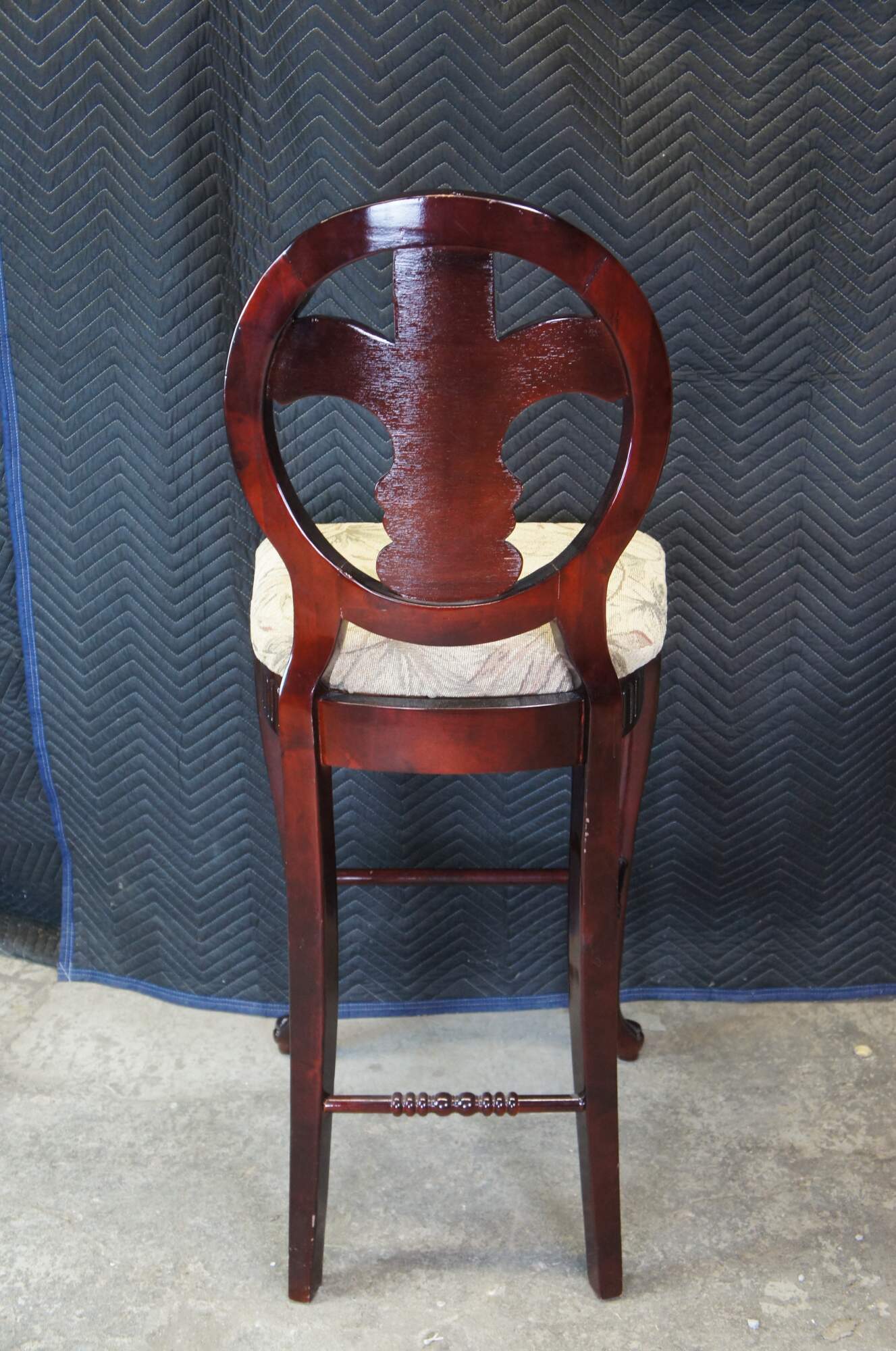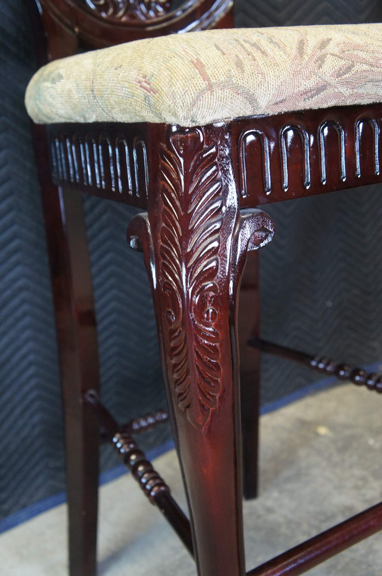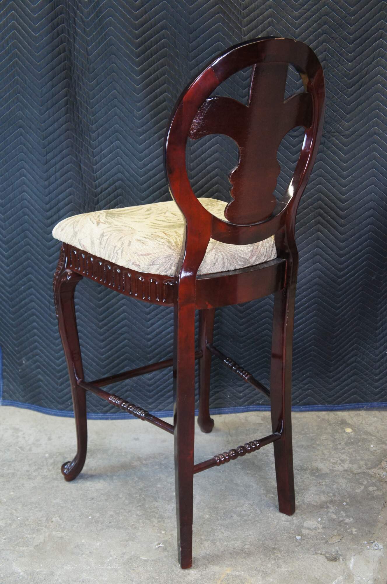 The Pulaski Foxcroft Bar Stool has an elegantly carved back showcasing prince of wales feathers and acanthus carved legs as well as a lovely and classic upholstered seat. Finished in mahogany