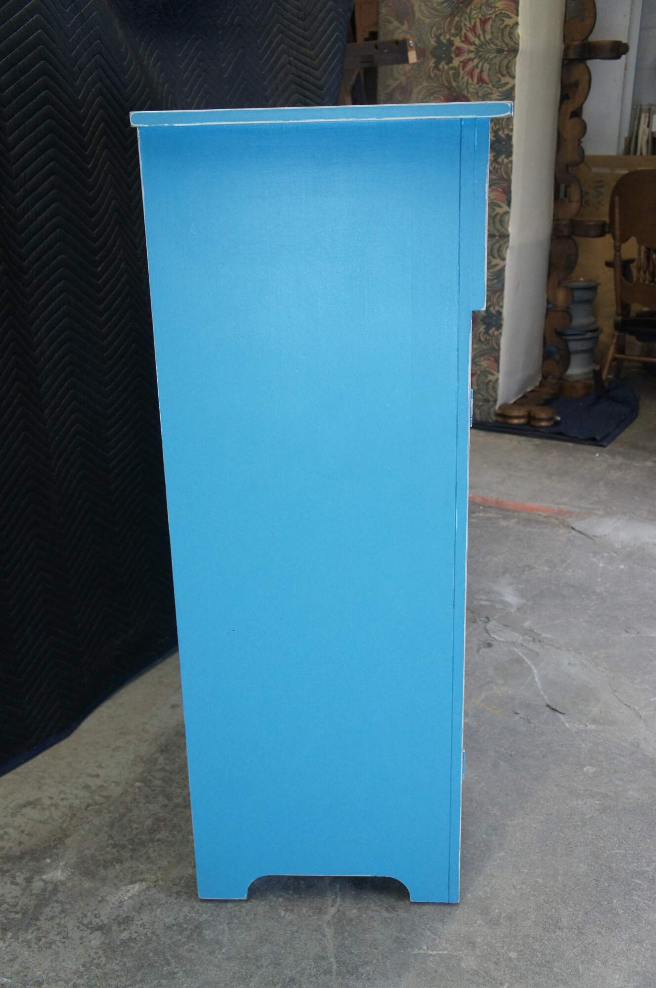 A beautiful blue cupboard by Jasper Cabinet Company. Made from hardwood with two dovetailed drawers over lower cabinet with adjustable shelves. The lower doors feature antiqued glass. A unique design inspired by American Jelly Cabinets from the 19th century. Great for use as a curio, display cabinet, buffet, credenza, console table or media storage cabinet.