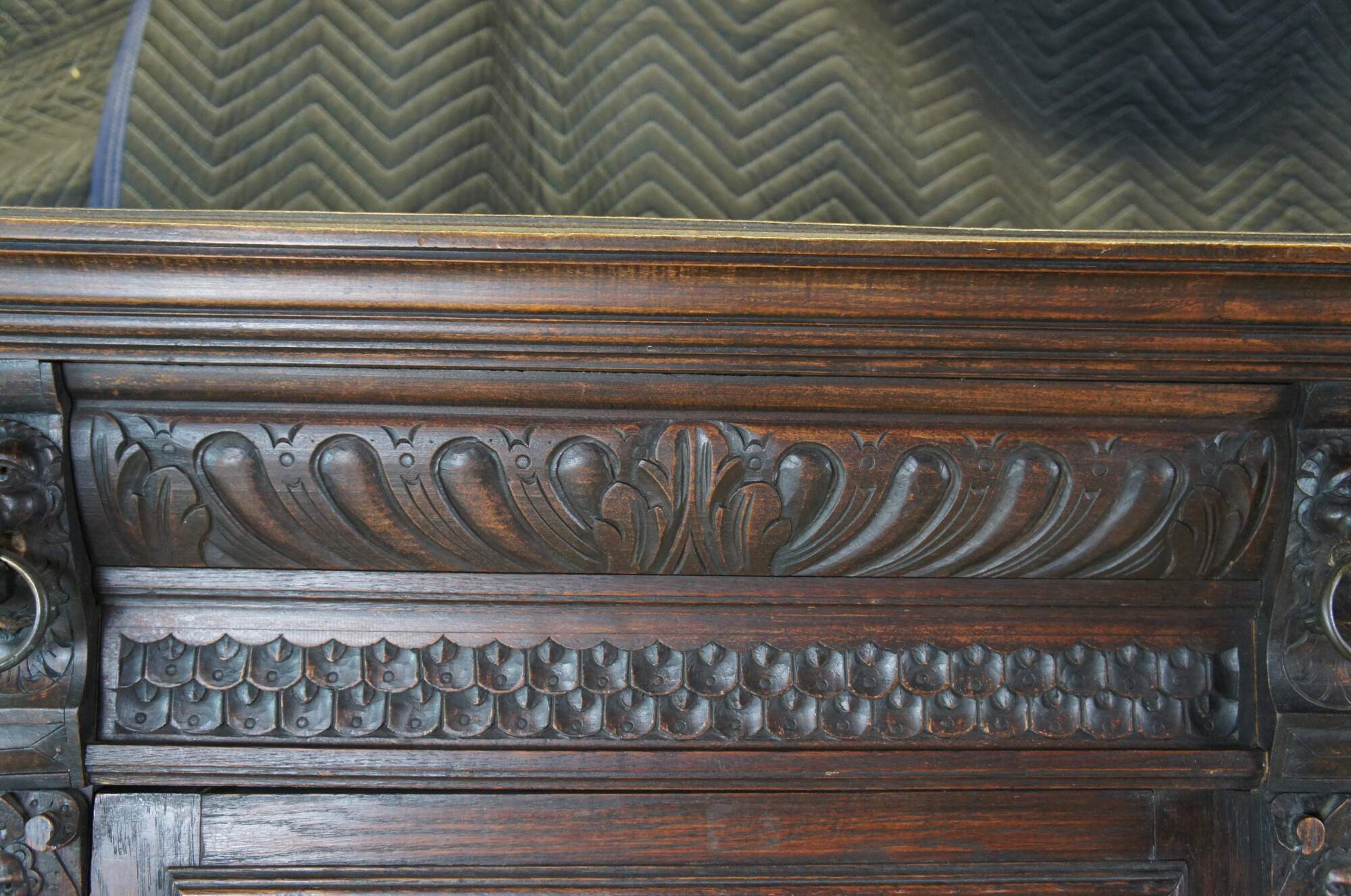 Beautiful late 19th century French Renaissance Revival hanging cabinet. Great for use as a bookcase, curio, vitrine or display cabinet. Made from oak with intricate carved details. Features ornate gadrooning along the crown flanked by carved lion heads leading down to intricate nobleman along the stiles dressed in overcoats with large triangular hats and a mustache. The cabinet is paneled along the sides and opens via glass chickenwire covered door to two interior shelves. Includes a silk curtain with brocade pattern.