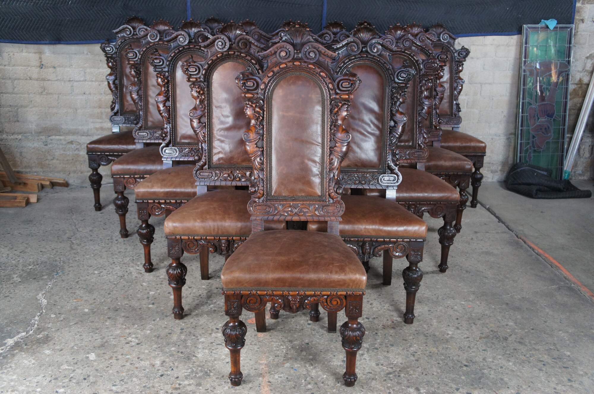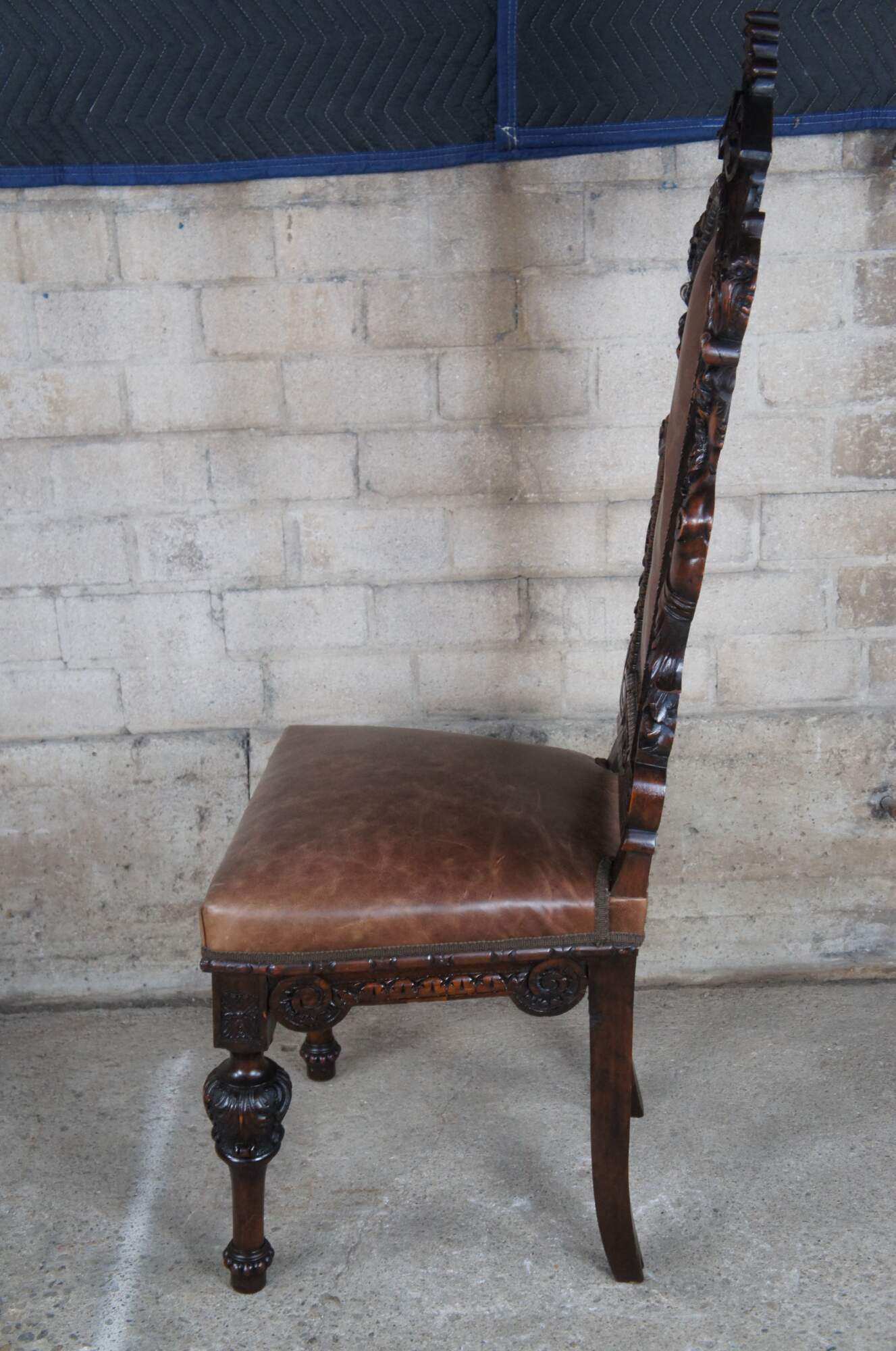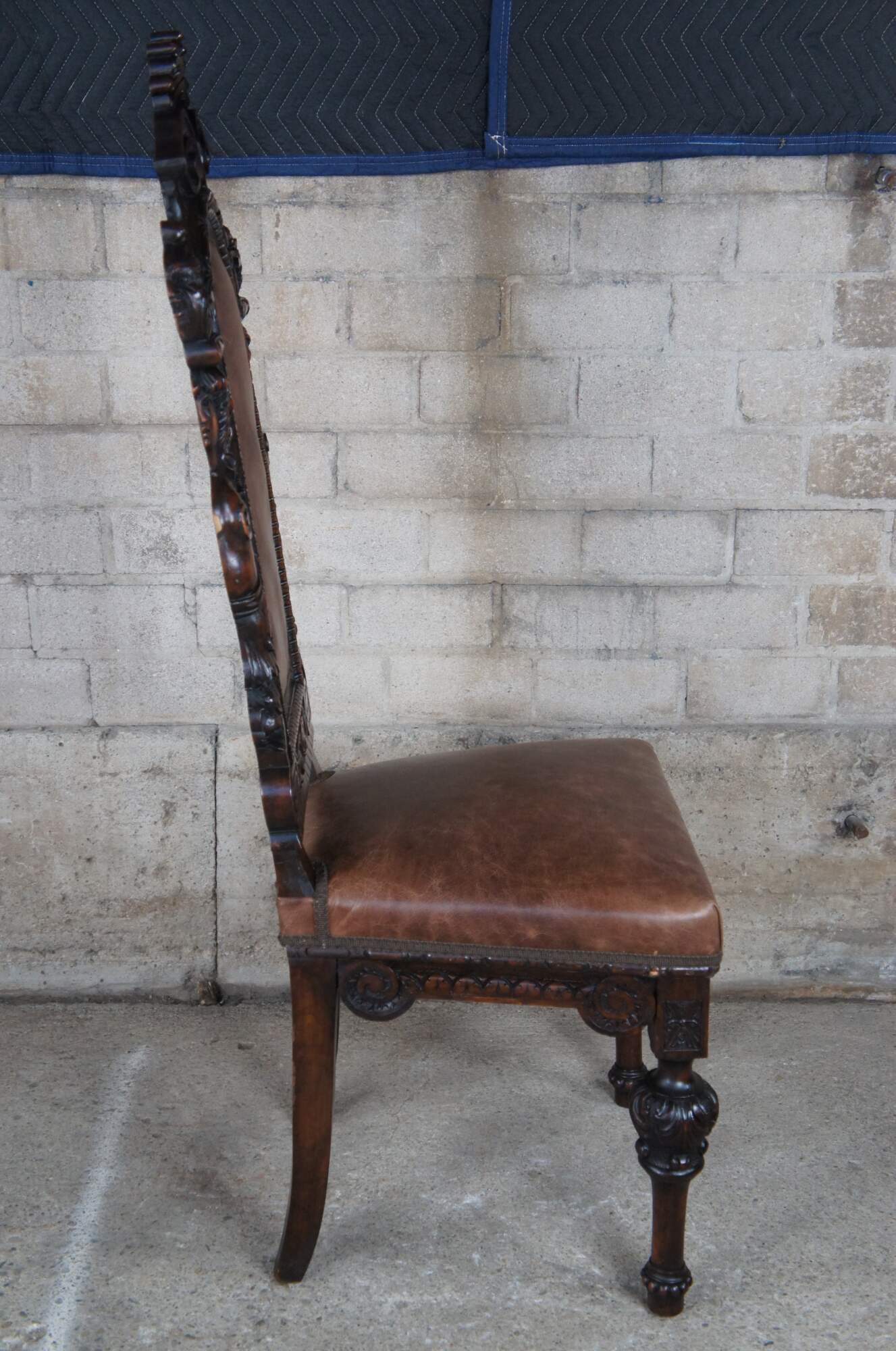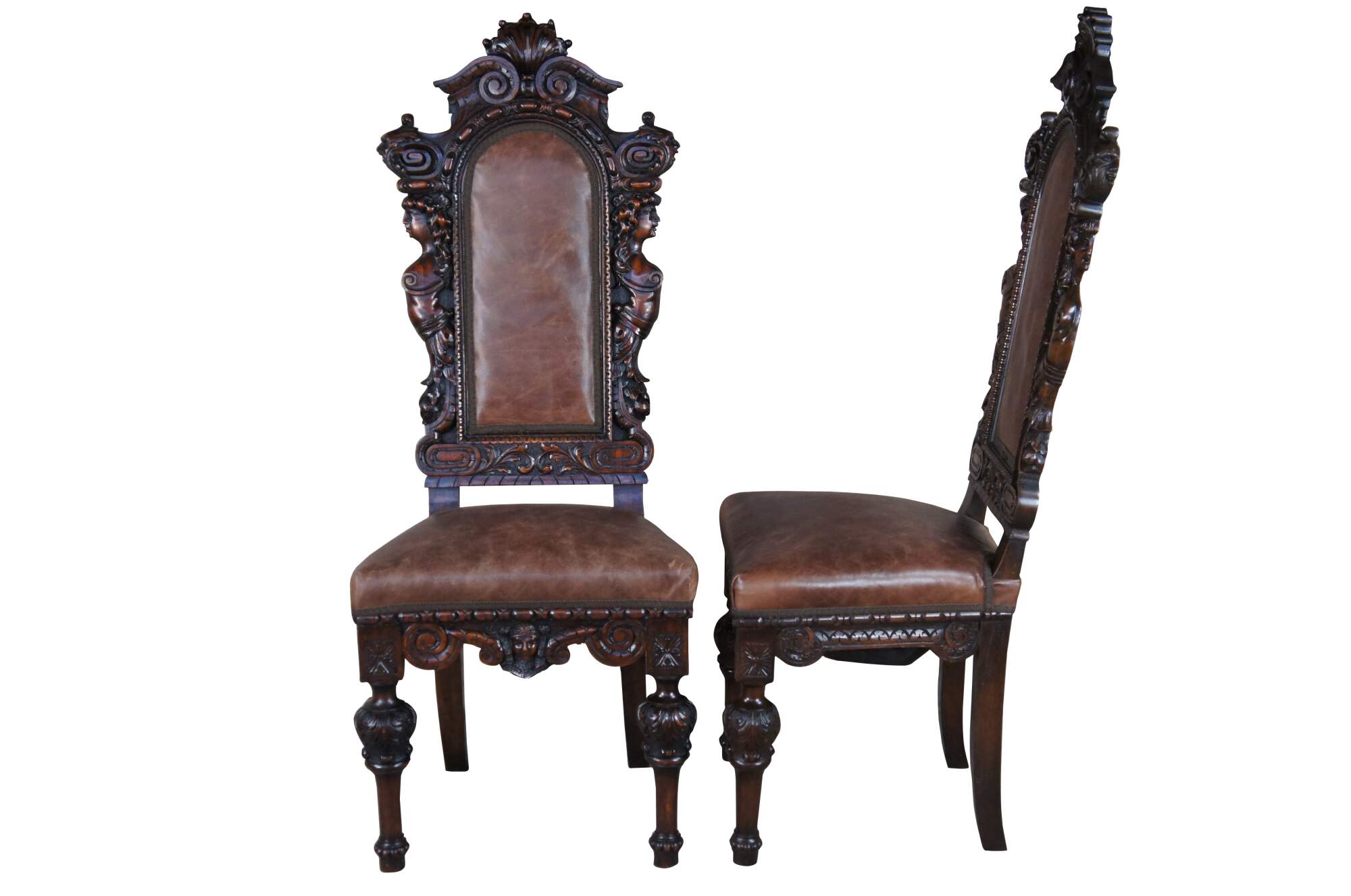 Exceedingly Rare Italian Renaissance Revival style high back mahogany dining chairs, circa 1850-1870s. Each chair is hand carved with an arched and scrolled high back centered by a scalloped shell. The sides showcase figural high relief maidens mirrored below North Wind faces at the ear. Includes acanthus and foliate motifs throughout. Upholstered in a brown top grain leather. Lower aprons feature a carved Guard at the center between an S scrolled Egg and Dart molding and floral medallions at the corners. The chairs are supported by robust acanthus carved baluster turned legs at the front leading to beaded feet.