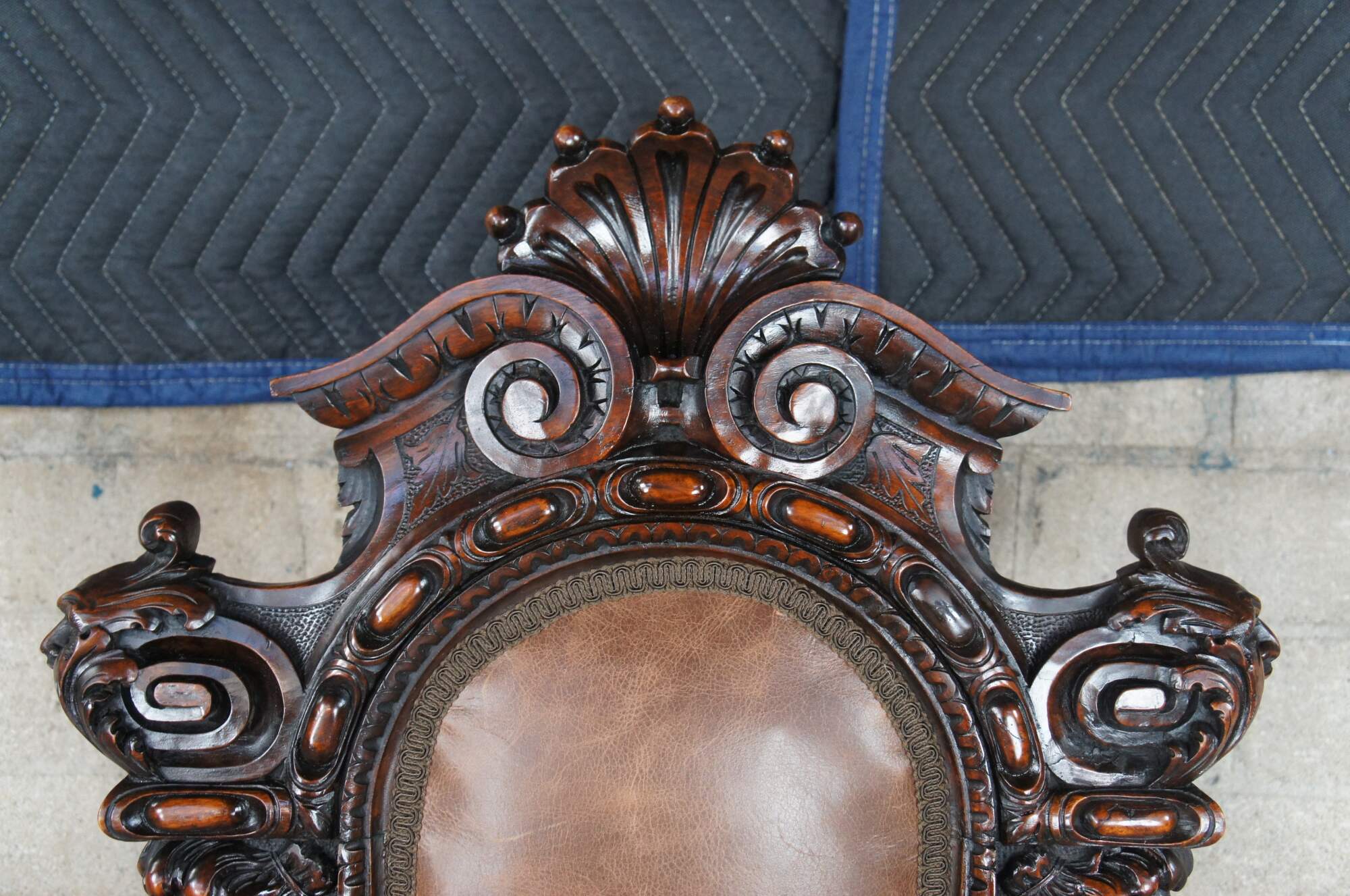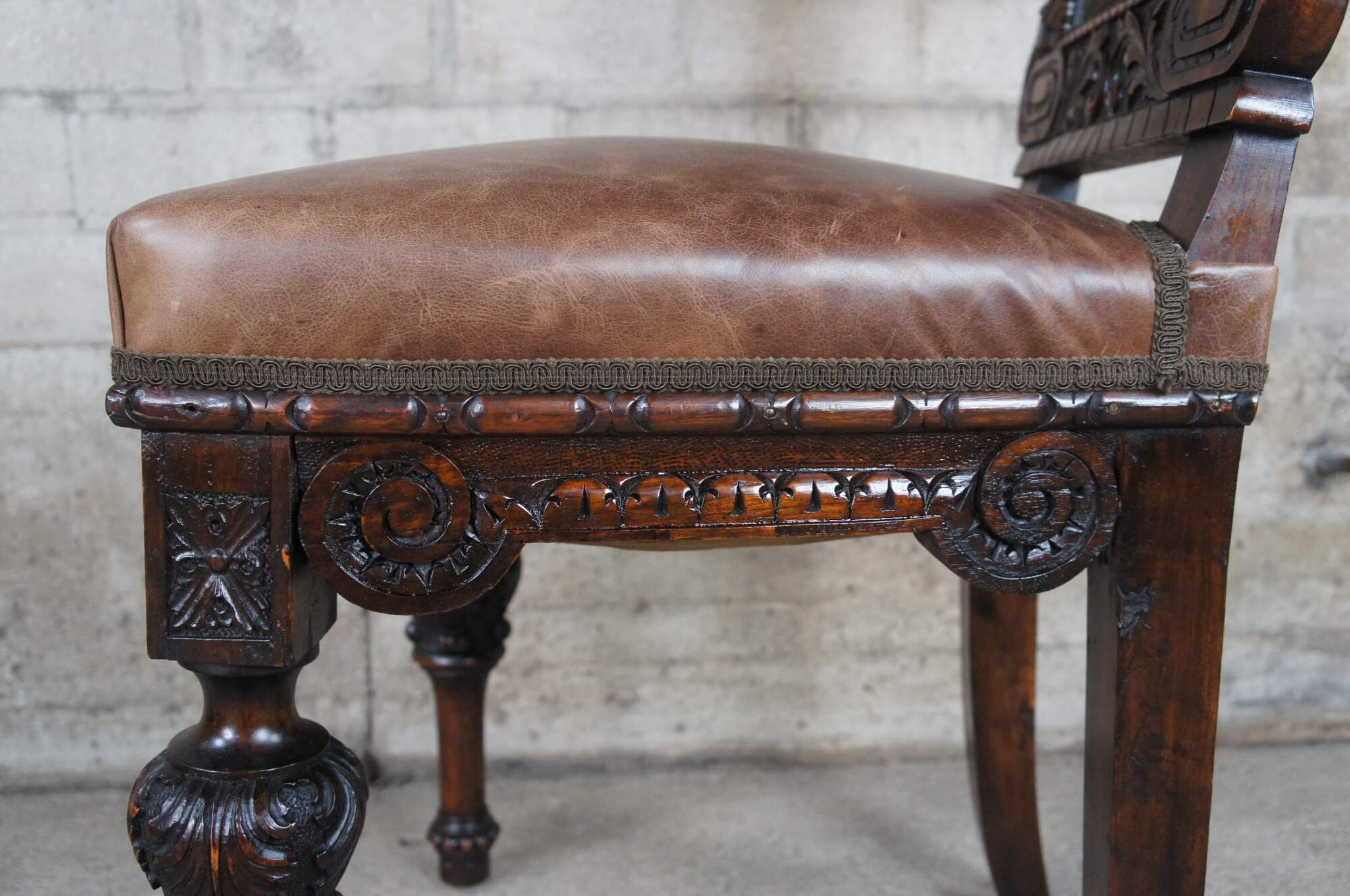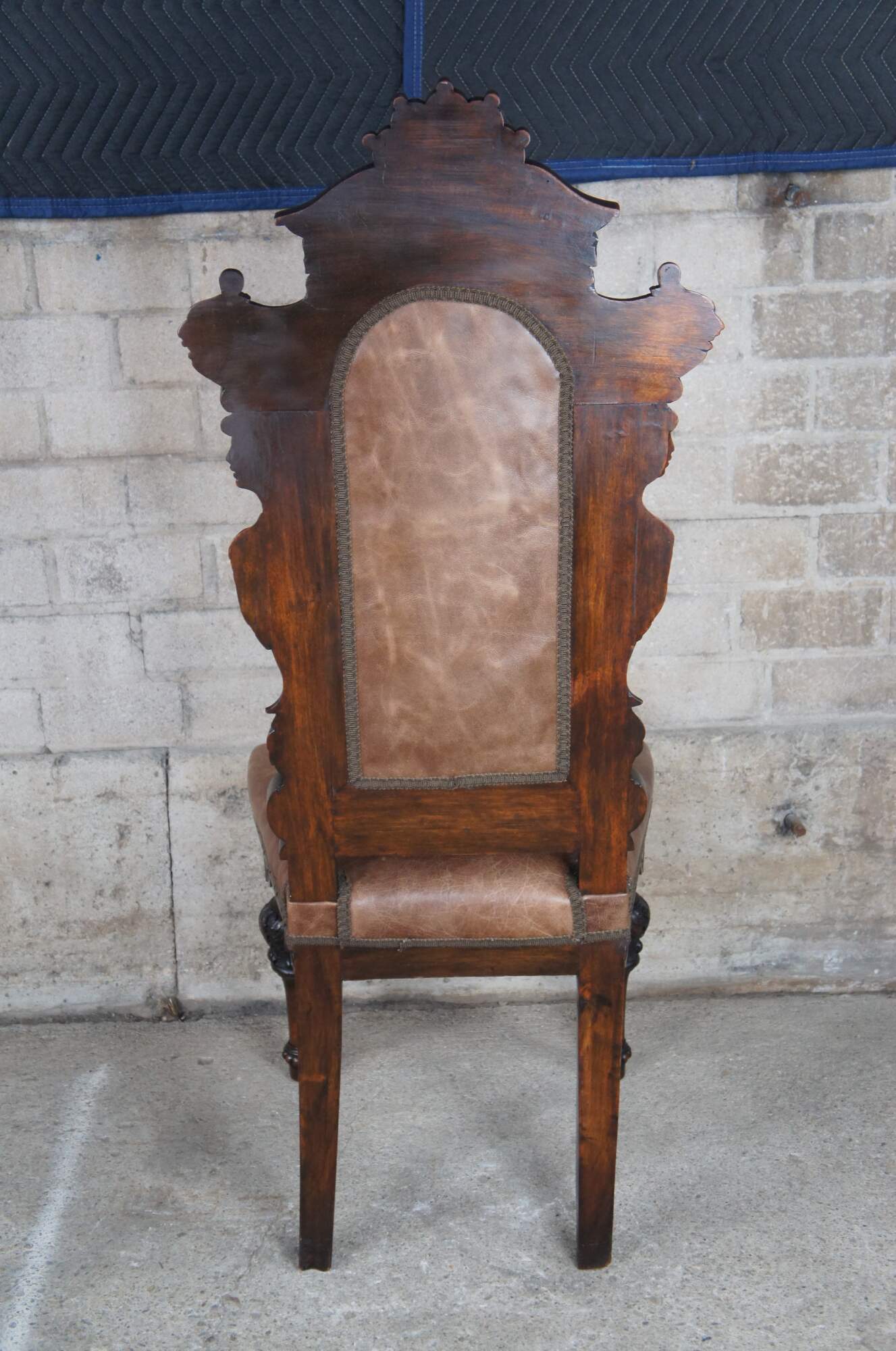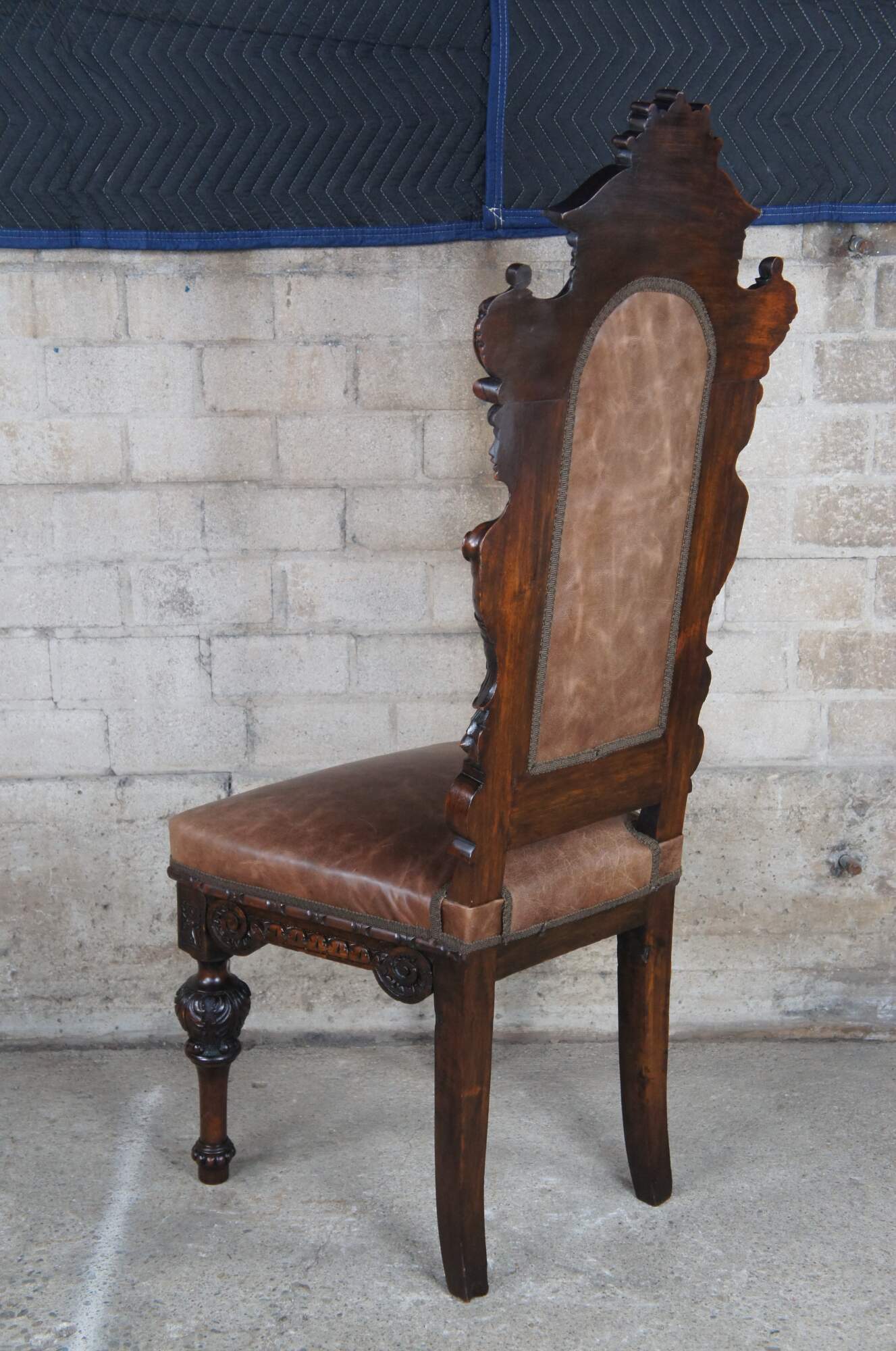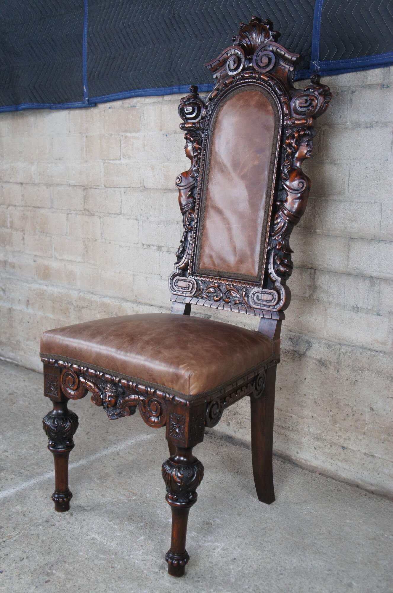 Exceedingly Rare Italian Renaissance Revival style high back mahogany dining chairs, circa 1850-1870s. Each chair is hand carved with an arched and scrolled high back centered by a scalloped shell. The sides showcase figural high relief maidens mirrored below North Wind faces at the ear. Includes acanthus and foliate motifs throughout. Upholstered in a brown top grain leather. Lower aprons feature a carved Guard at the center between an S scrolled Egg and Dart molding and floral medallions at the corners. The chairs are supported by robust acanthus carved baluster turned legs at the front leading to beaded feet.