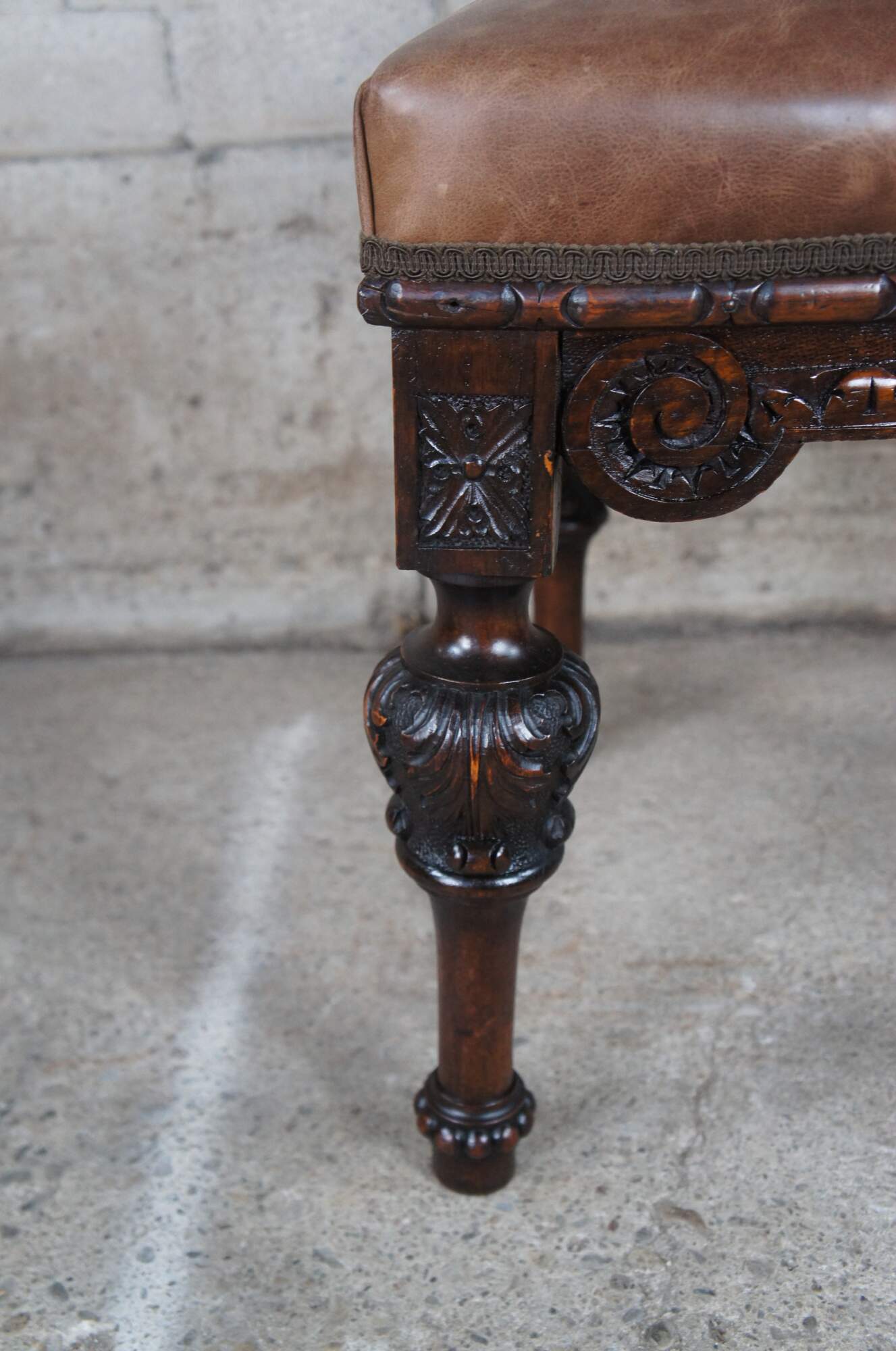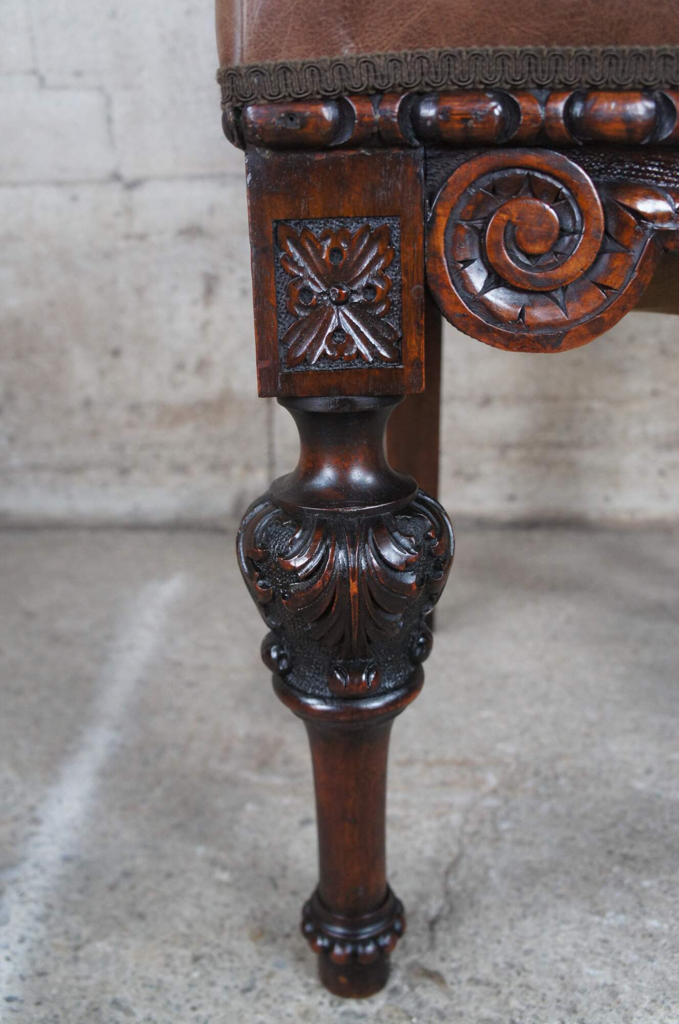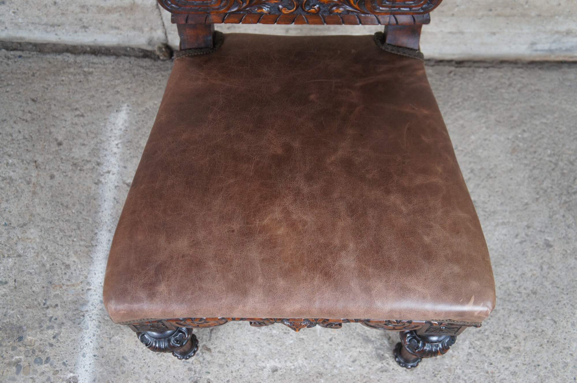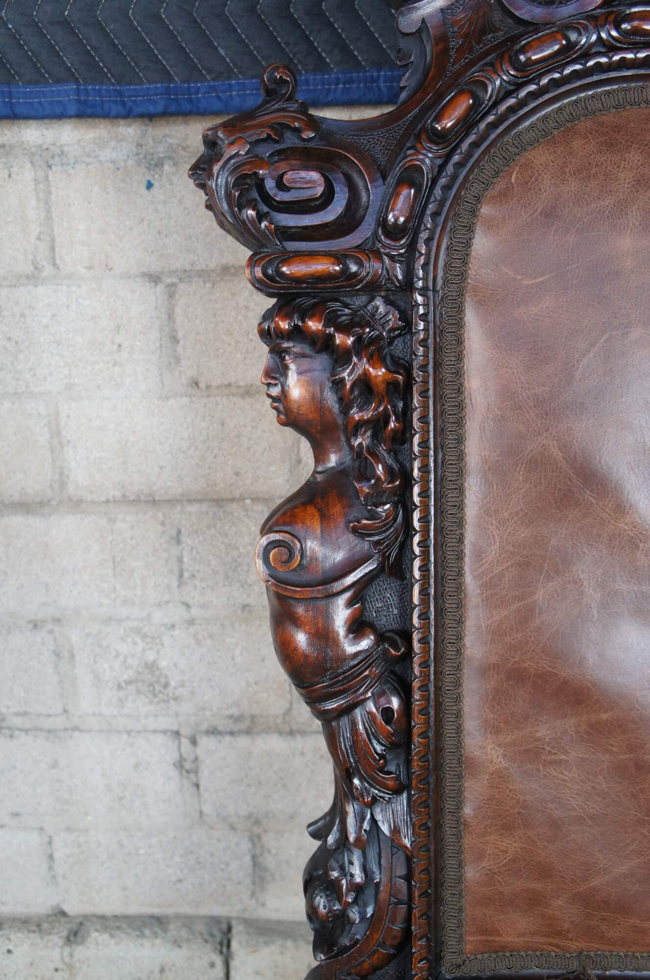 Exceedingly Rare Italian Renaissance Revival style high back mahogany dining chairs, circa 1850-1870s. Each chair is hand carved with an arched and scrolled high back centered by a scalloped shell. The sides showcase figural high relief maidens mirrored below North Wind faces at the ear. Includes acanthus and foliate motifs throughout. Upholstered in a brown top grain leather. Lower aprons feature a carved Guard at the center between an S scrolled Egg and Dart molding and floral medallions at the corners. The chairs are supported by robust acanthus carved baluster turned legs at the front leading to beaded feet.