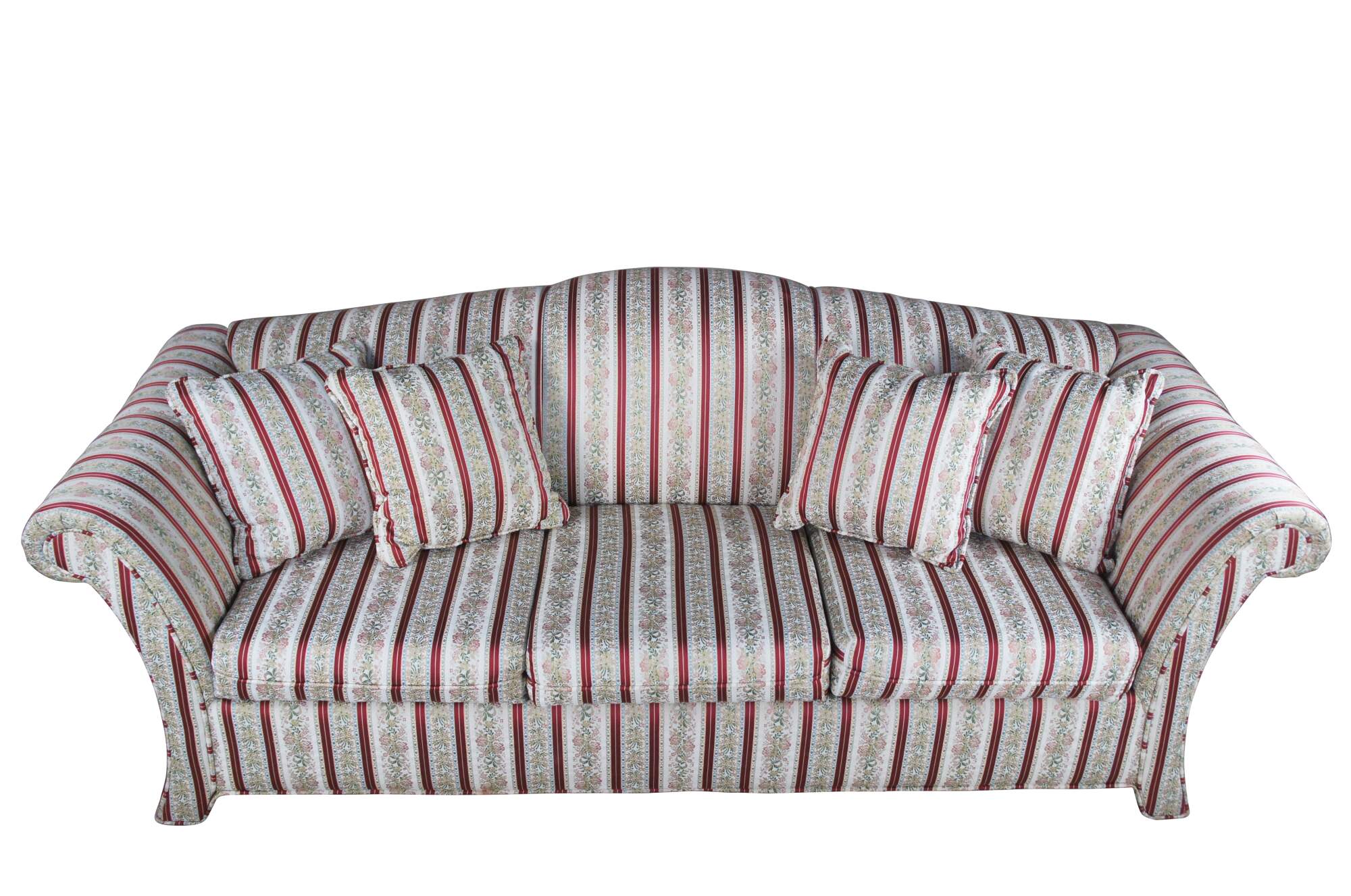 Vintage three seat sleeper sofa / pull out couch with queen size bed featuring Neoclassical styling with rolled arms, camelback and striped floral and ribbon design fabric.