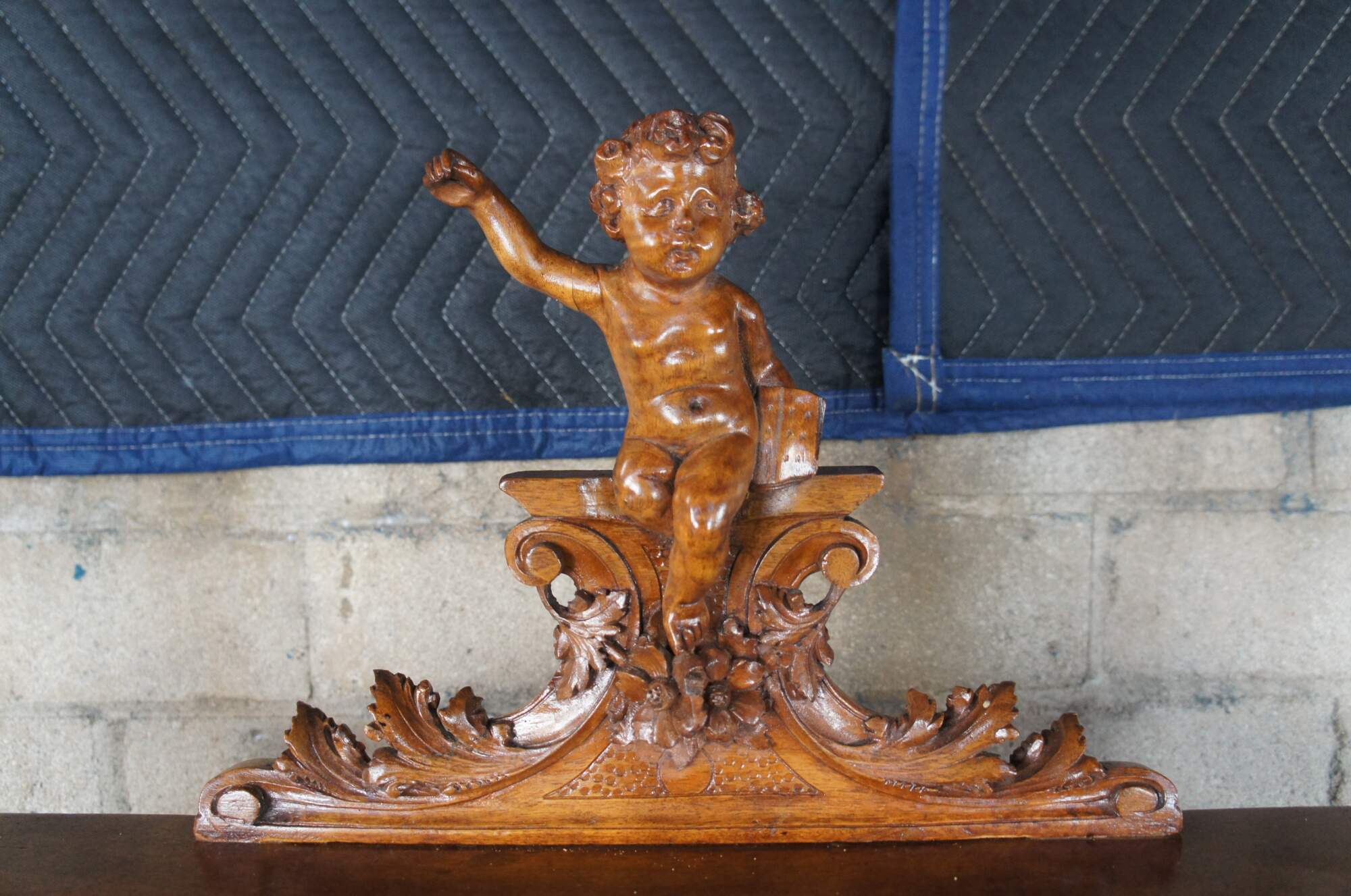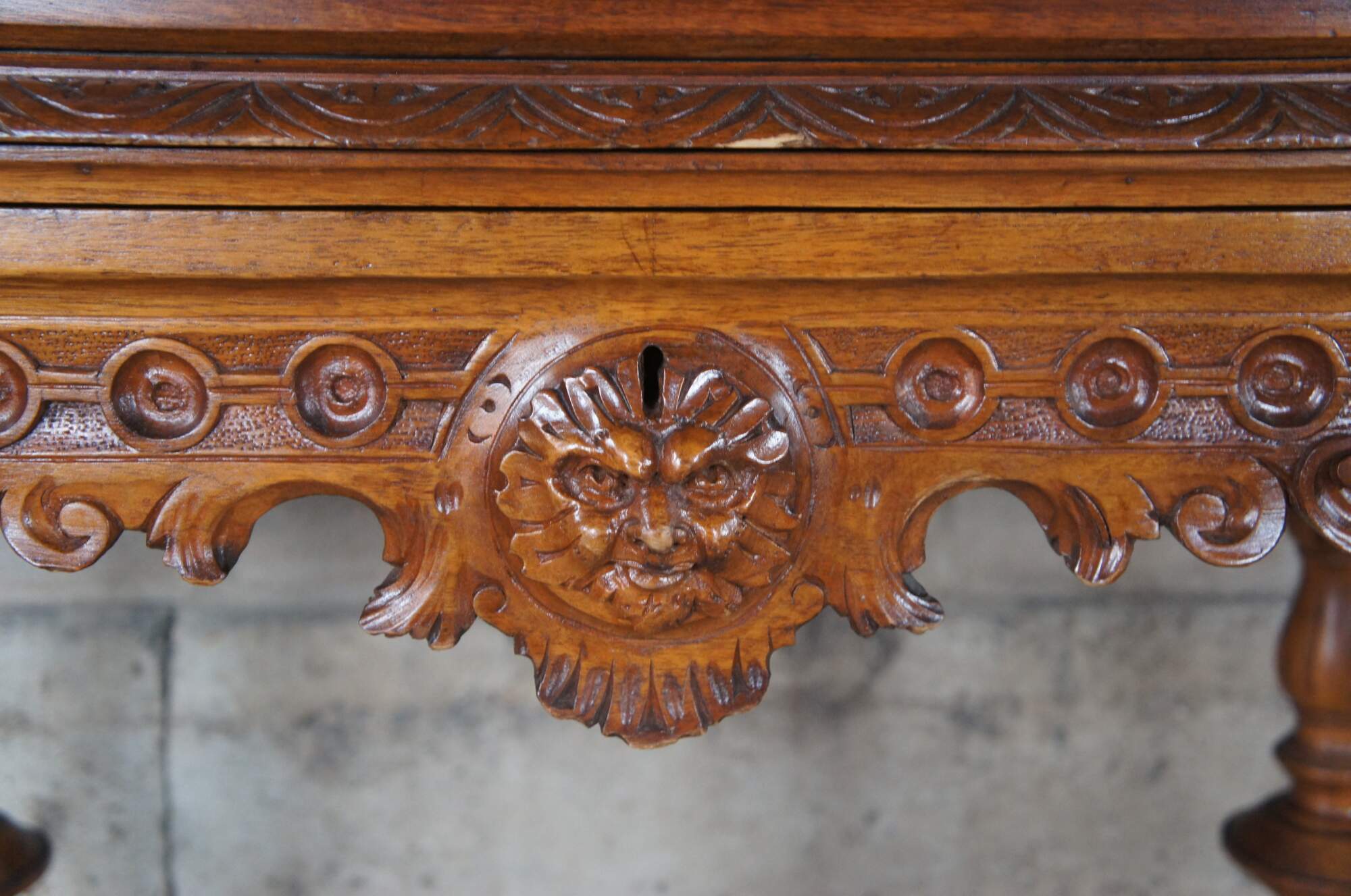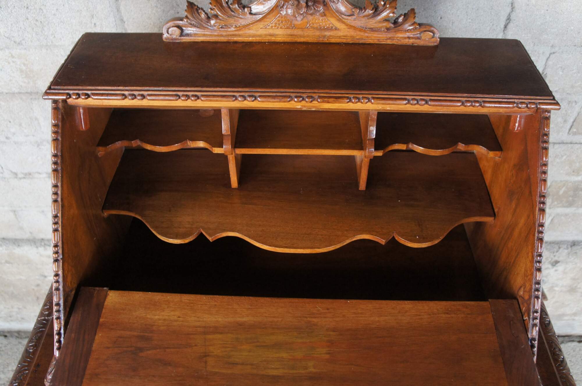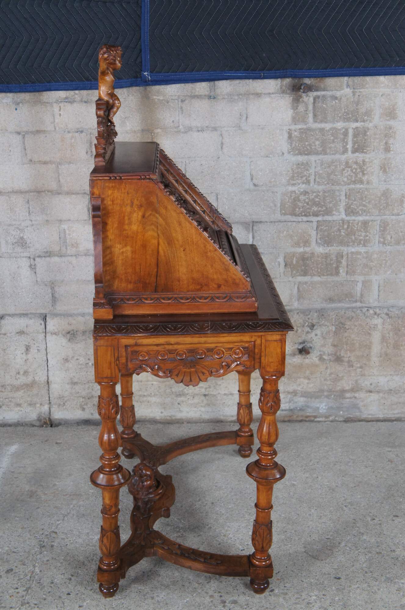 Antique Neo-Renaissance Revival writing desk. Made of walnut featuring Neoclassical styling with high relief figural carvings of cherubs / puttis, Northwind faces, and acanthus / floral designs. The desk features a drop front door with griffons and castle courtyard scene that opens to multiple cubbies and storage compartments with and additional pull out writing surface, supported by four turned legs connected by serpentine stretcher with cherub busts.