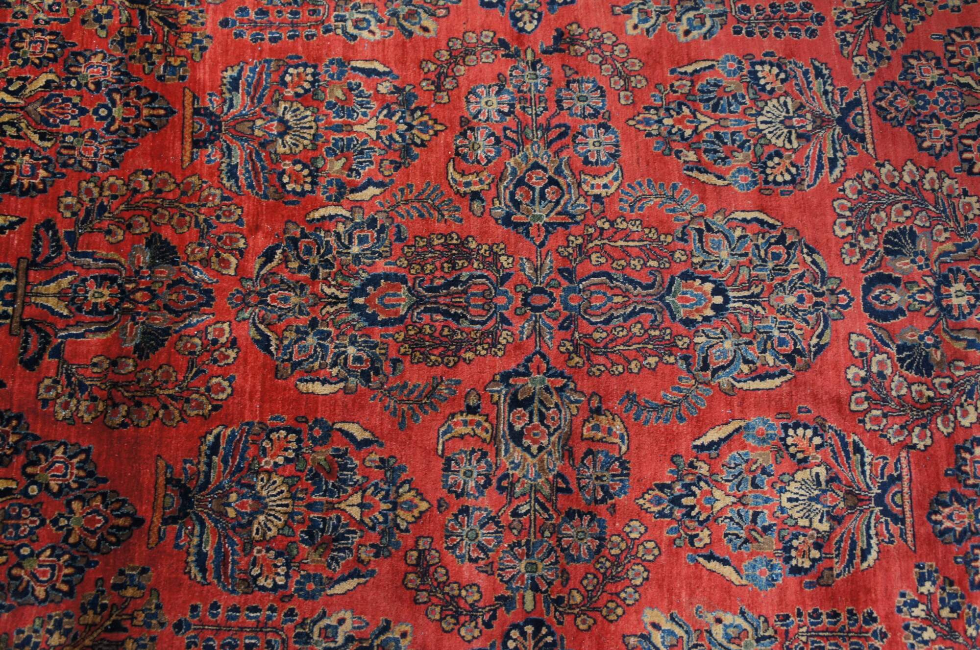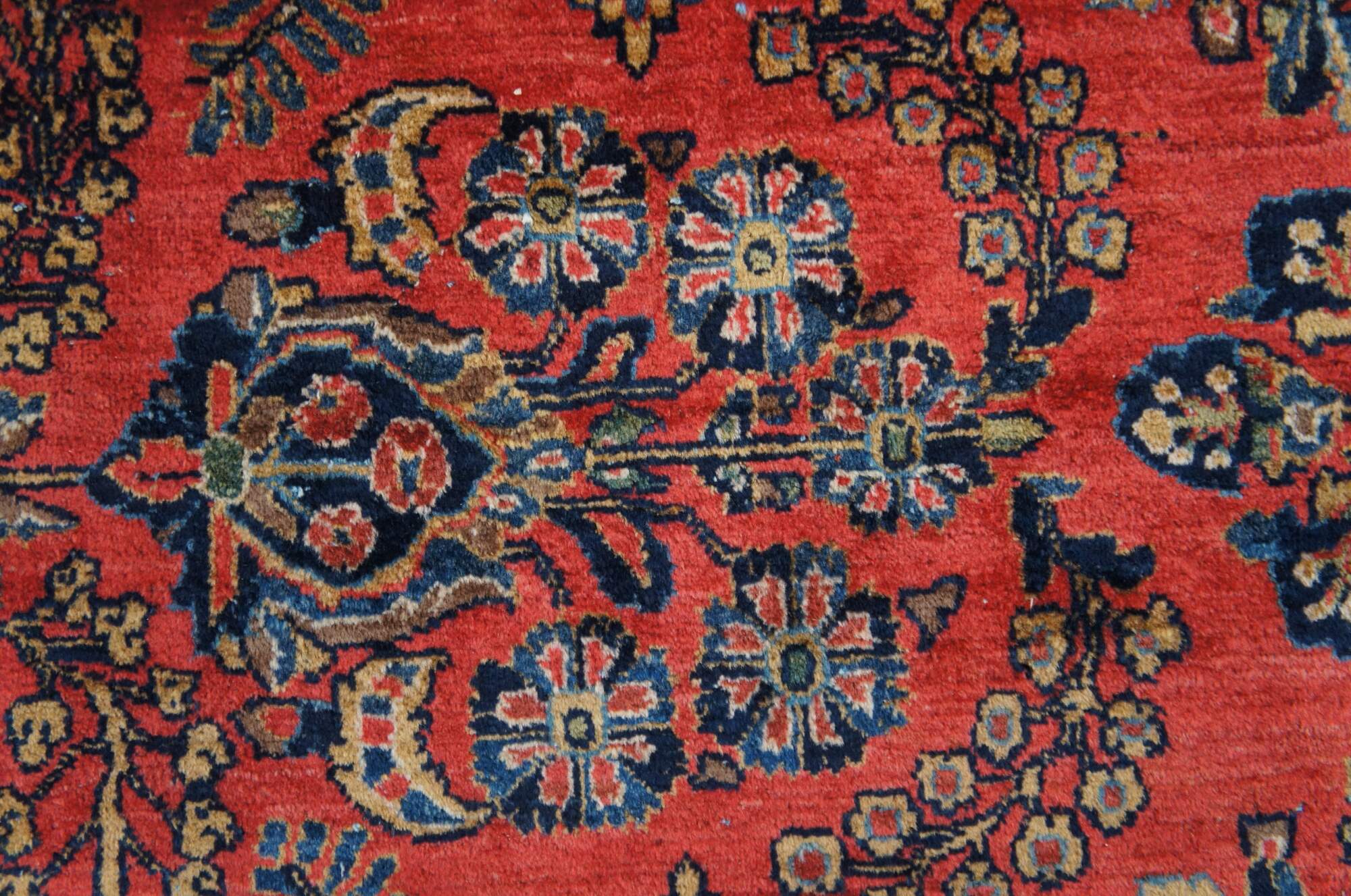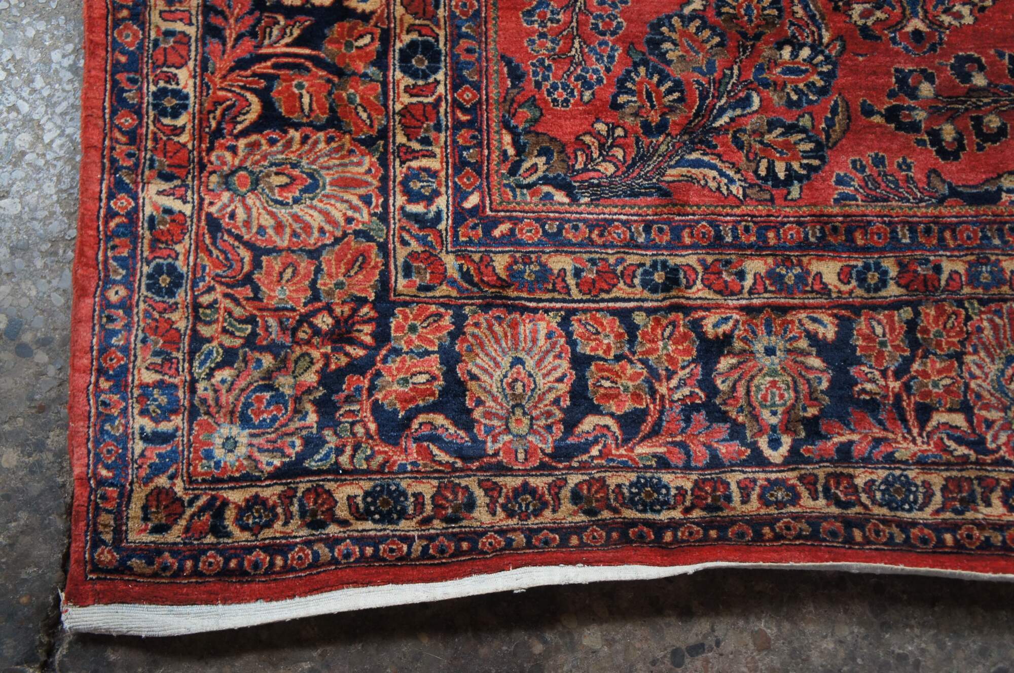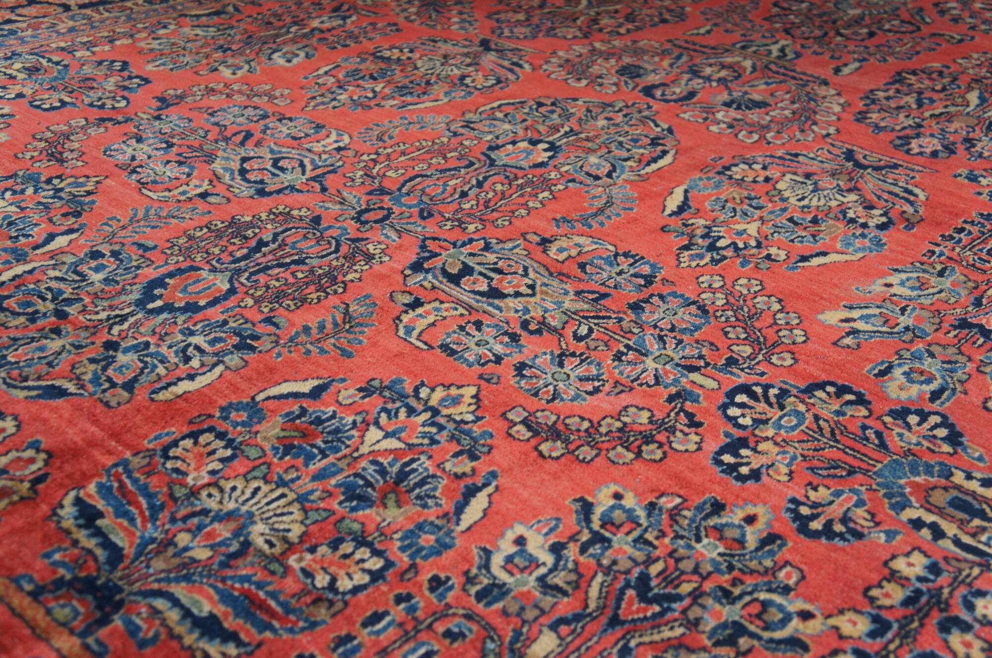 Large vintage Persian Sarouk area rug / carpet featuring a floral motif with red field accented with blues and tans.