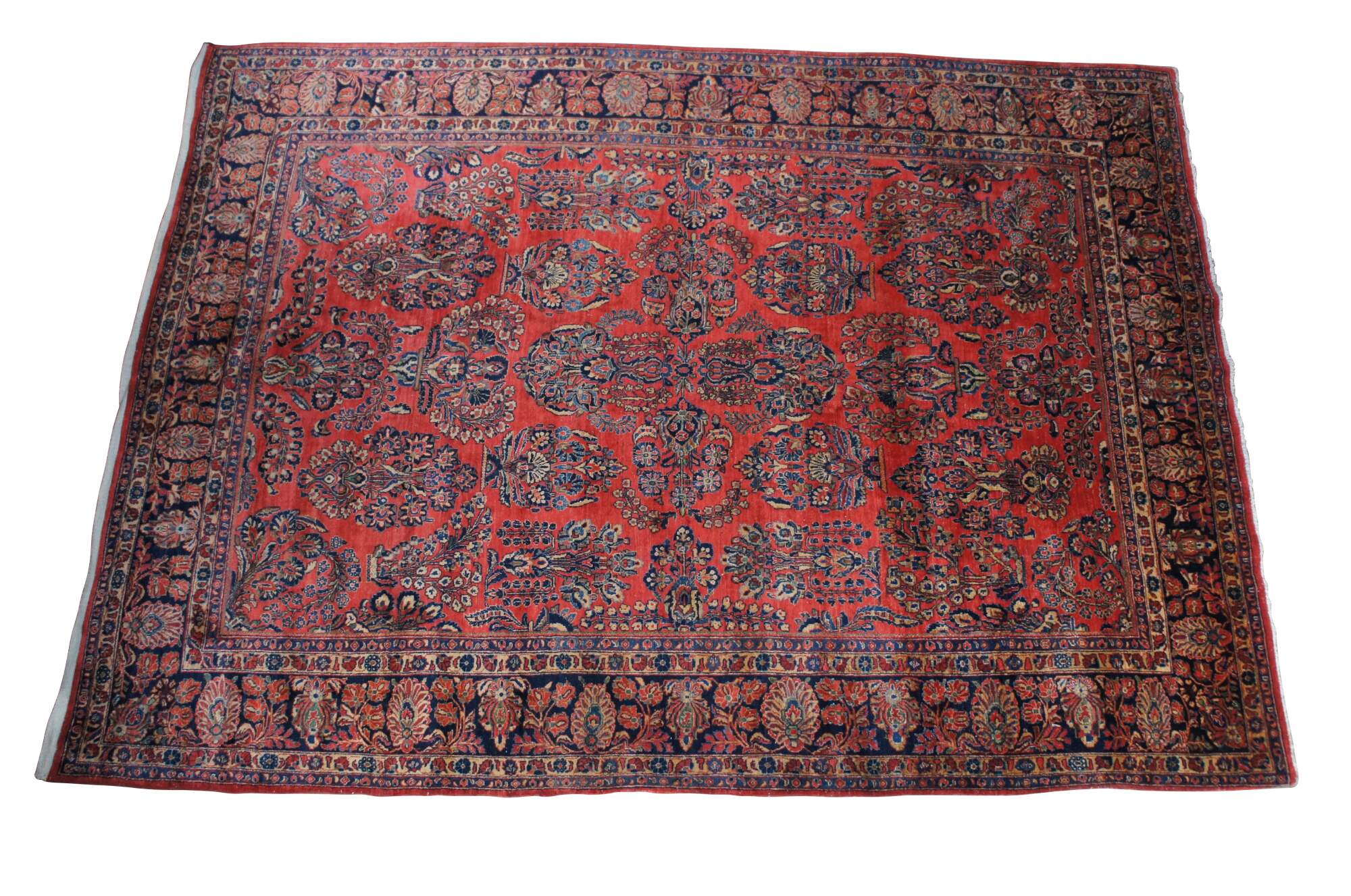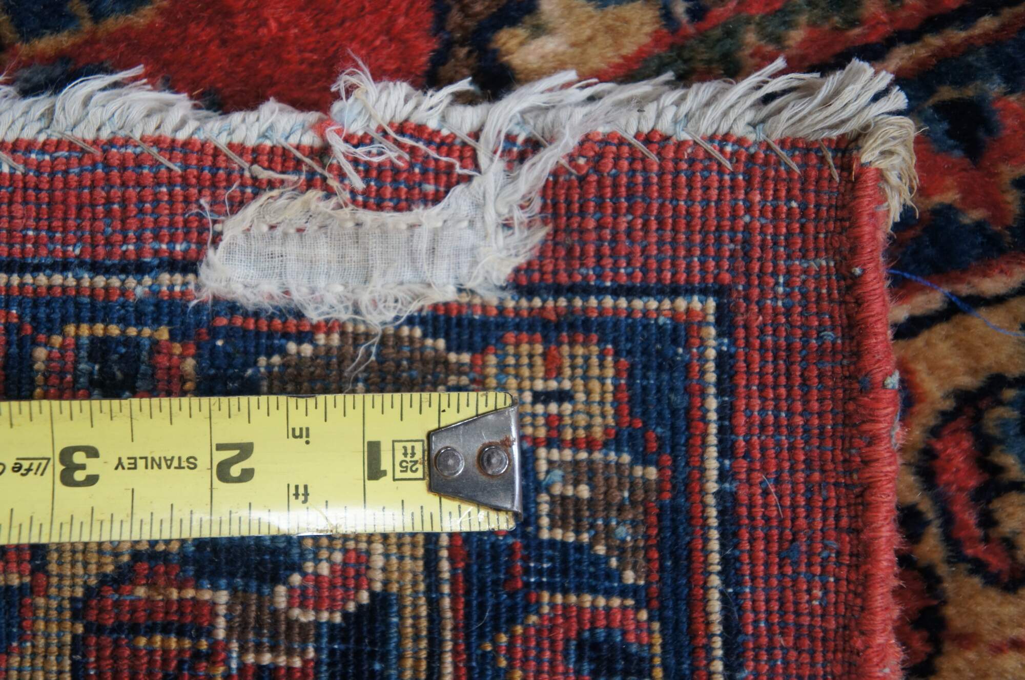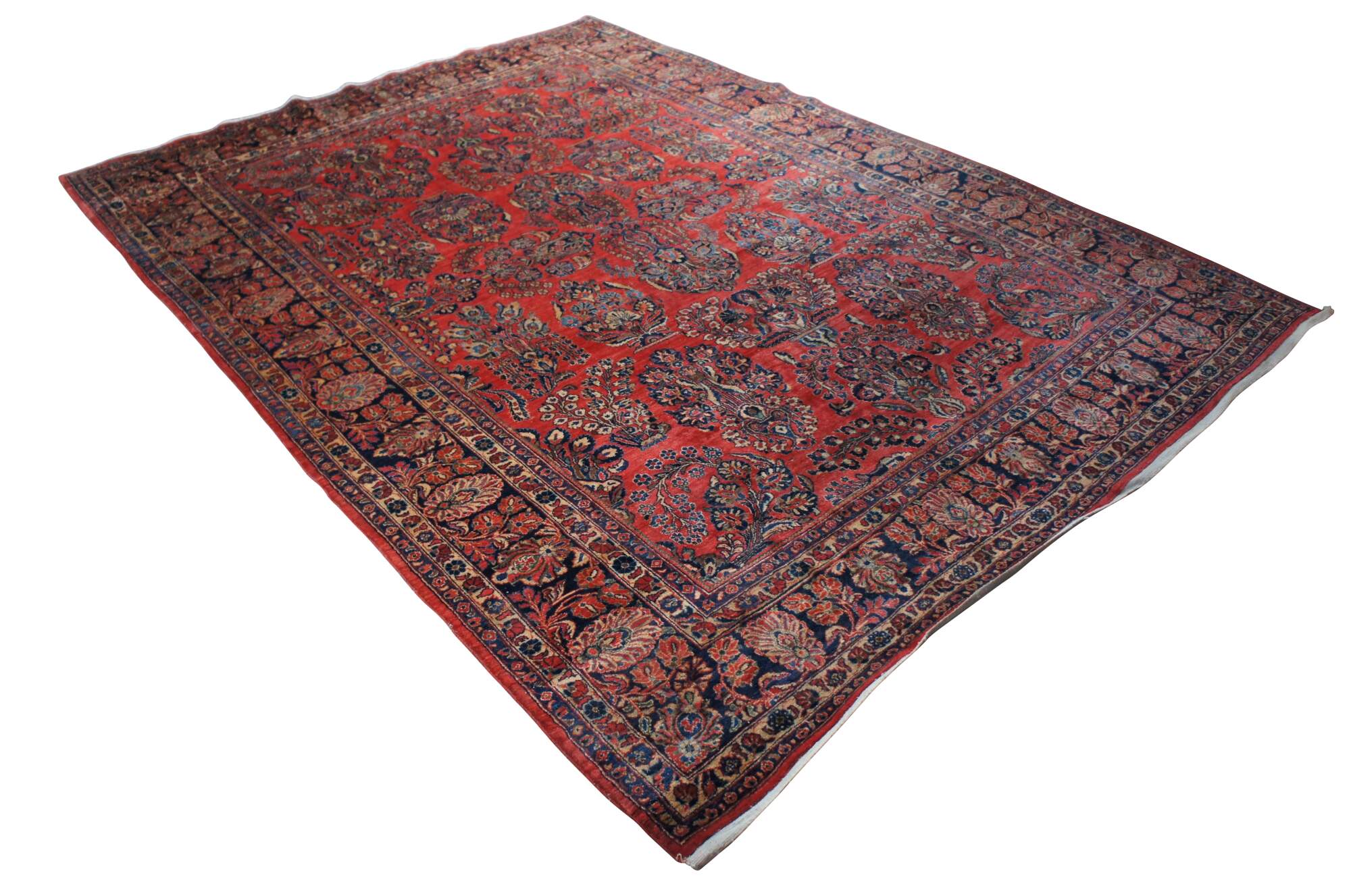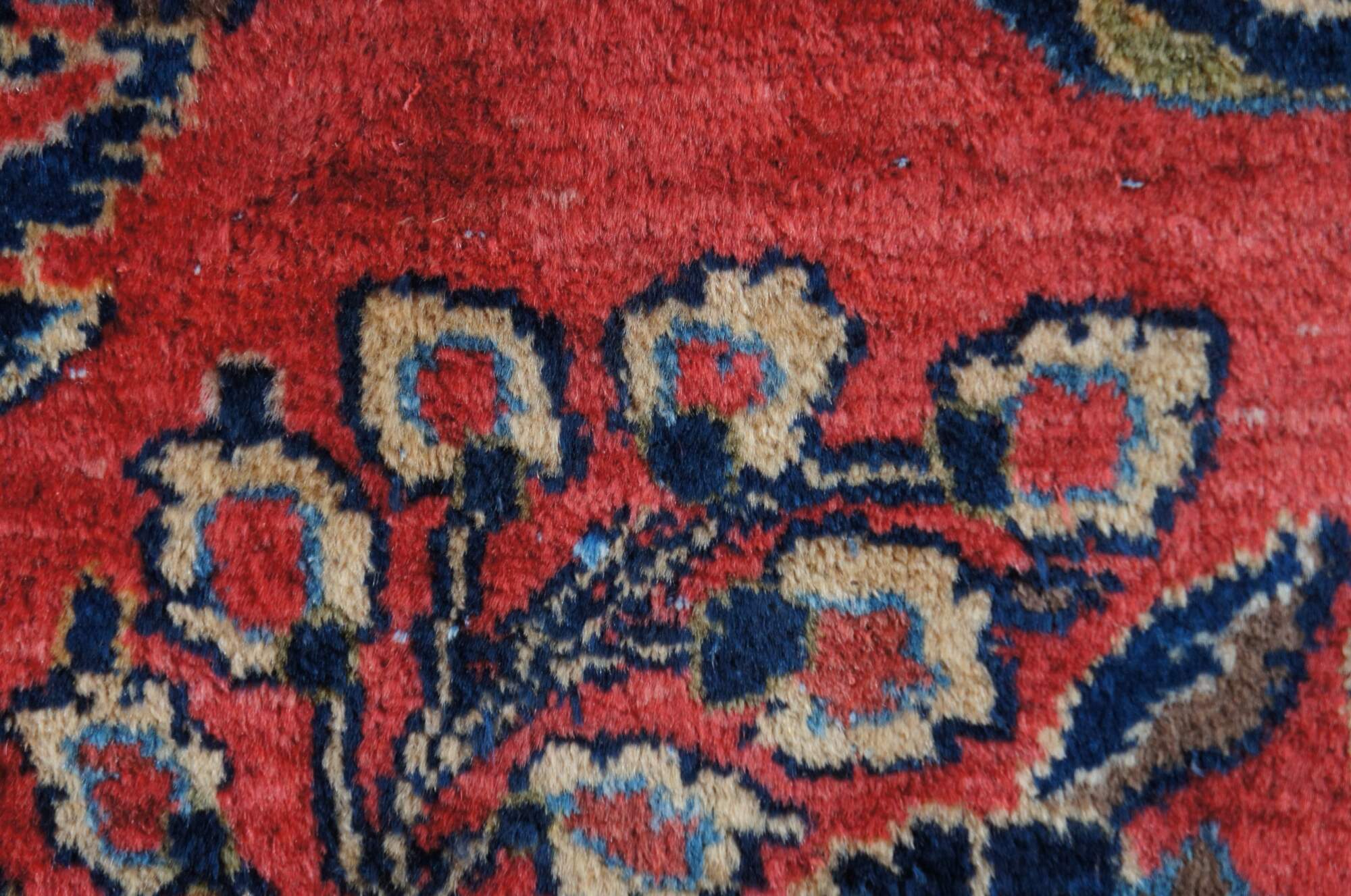 Large vintage Persian Sarouk area rug / carpet featuring a floral motif with red field accented with blues and tans.