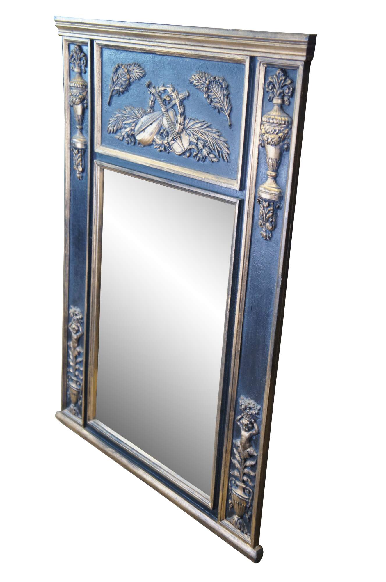 Late 20th Century Italian Neoclassical style trumeau wall mirror Finished in black with gold details. Features a harp and lute intertwined at the center within a wreath and neoclassical ribboning. This scene is flanked by trophy urns along the top of the stiles and jardinières near the base with cherubs poking out from the top holding baskets. Made in 1995, 5992 Trumeau