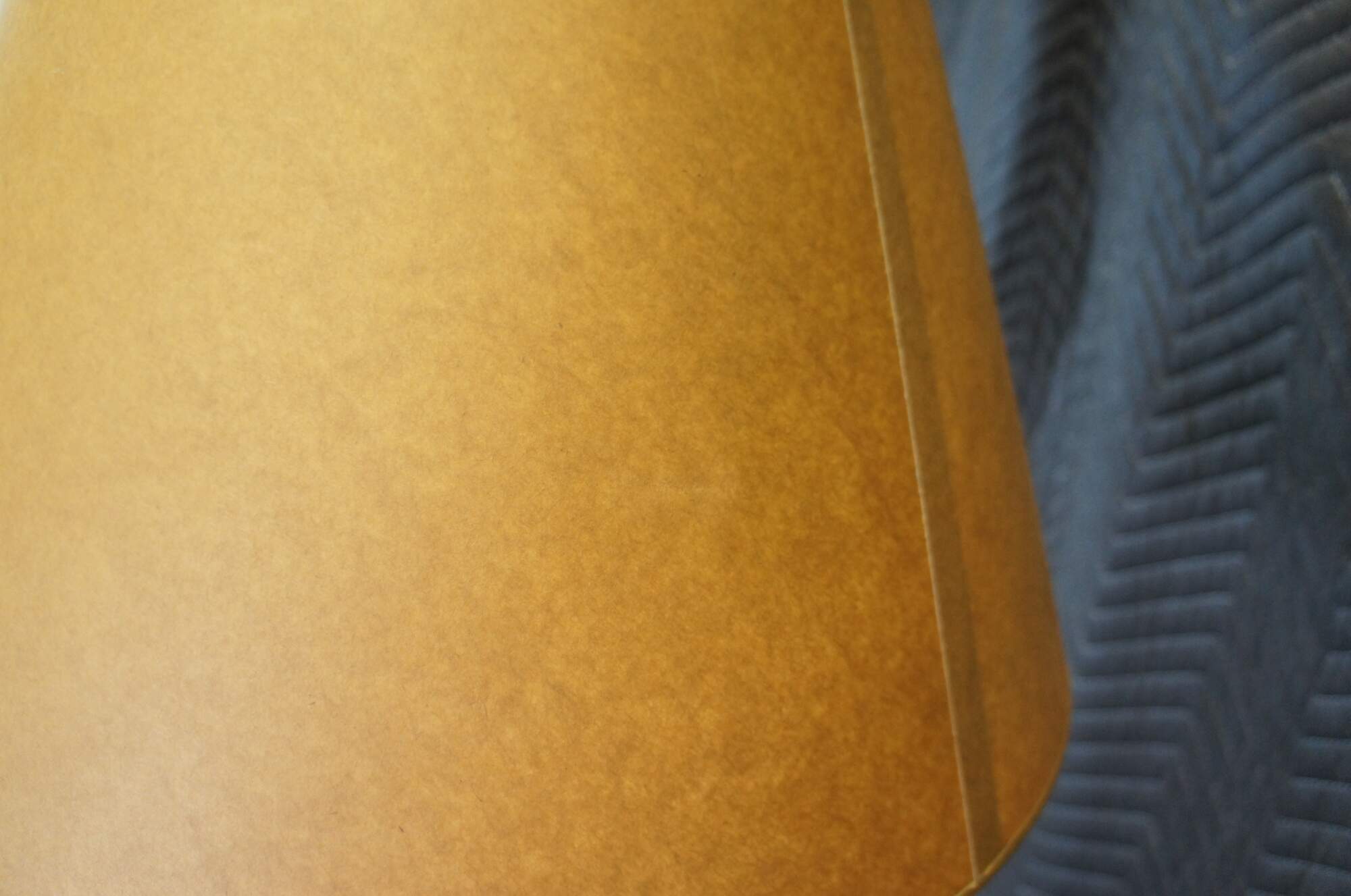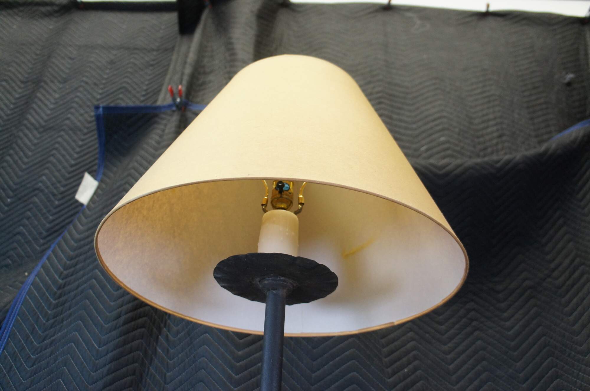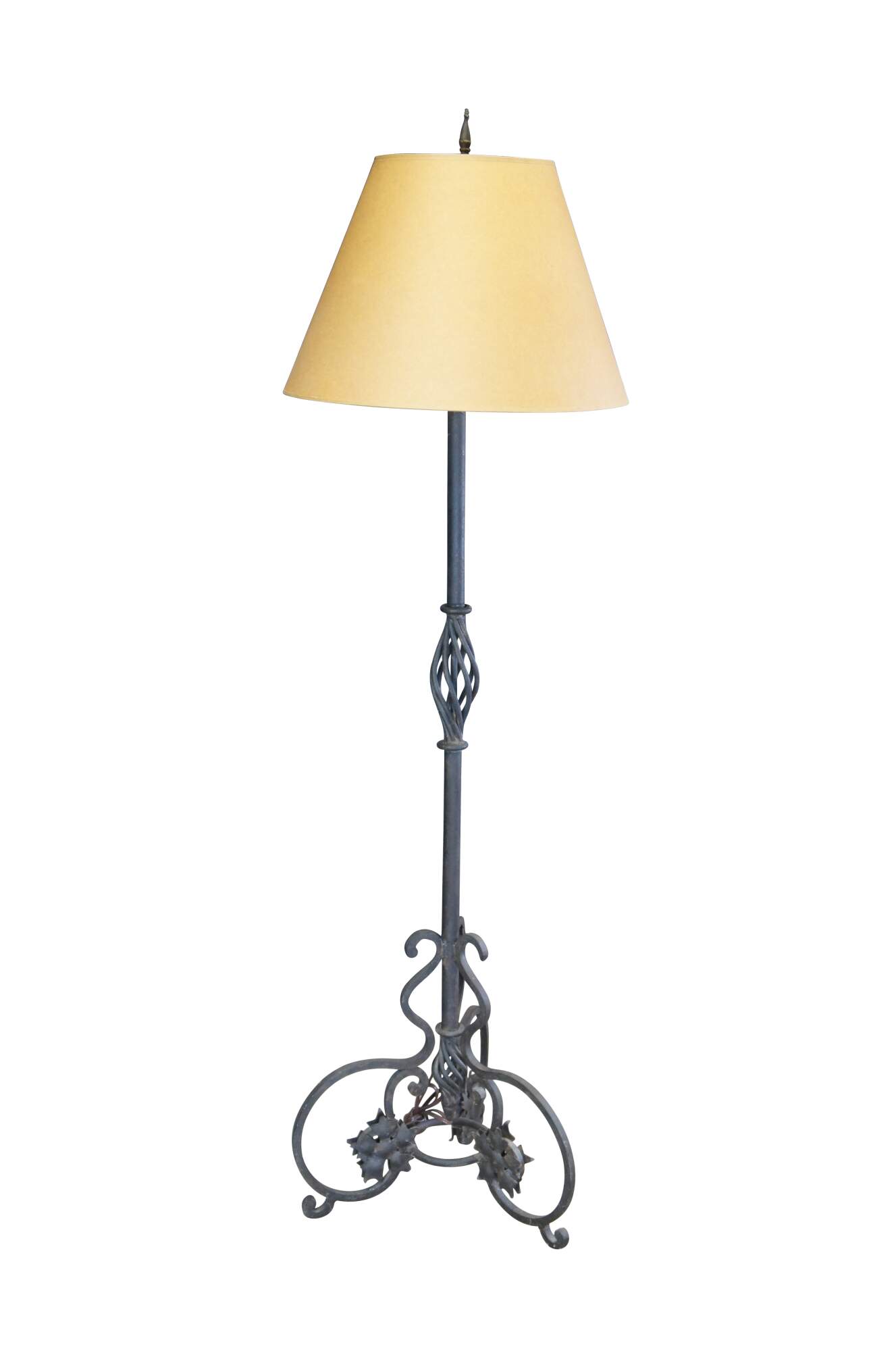 Late 20th Century Spanish Mediterranean ornate wrought iron floor lamp, will candlestick topper and drip pan. Features a tripod base with scrolled accents and open twisted column at the center. The base is accented by 5 petal florets. Includes shade and spire finial.