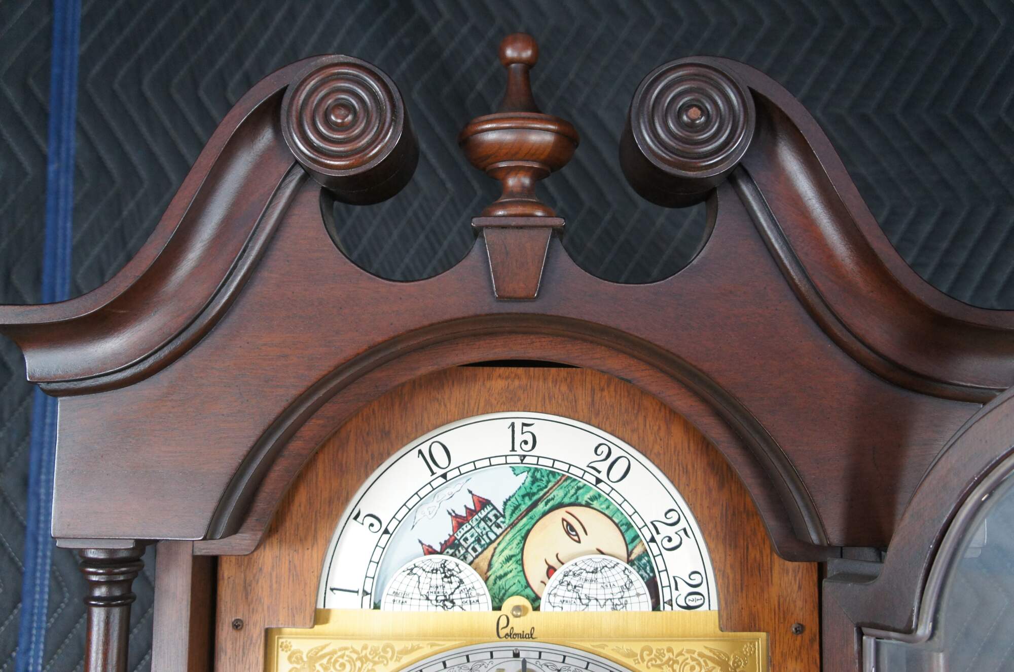 Vintage 1970 weight driven Grandfather clock by Colonial MFG Company out of Zeeland, Michigan. Features a tall case made from mahogany with open scrolled pediment, columns and "v" grain along the base. Includes a metal face with roman numeral dial and lithograph sun/ moon dial.