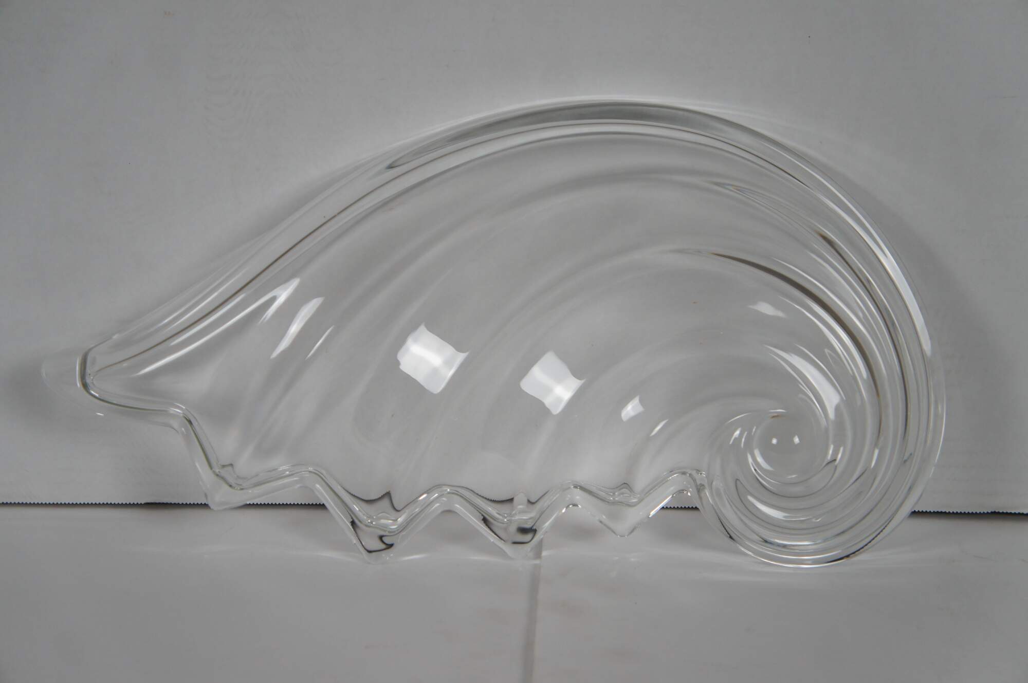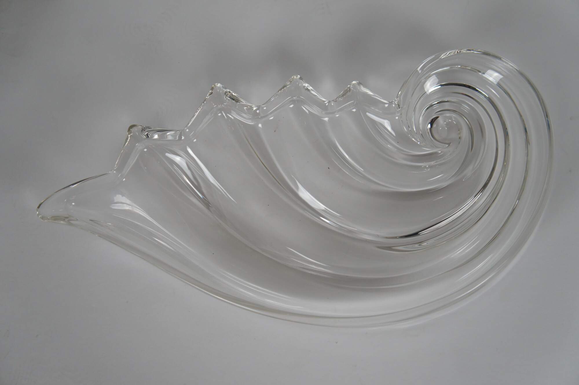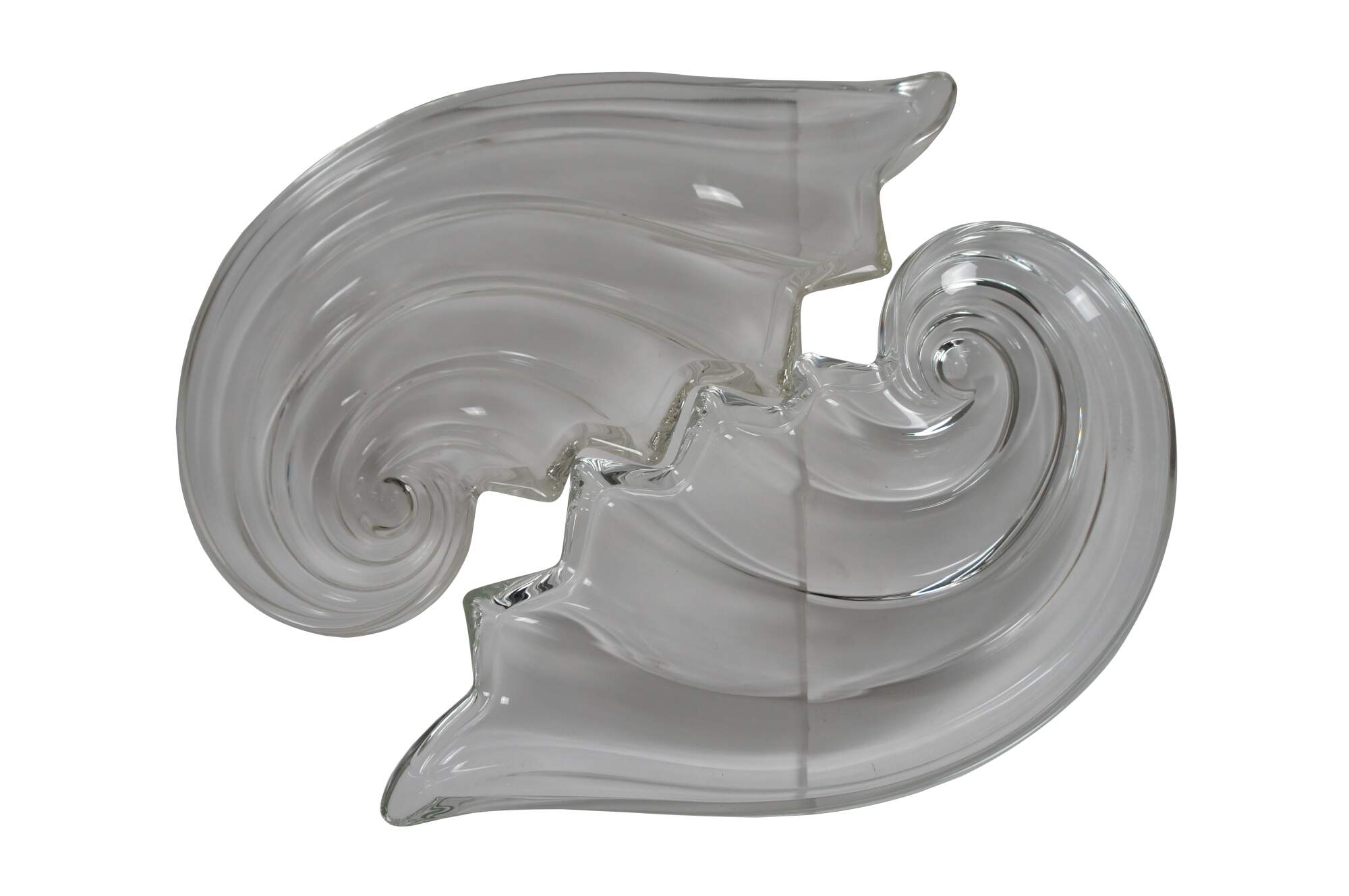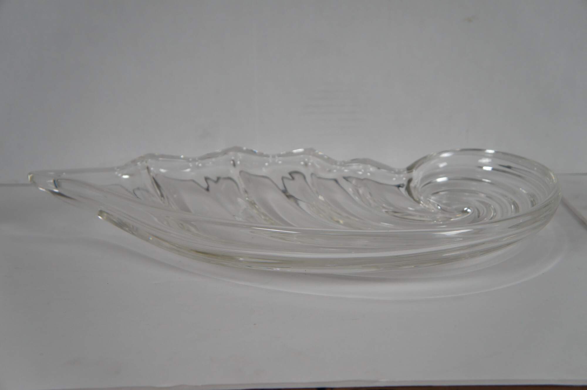 Pair of vintage circa 1970's Mikasa Clearwater crystal hostess platters / trays in the shape of a rolling wave or nautilus spiral sea shell.