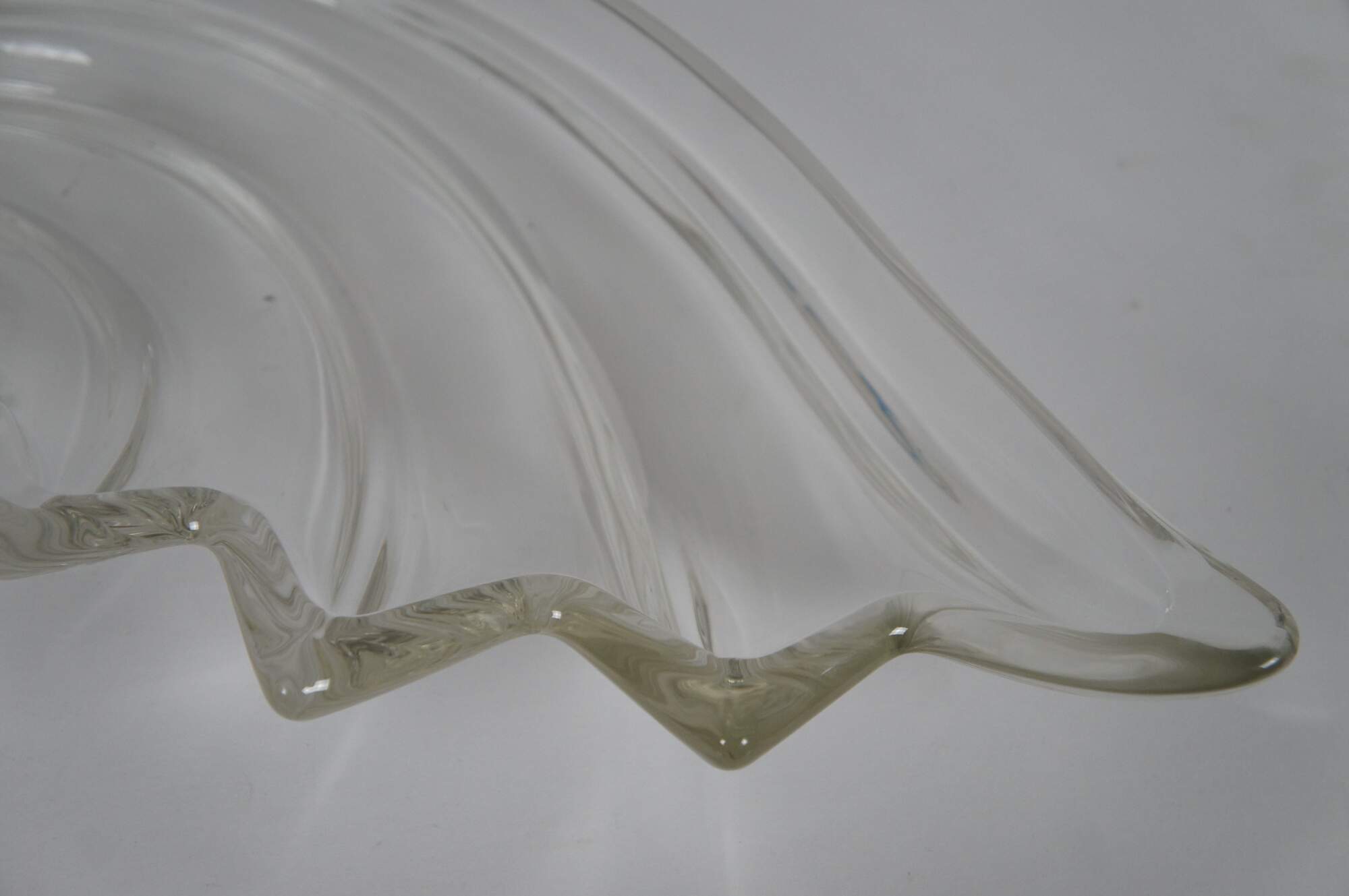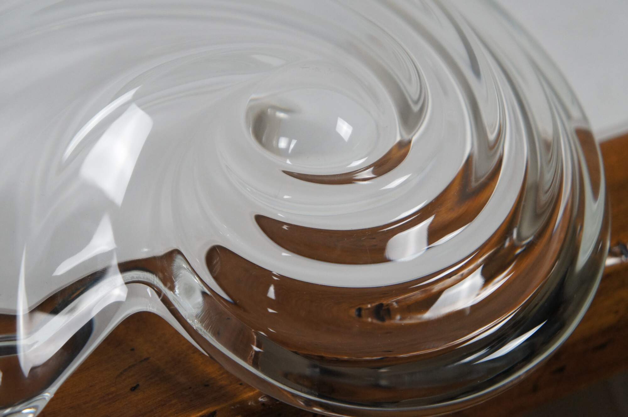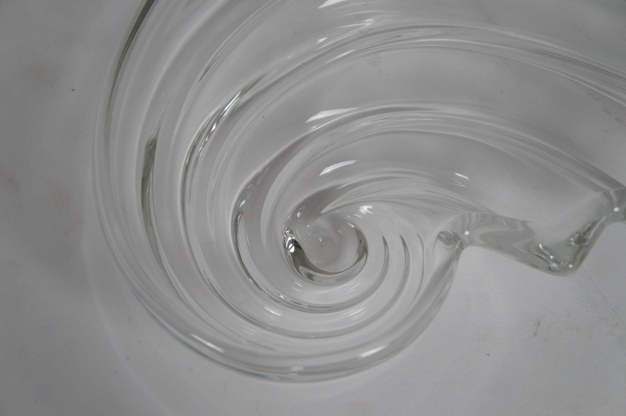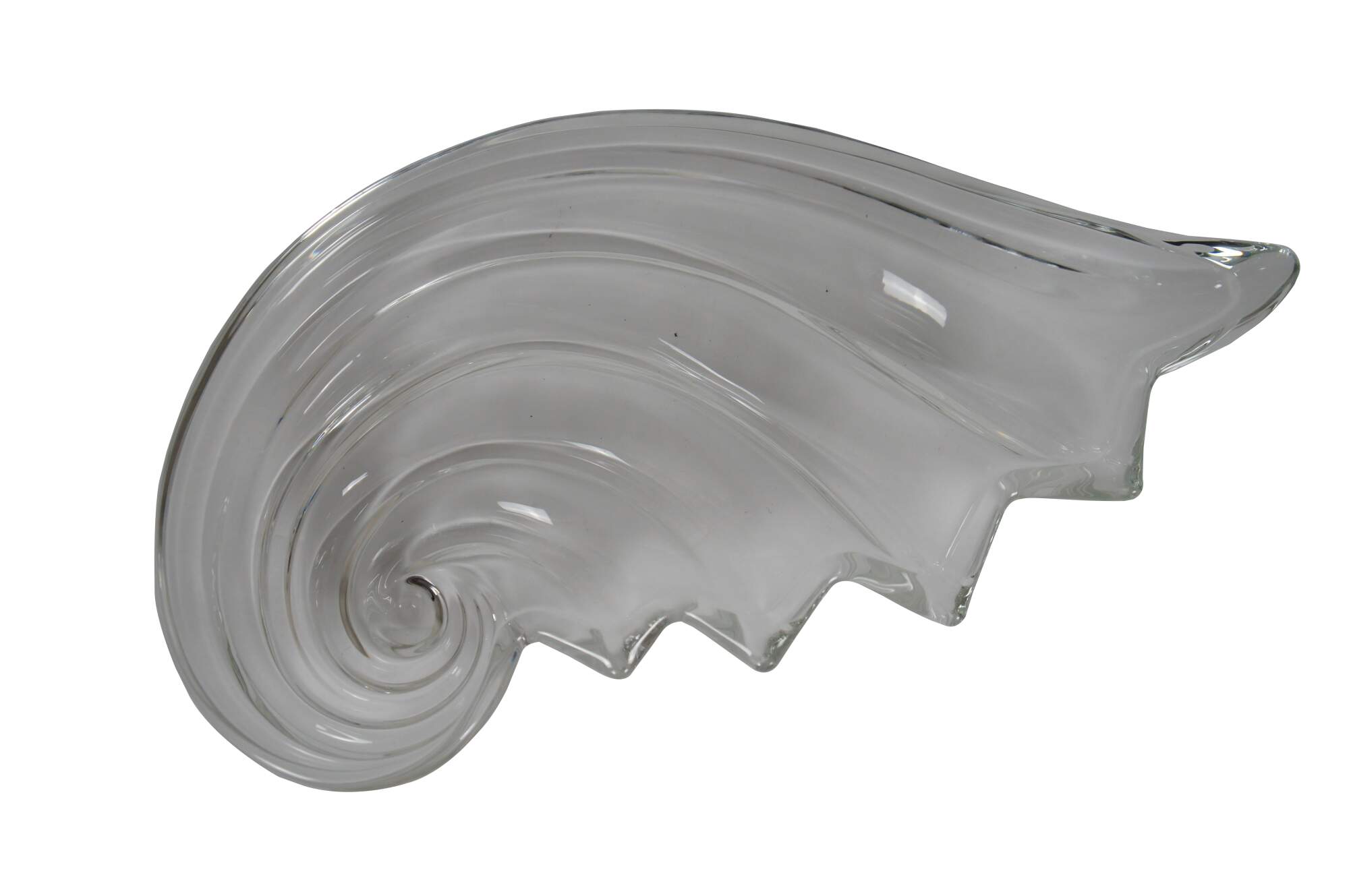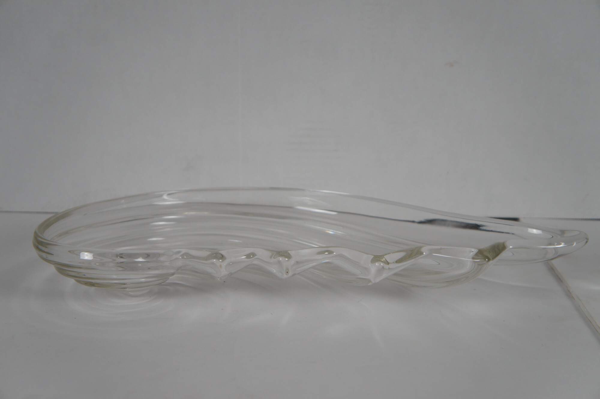 Pair of vintage circa 1970's Mikasa Clearwater crystal hostess platters / trays in the shape of a rolling wave or nautilus spiral sea shell.