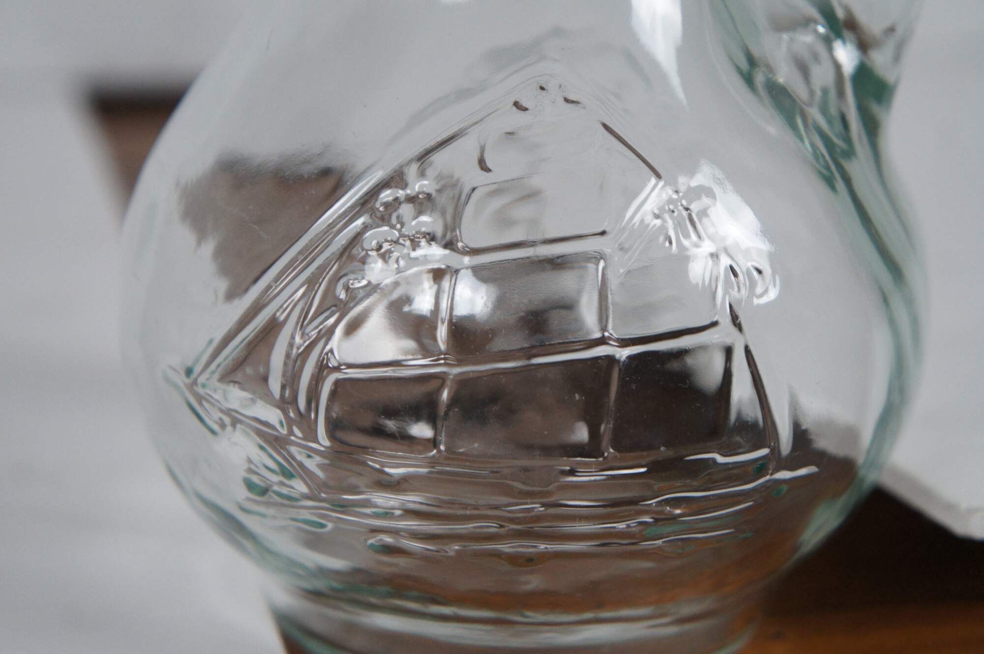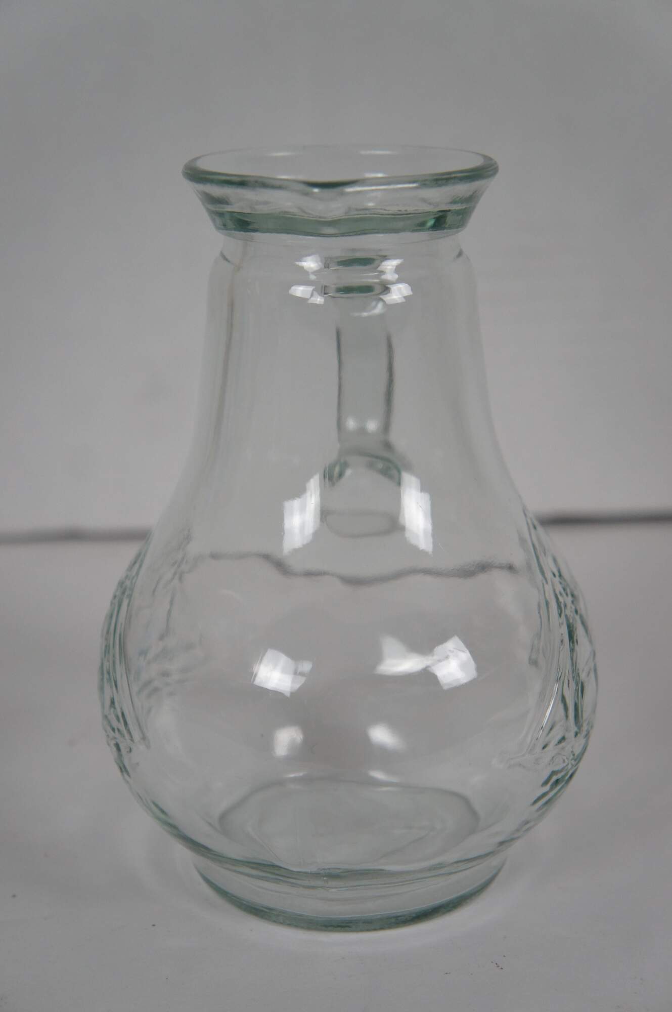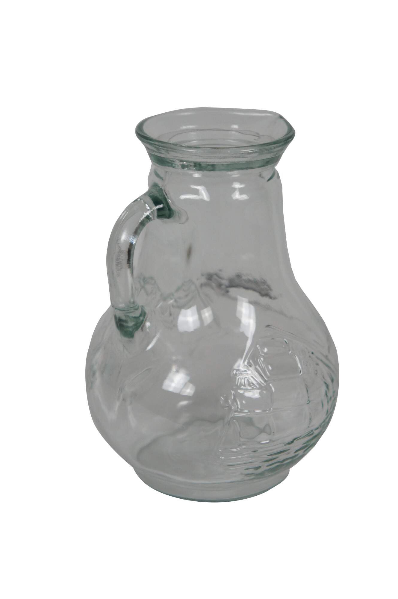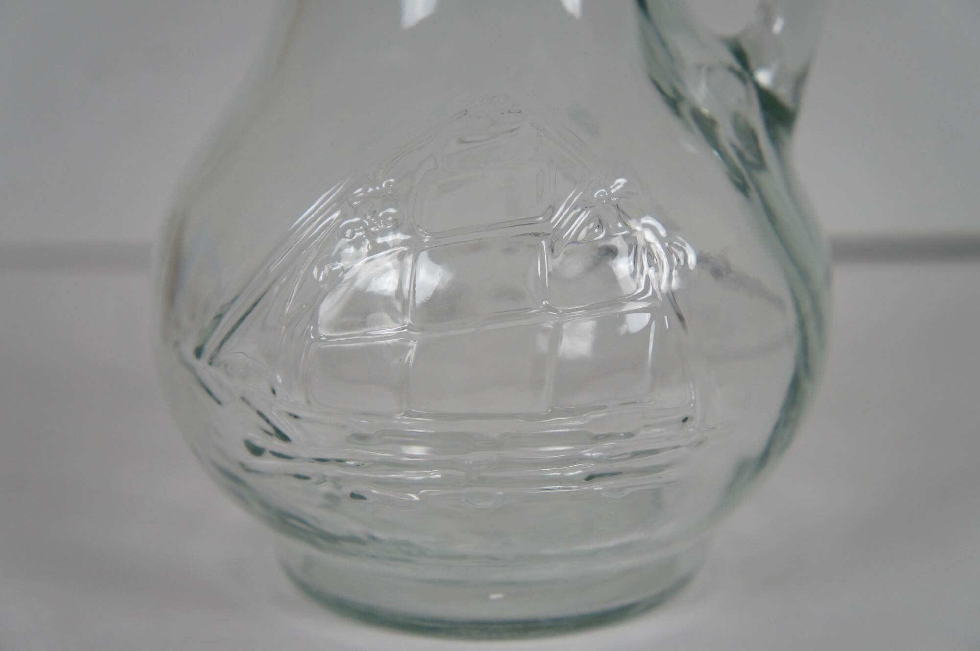 Vintage pressed clear glass syrup / cream pitcher featuring a rounded body and embossed sailing ship.