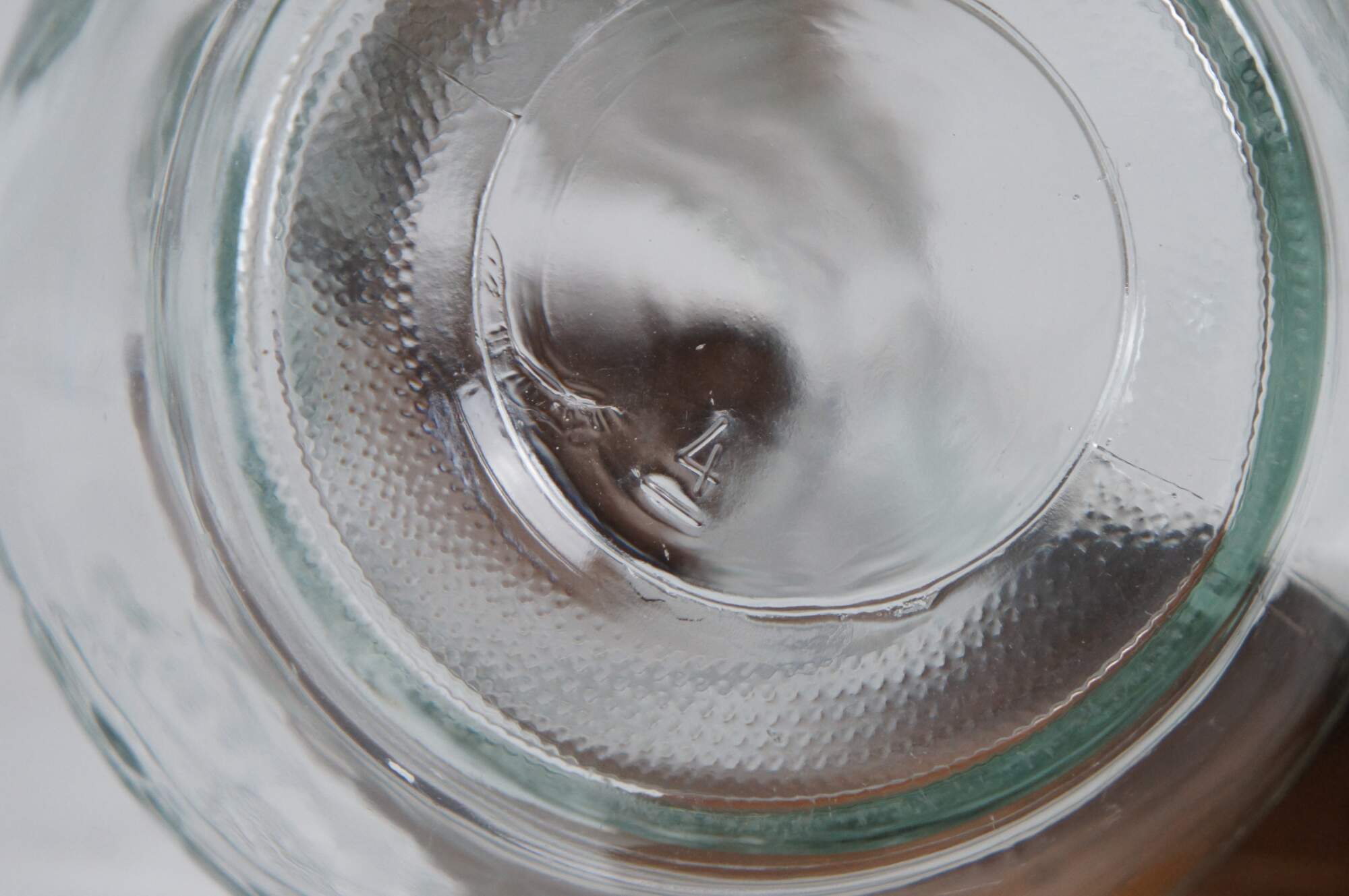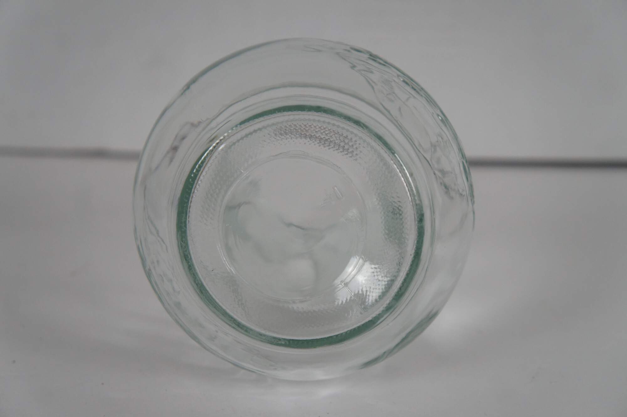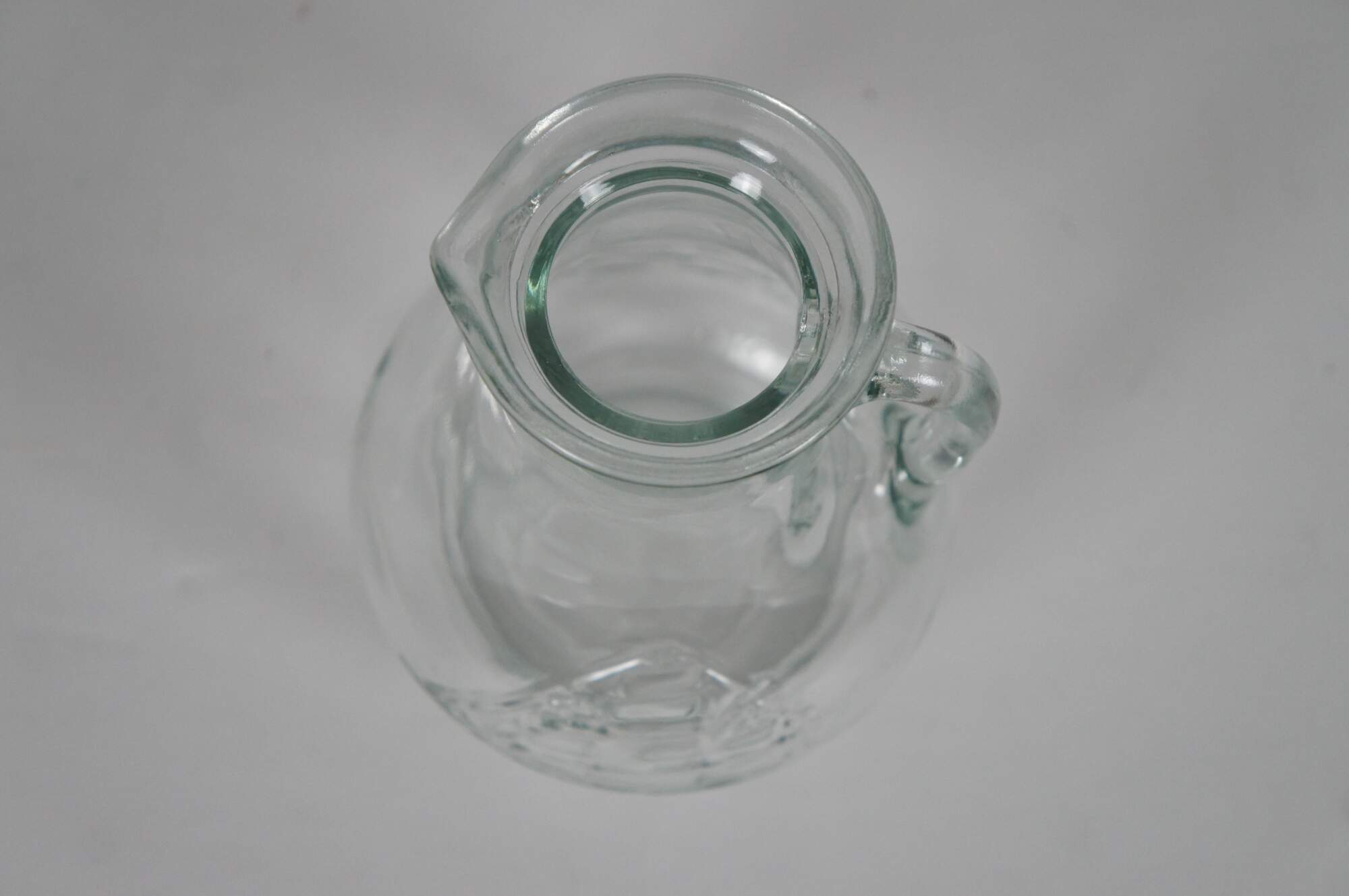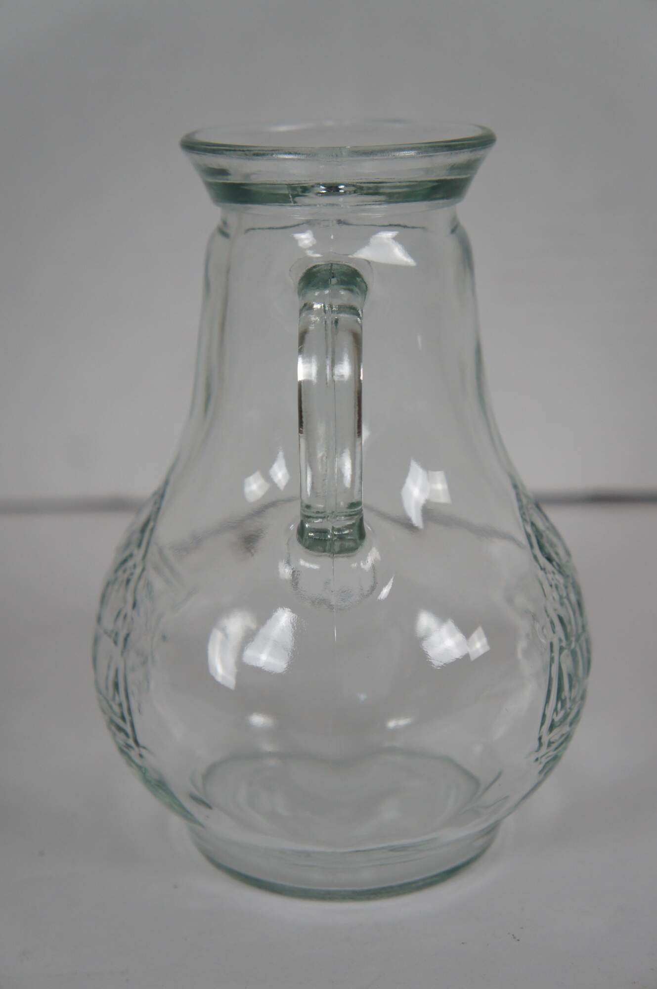 Vintage pressed clear glass syrup / cream pitcher featuring a rounded body and embossed sailing ship.