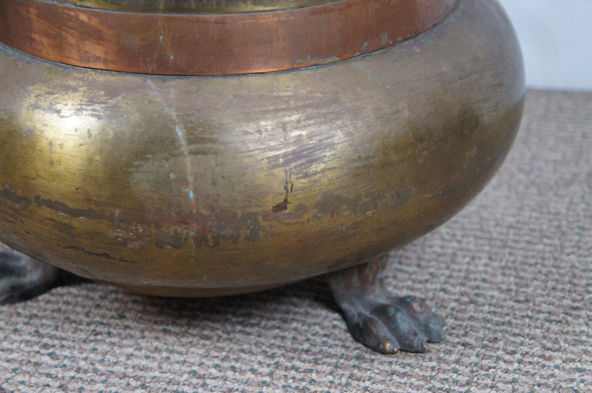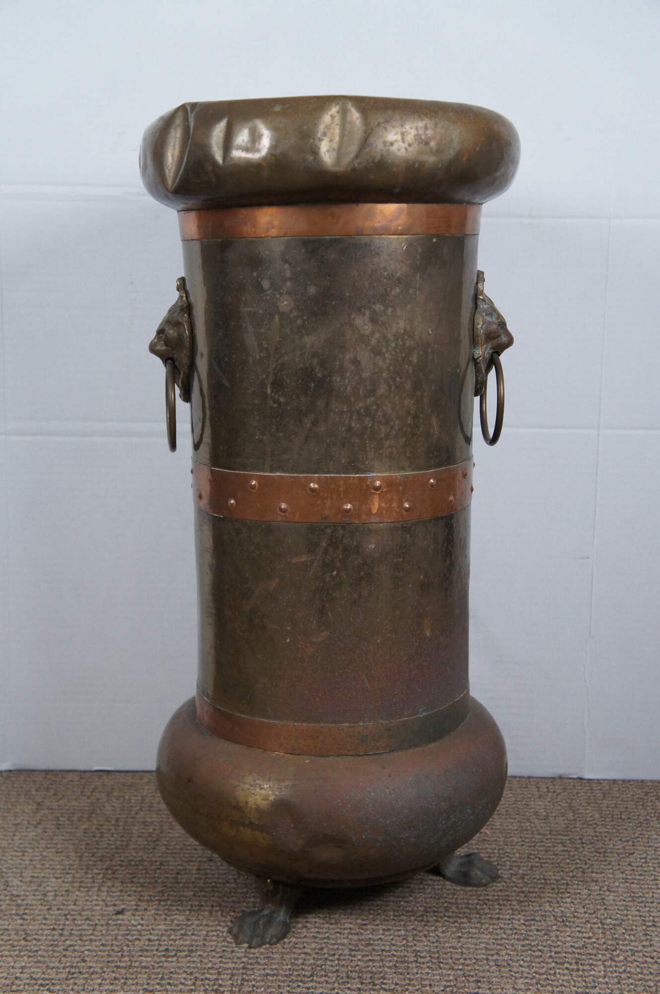 Antique arts and crafts Russian made floor vase / umbrella / cane stand, crafted of brass with a lobed base and rim, copper bands, lion's head door knocker style handles and claw / paw feet. Marked in Cyrillic on base.