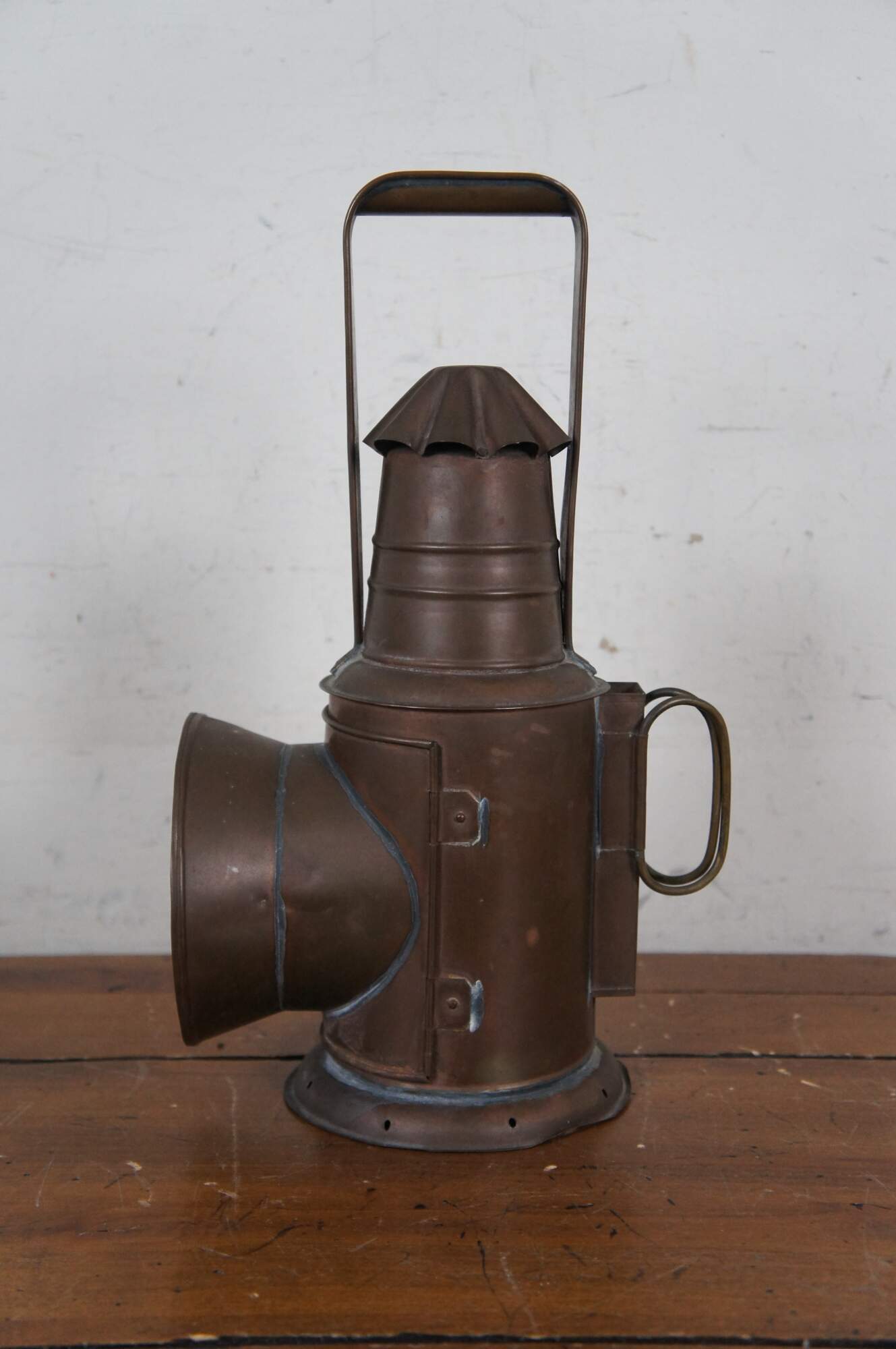 Antique copper police/ railroad / boat signal lantern / hand lamp. Features cylindrical body style, fluted cone shaped chimney top, and rear handles of a typical dark lantern but no internal shutter for hiding the light. Fixed rectangular bail handle on top. Thick ridged bulls eye glass lens. Front with lens opens via wire latch. Removable oil reservoir and wick. Attributed to Nippon Sento Co, LTD of Tokyo Japan.