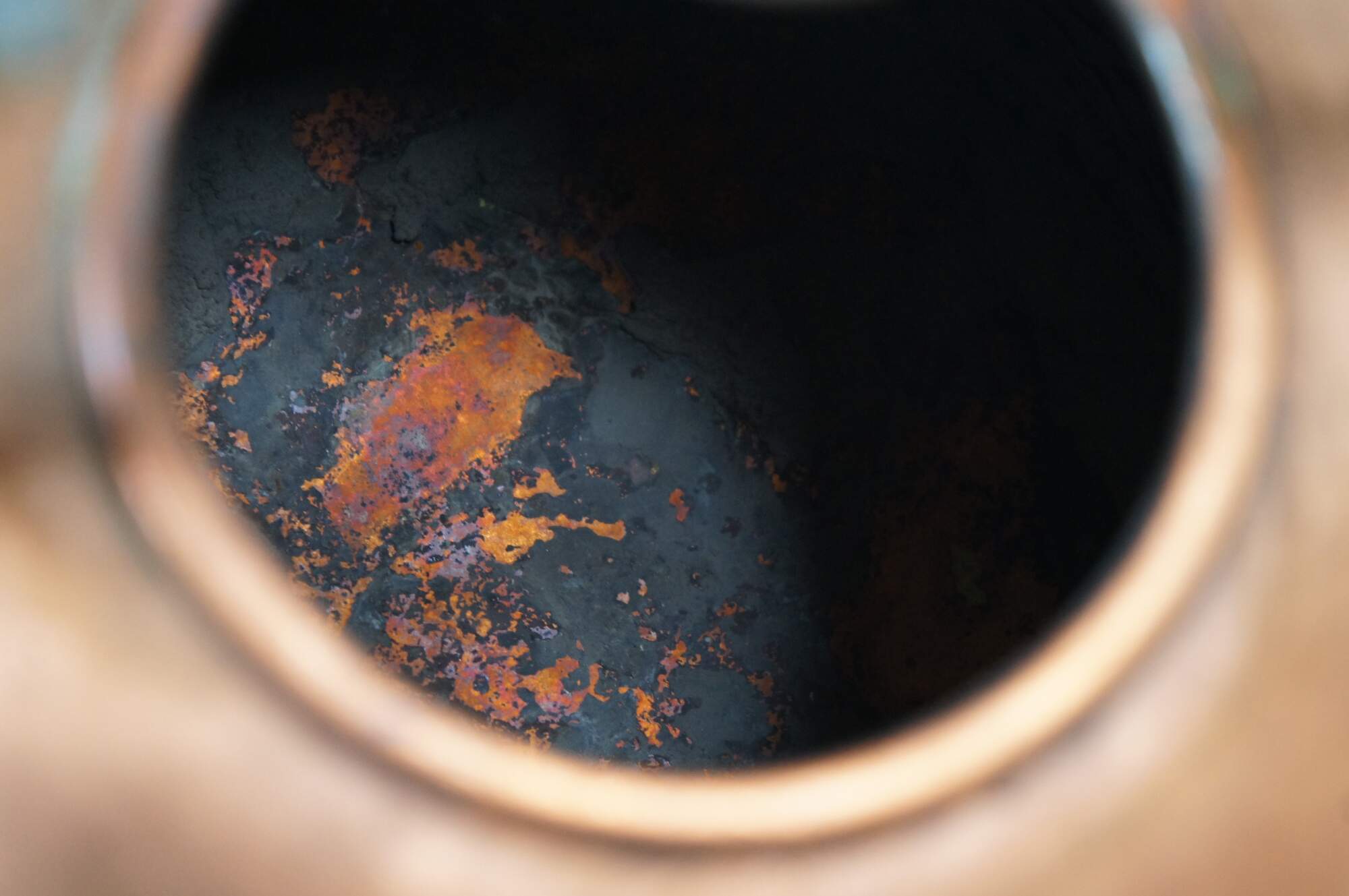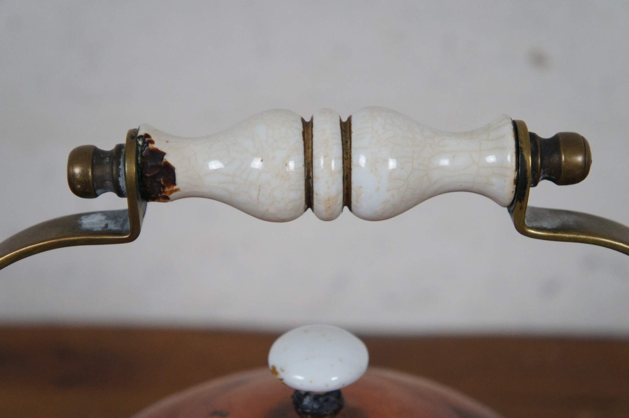 Fair Condition - Some tarnish/spots/oxidation; thick residue on interior; crazing/discoloration to porcelain; dents to base