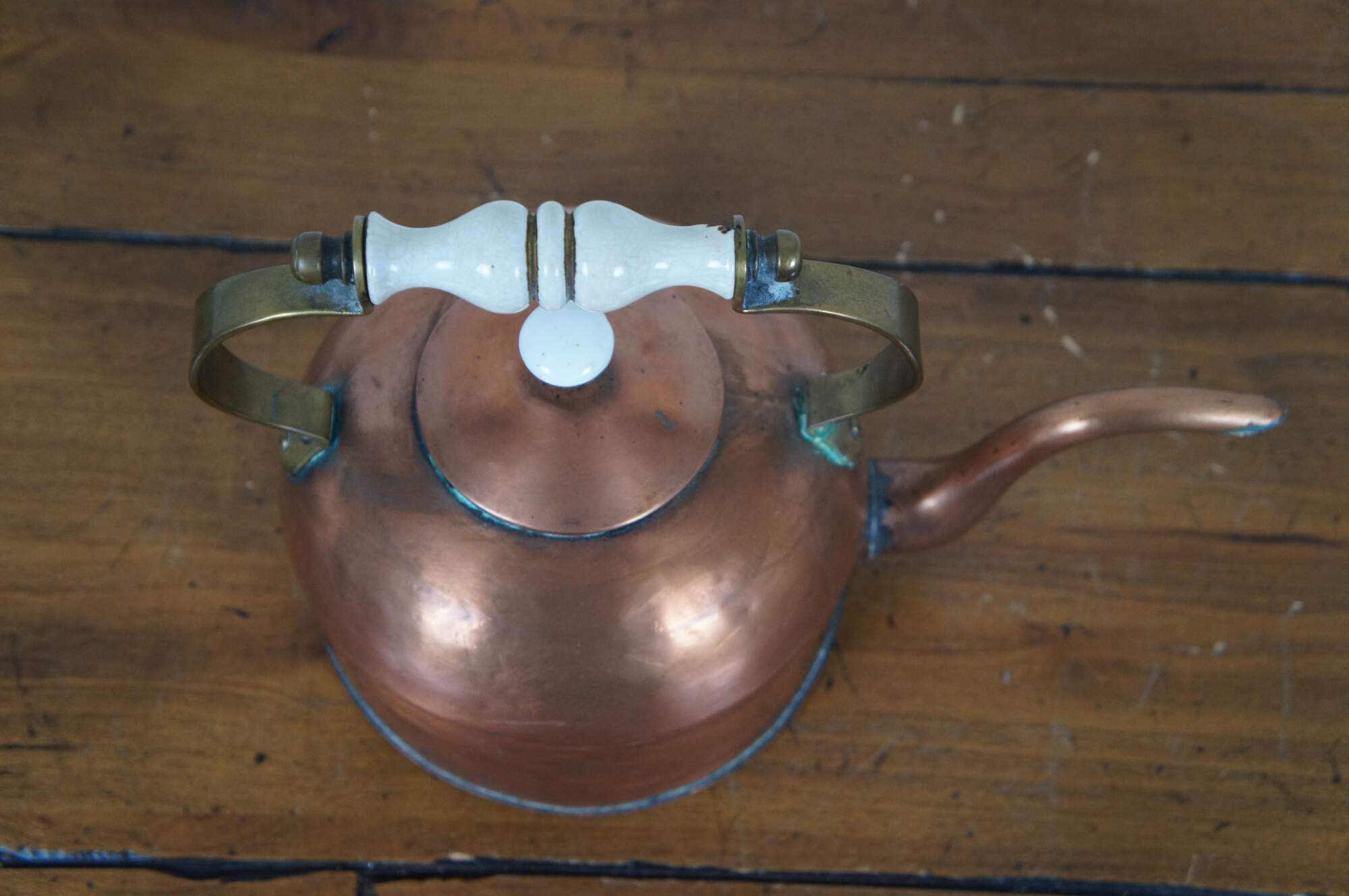 Late 18th century George III copper tea / water / coffee kettle with right angle gooseneck / bird spout, fixed brass handle with turned ceramic / porcelain grip and mushroom shaped porcelain finial on the lid.