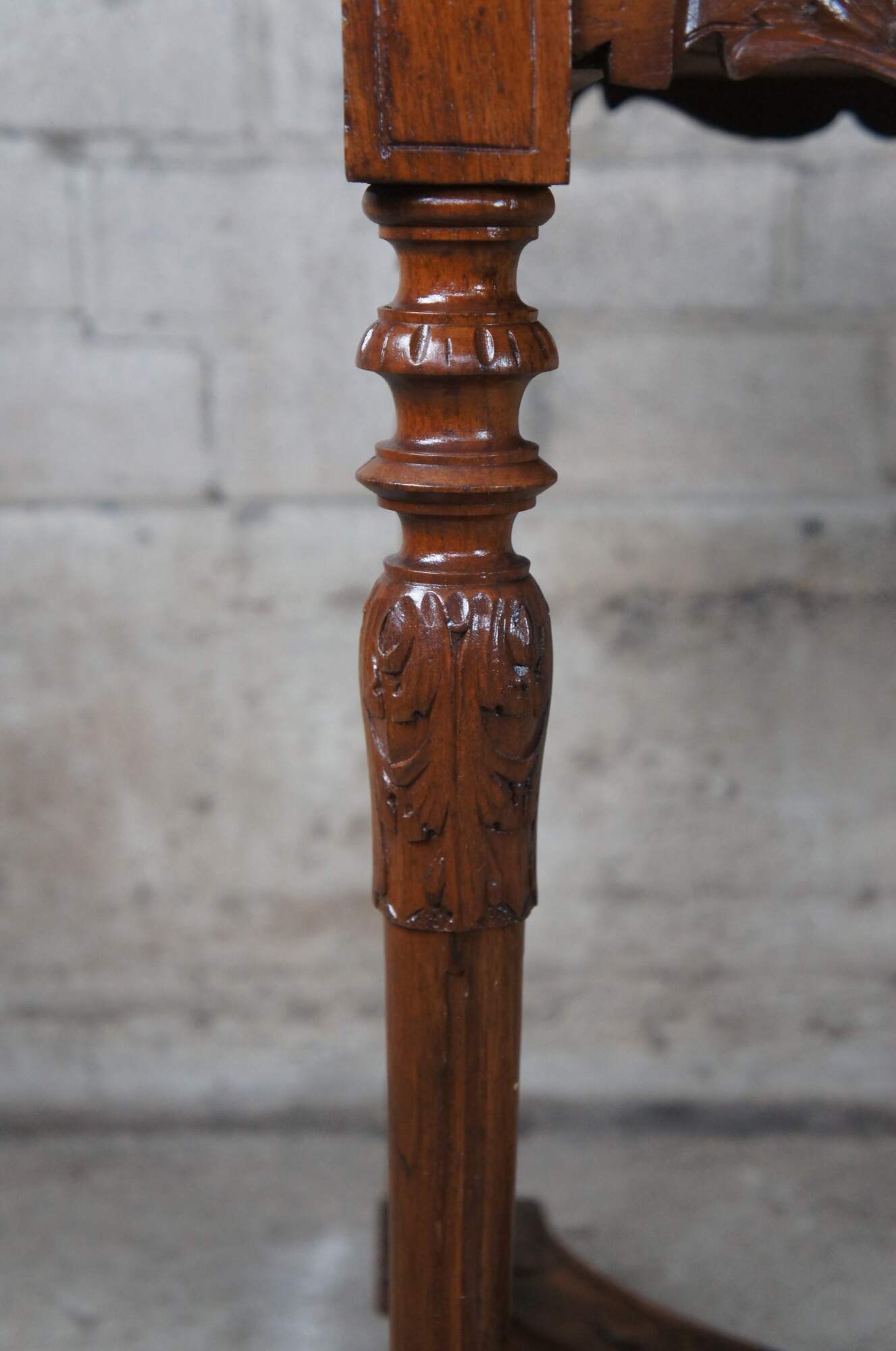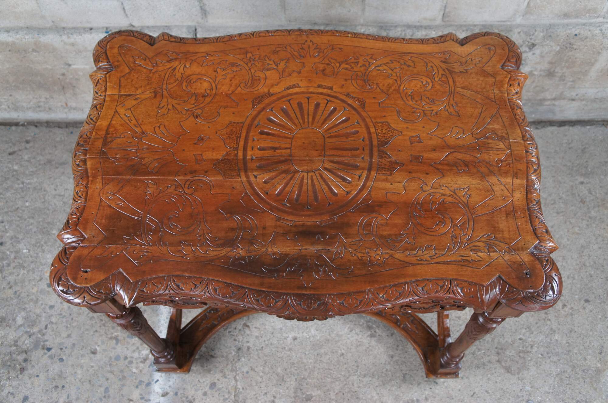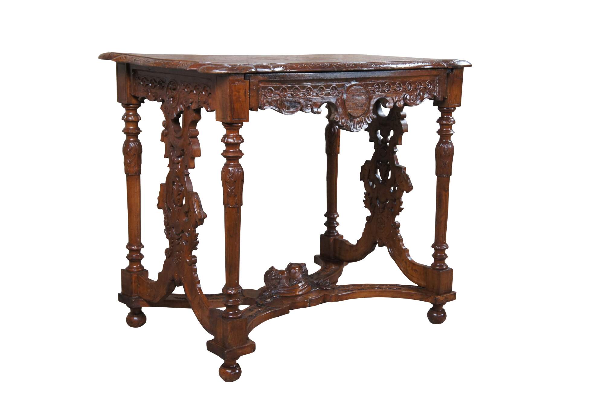 Antique Neo-Renaissance Revival parlor / library table or writing desk, circa 1870s Made of walnut featuring Neoclassical styling with high relief figural carvings of cherubs / puttis and acanthus / floral designs. The table has a carved top with one long drawer and pierced / reticulated sides, over turned legs connected by serpentine stretcher with cherub busts.