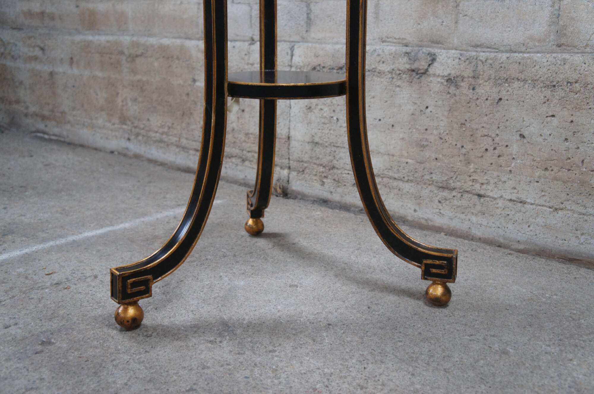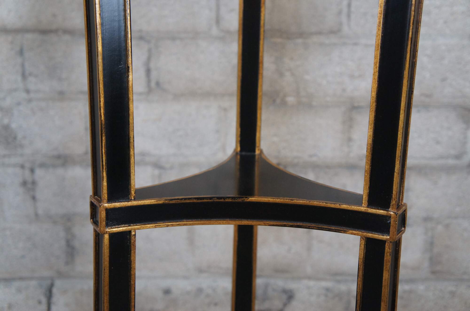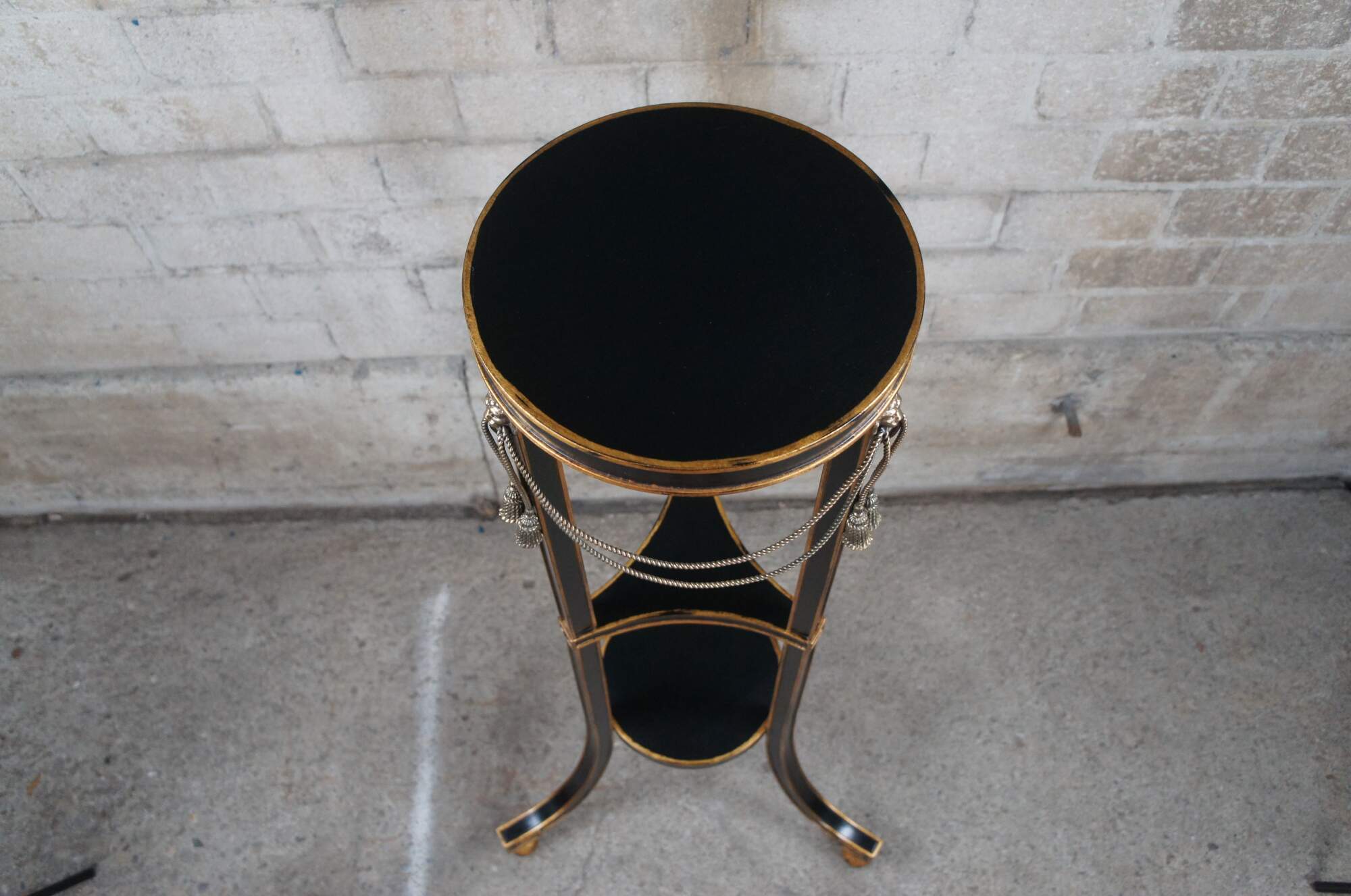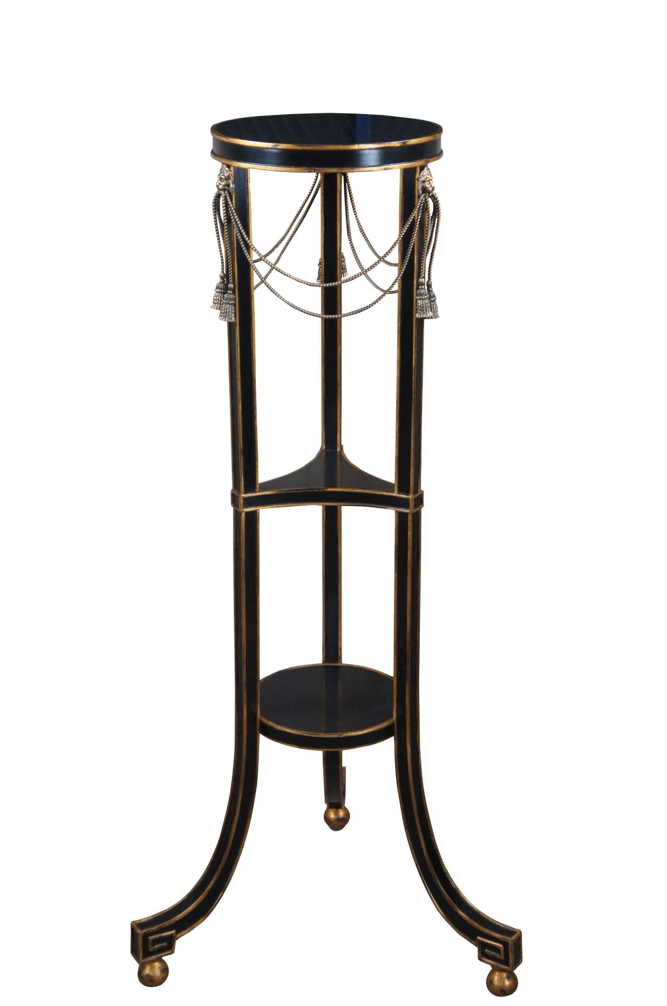 Vintage Henredon black ebonized three tier pedestal table / plant or sculpture stand featuring Empire styling with gold lion head rope tassel accents over flared legs and ball feet.