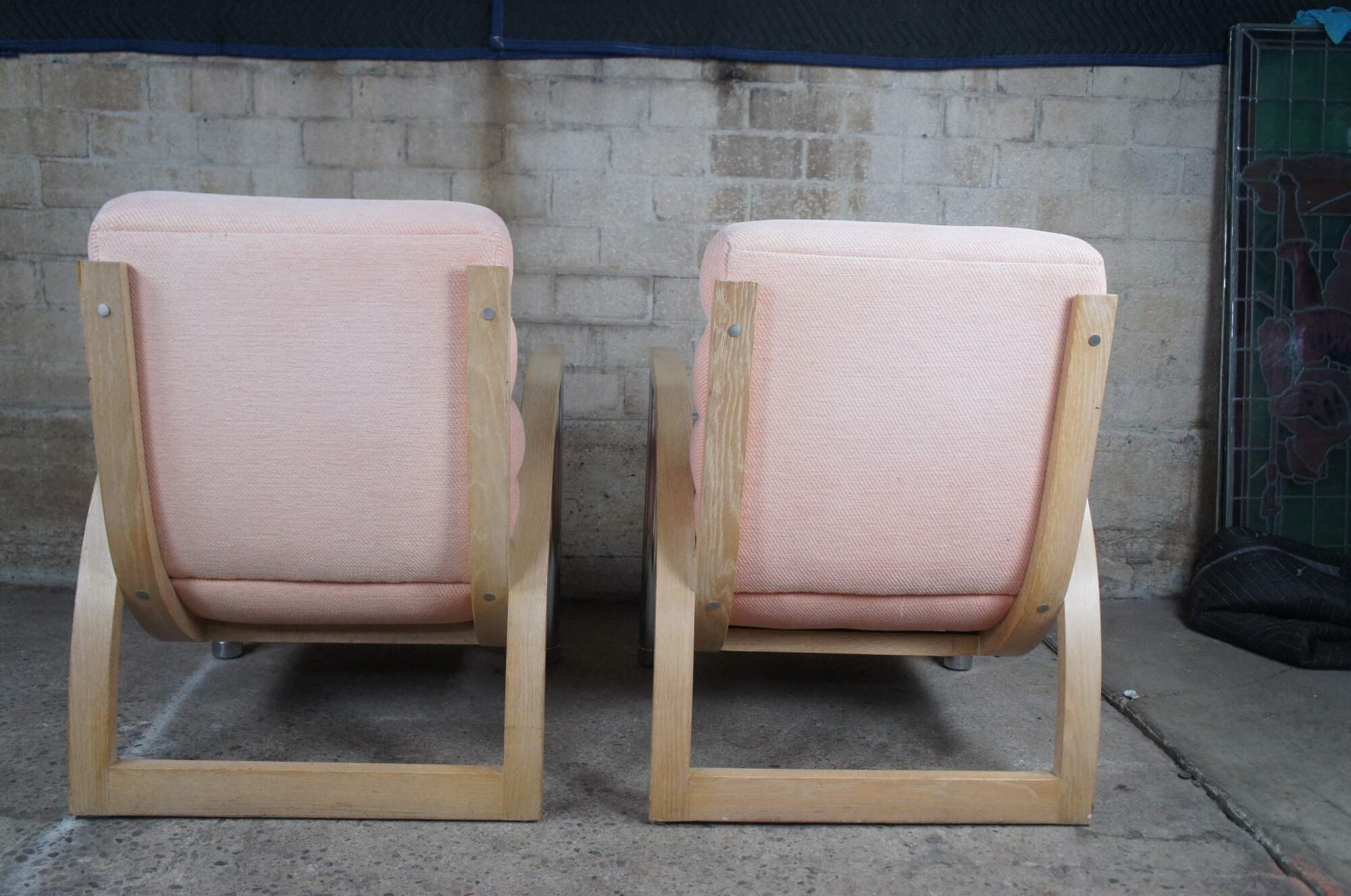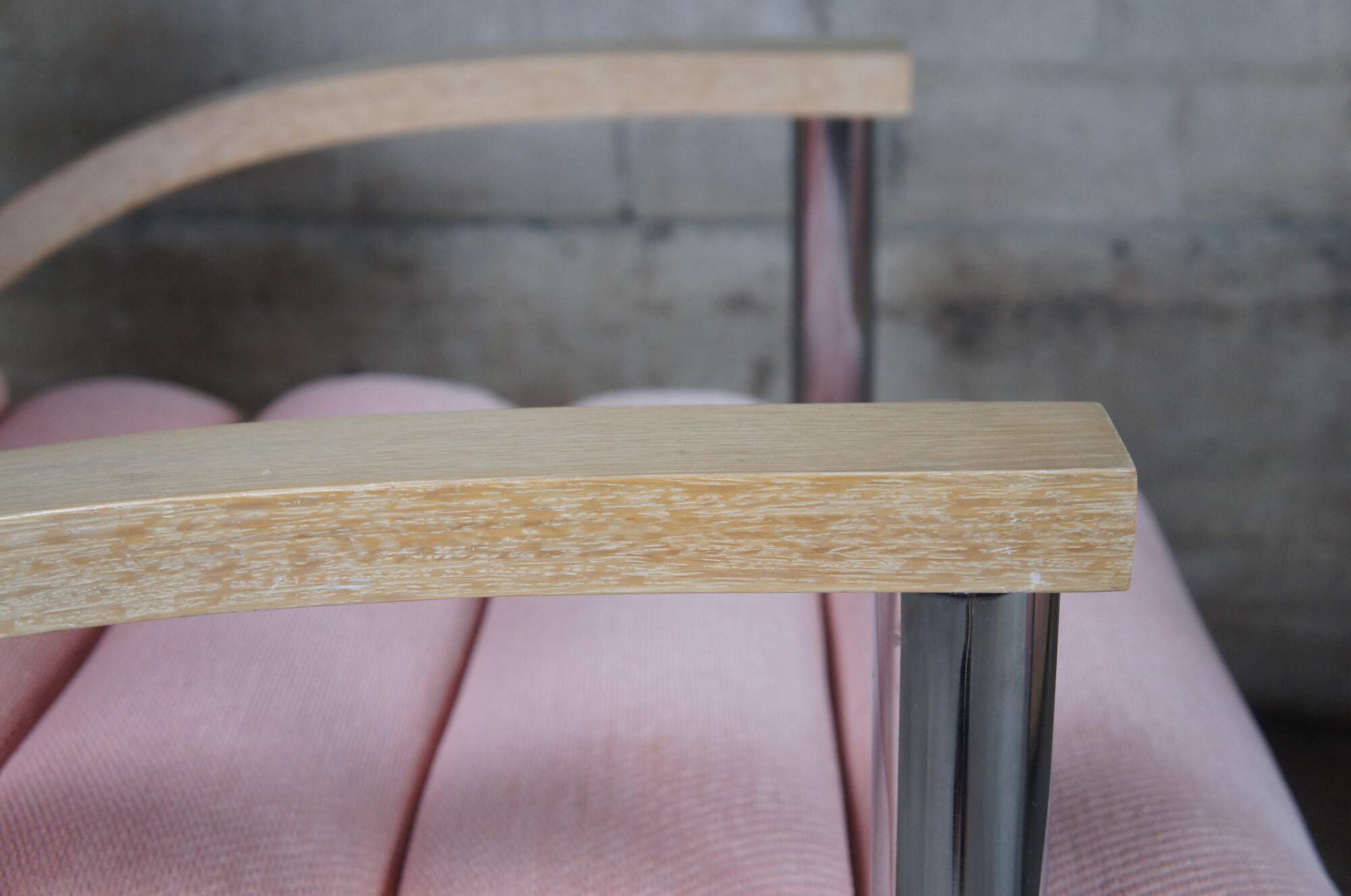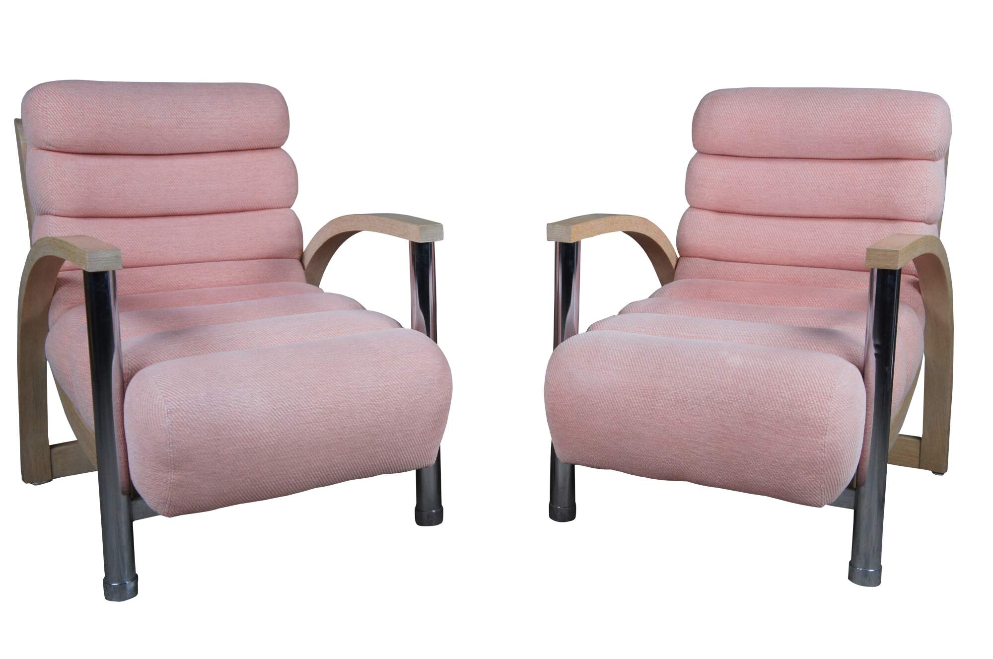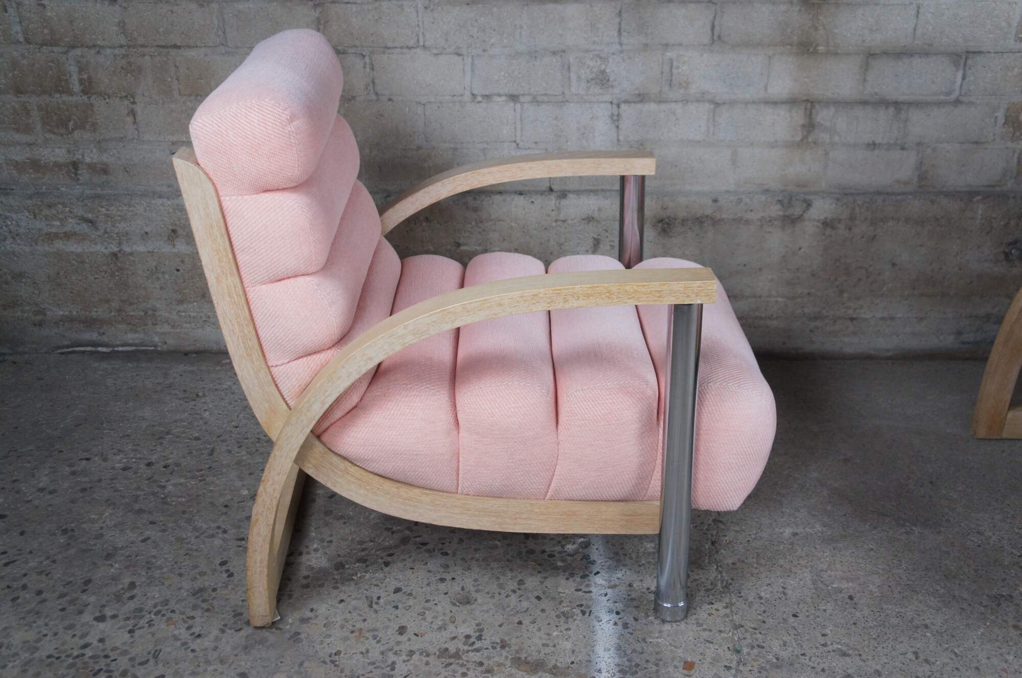 A beautiful pair of two "Eclipse" club / library / lounge chairs by Jay Spectre for Century Chair Comapny of North Carolina, circa 1980s. The chairs feature sculptural form, made from Cerused Oak and tubular chrome with channeled salmon / pink upholstery.