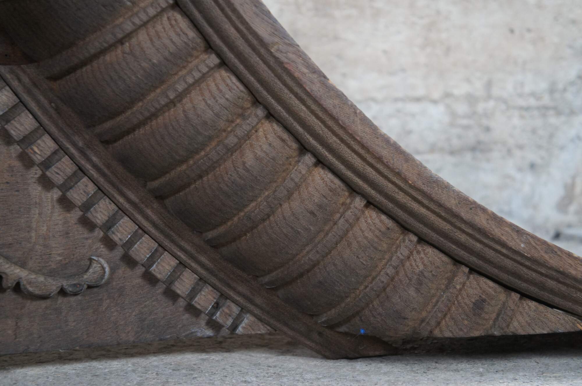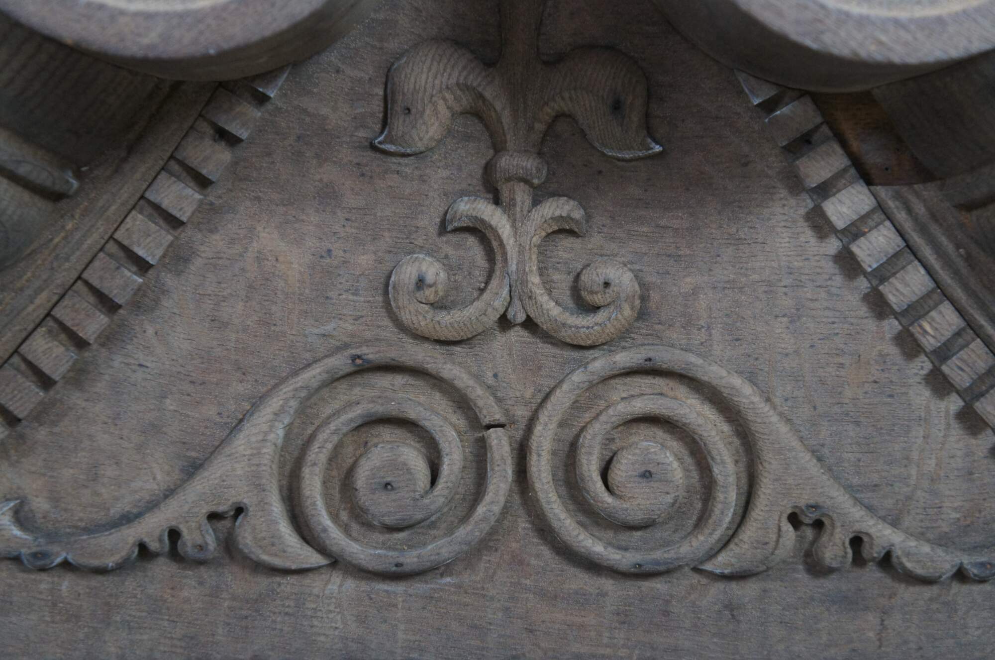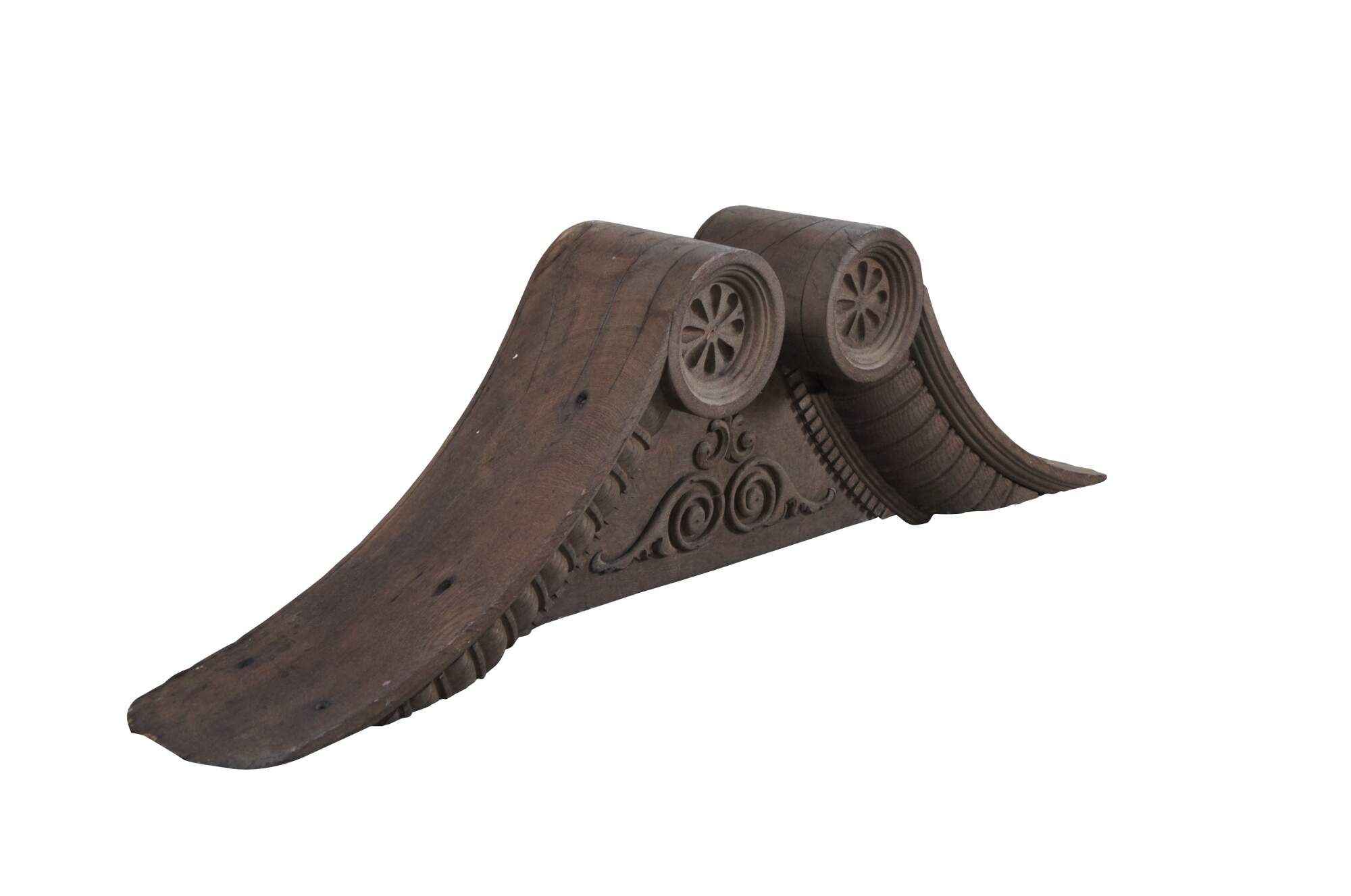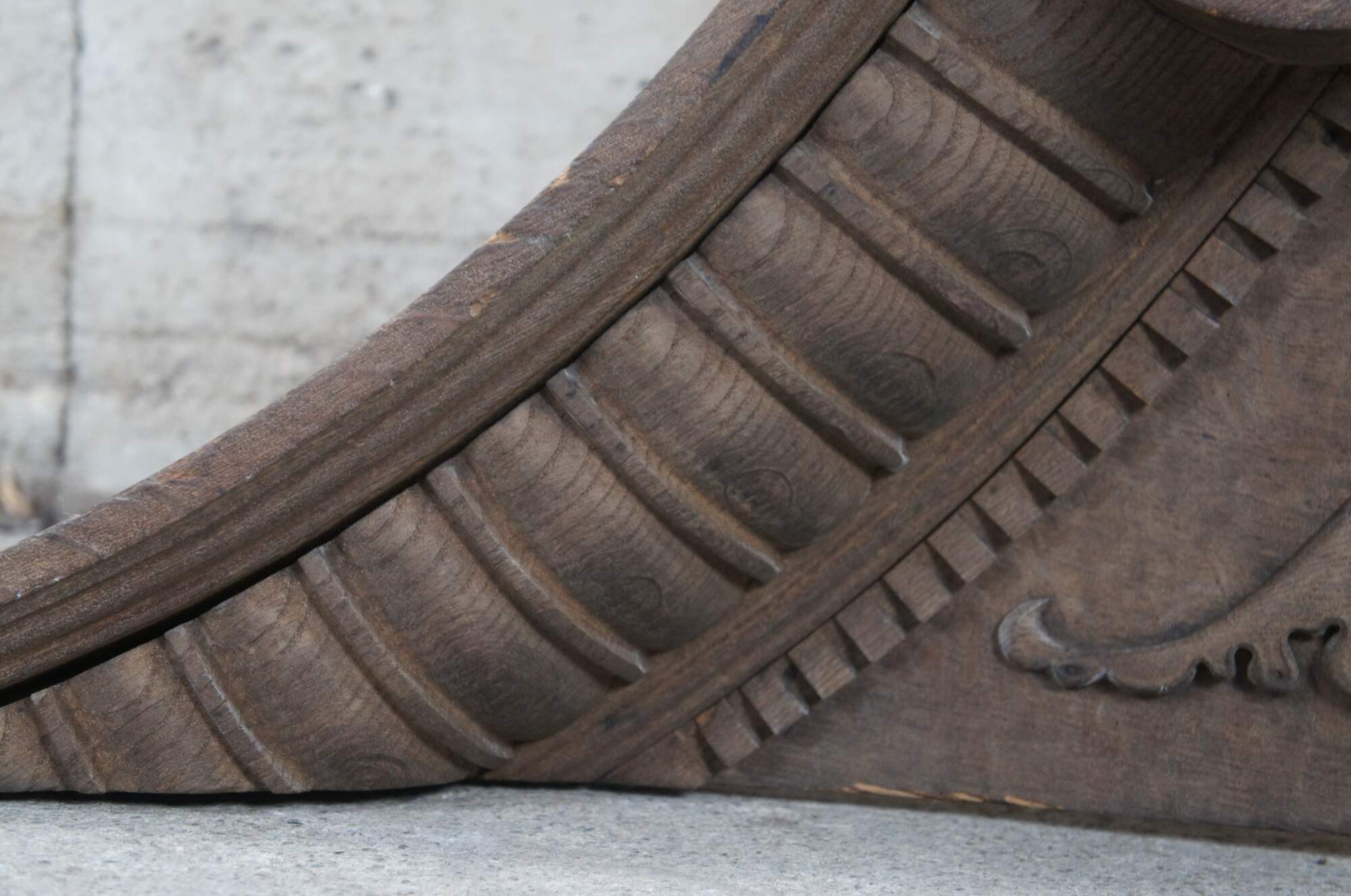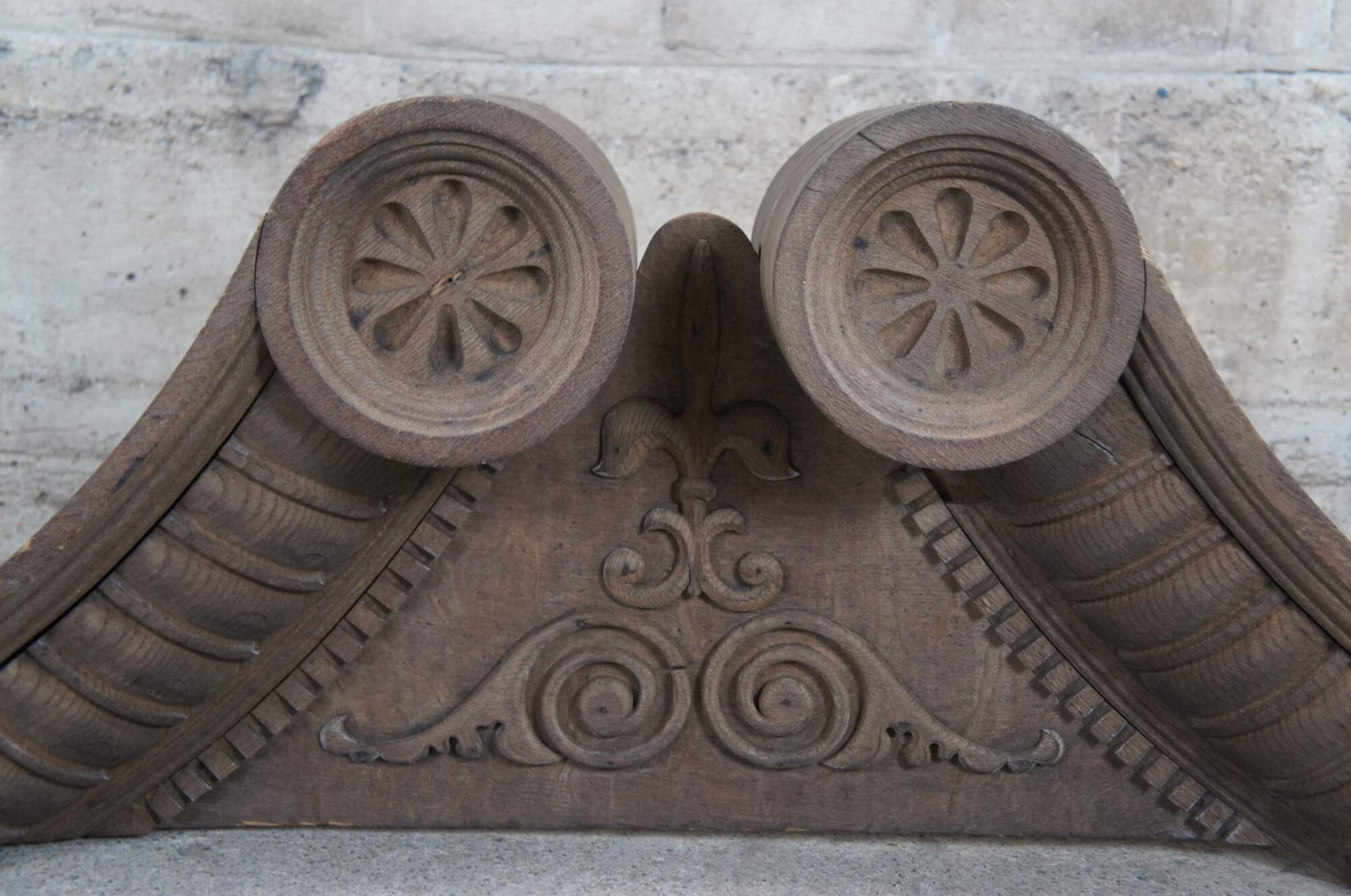 Antique Victorian fireplace mantel topper crown featuring scrolled pagoda form with carved medallions, gadrooning and dentil molding. This crown came from an estate in Orcas Island, Washington. It was meant to go on top of a 10' mantel but the ceiling did not allow the crown to fit. Its robust size and detailed carvings make for the perfect crown to a china cabinet, curio or bookcase.