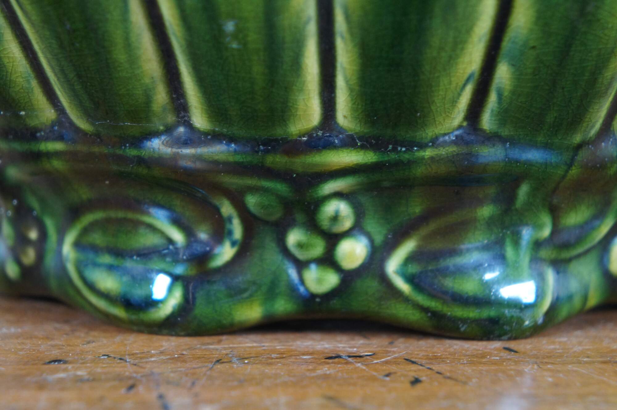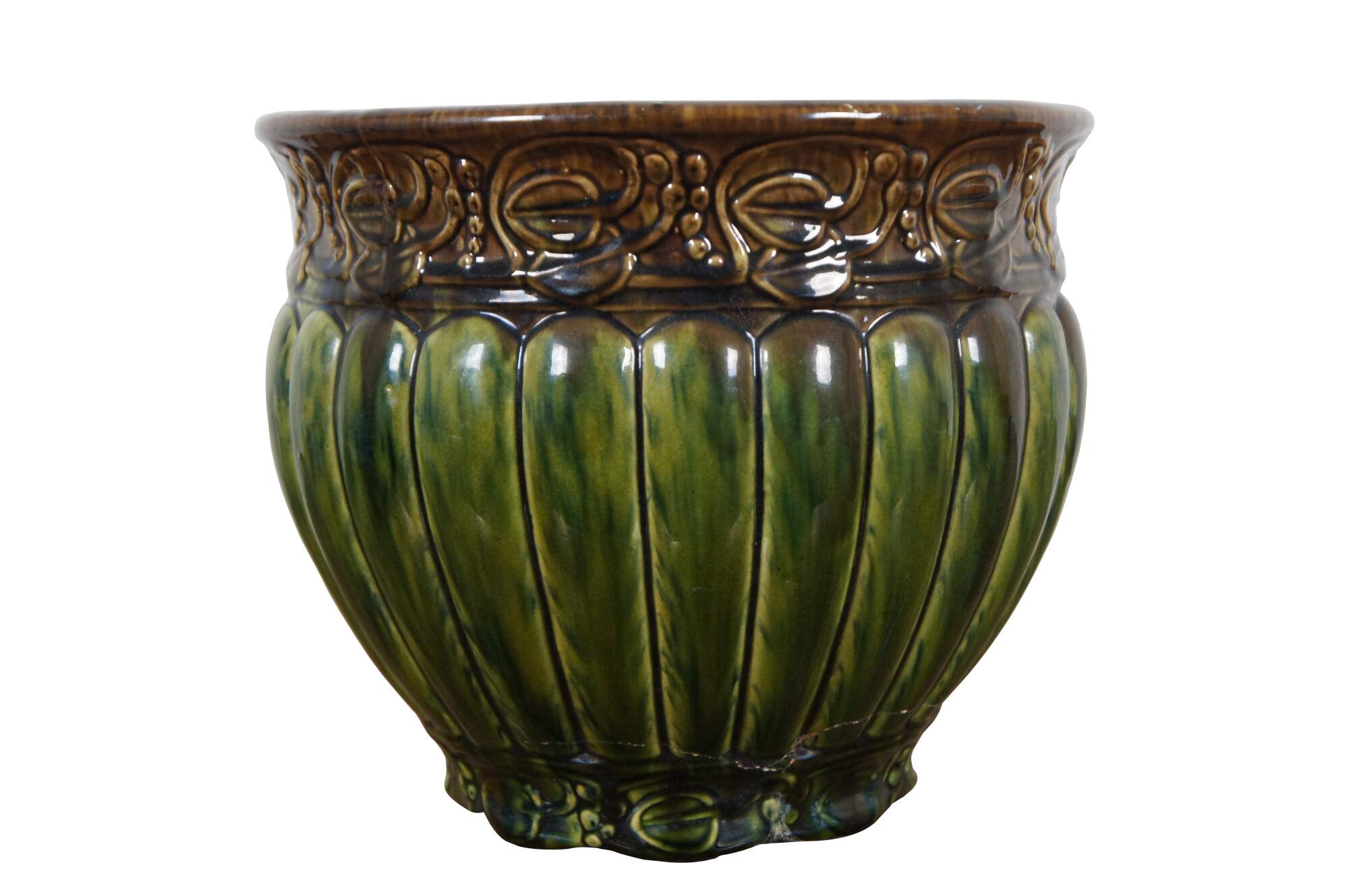 Antique green and brown glazed majolica art pottery planter / jardiniere. Features a a rounded shape with flared mouth and tapered base, decorated with bands of leaves and berries, and petal shaped fluting.