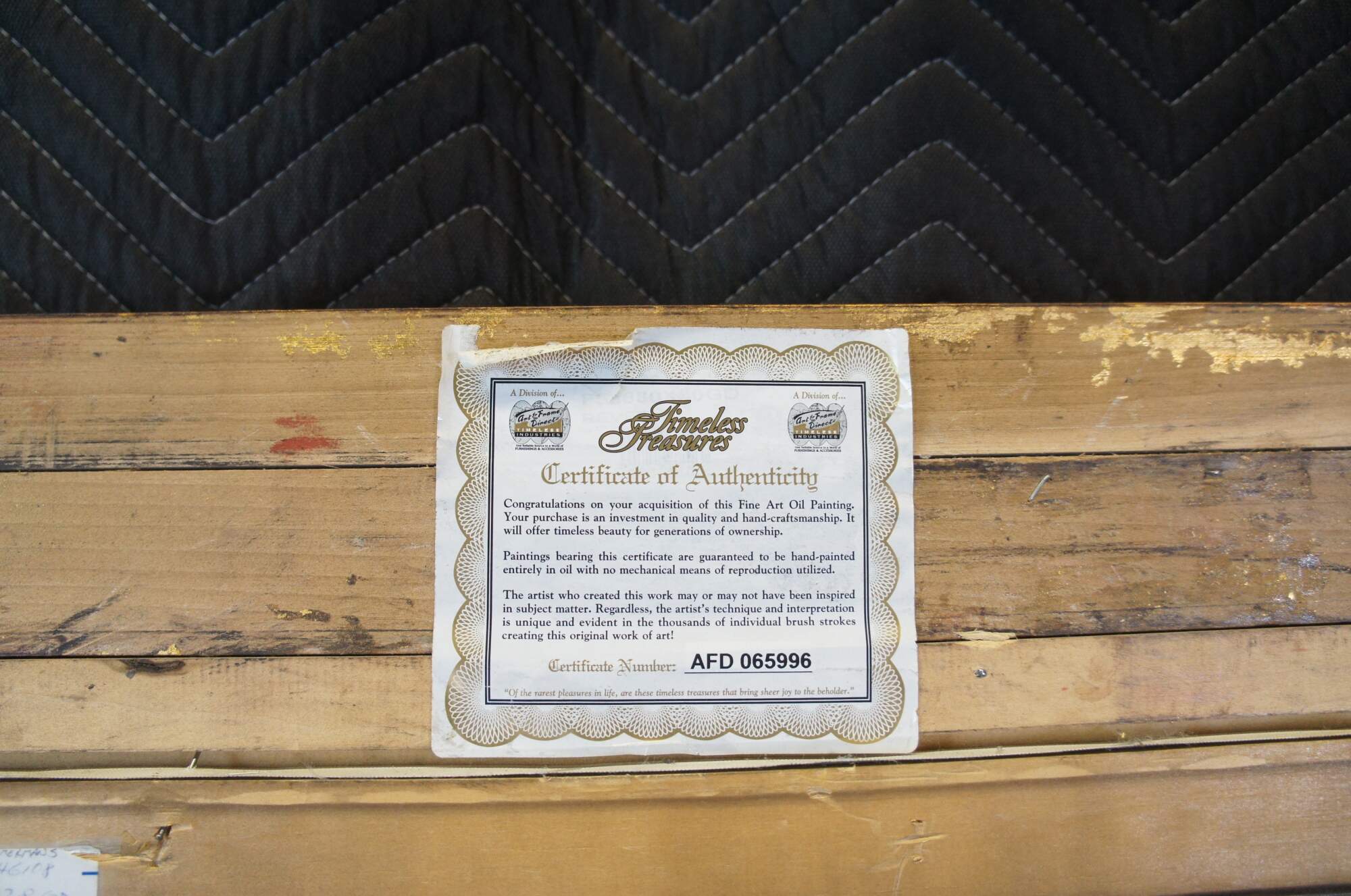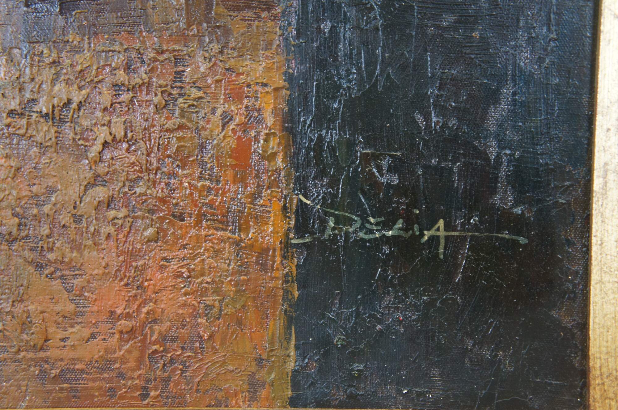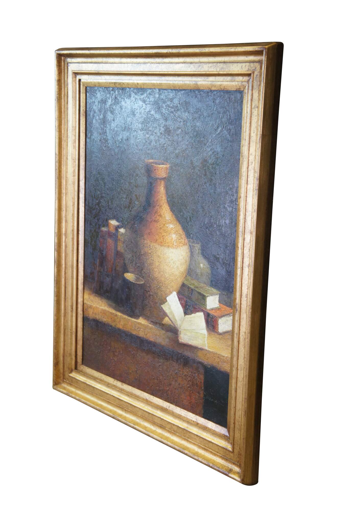 A large realist still life oil painting on canvas, circas 1990s. Signed by Delia lower left. Features a Southwestern / Tuscan library or study scene with books and vases on a table. The painting is framed in pine with a gold finish. Includes a COA from Timeless Tresures