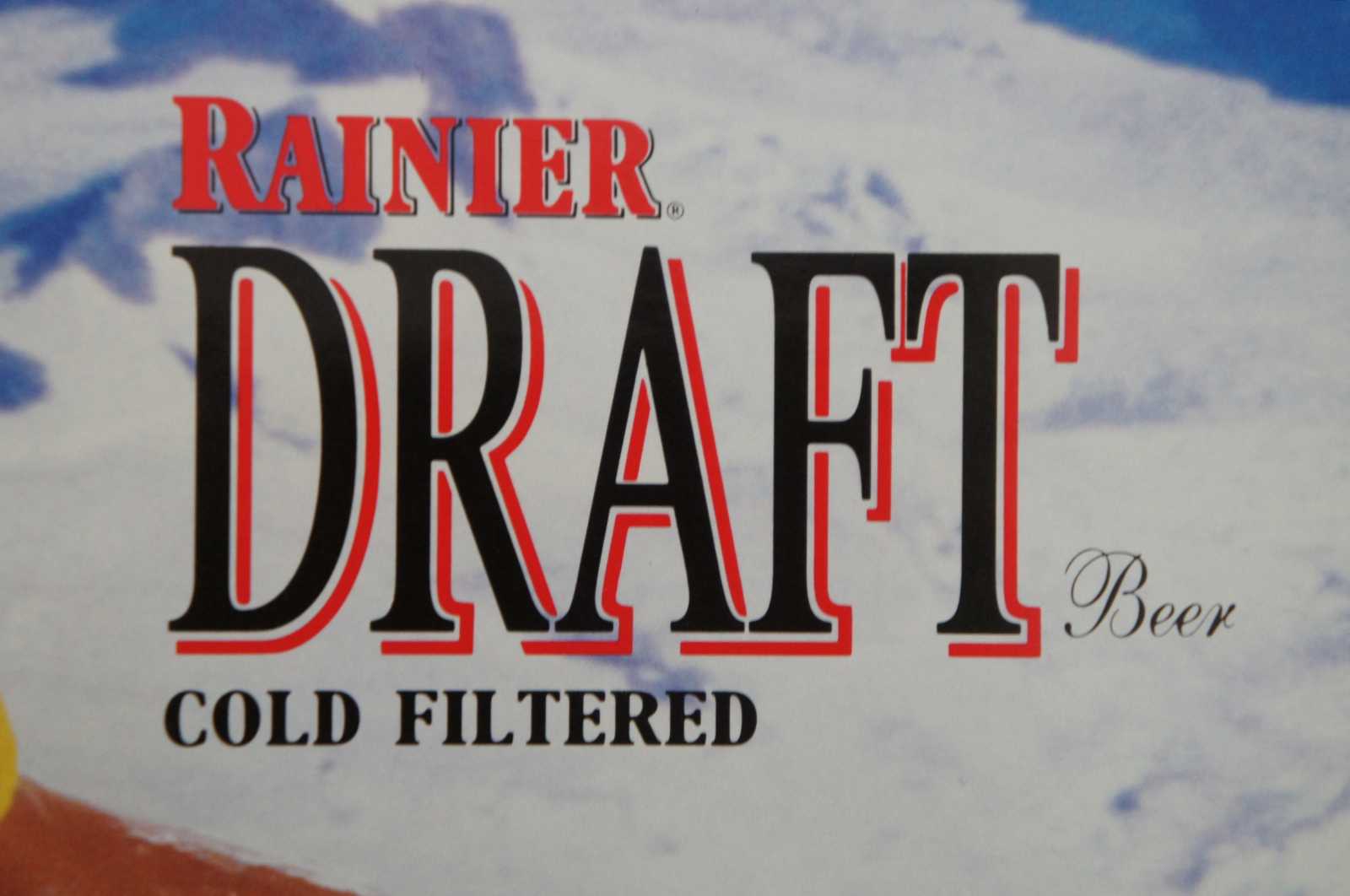 2 Available – 1991 promotional poster for Ranier draft beer featuring a damp bikini clad woman in from of a snowy mountain.