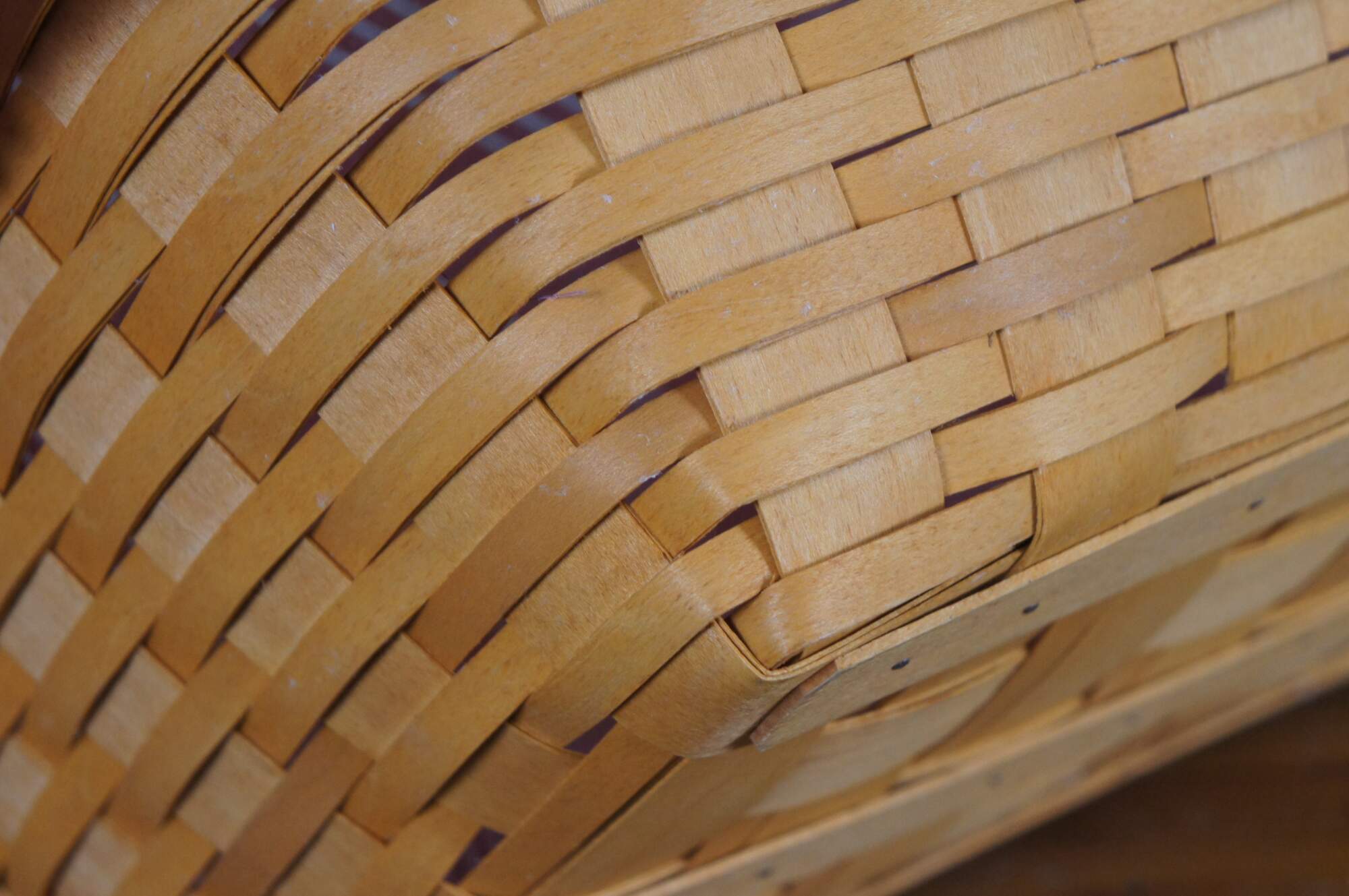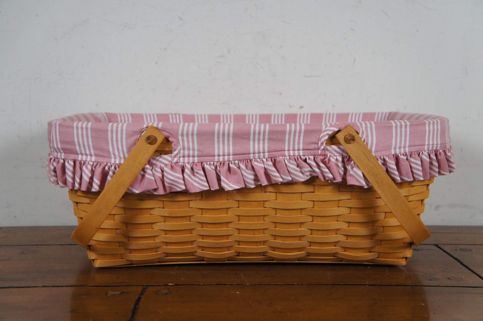 Vintage 1990s Longaberger Hostess Treasures harvest / gathering / picnic basket. Hand woven maple in a rectangular form with rotating bail hand;es and a pink and white striped cotton liner. Signed RRT 1999 / L1785 OCILM.