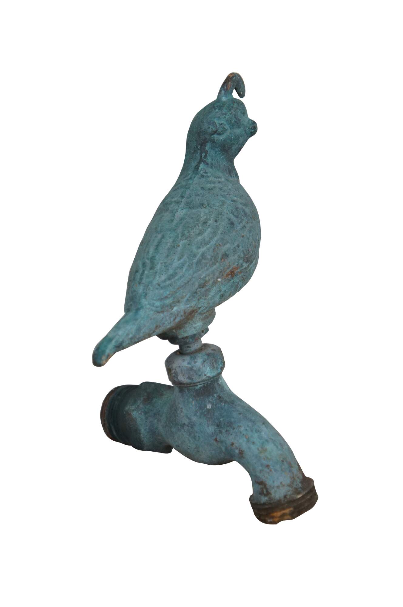 Vintage brass hunt theme water faucet / garden hose spigot with handle in the shape of a California Gambel's Quial - featuring the distinctive head plumage.