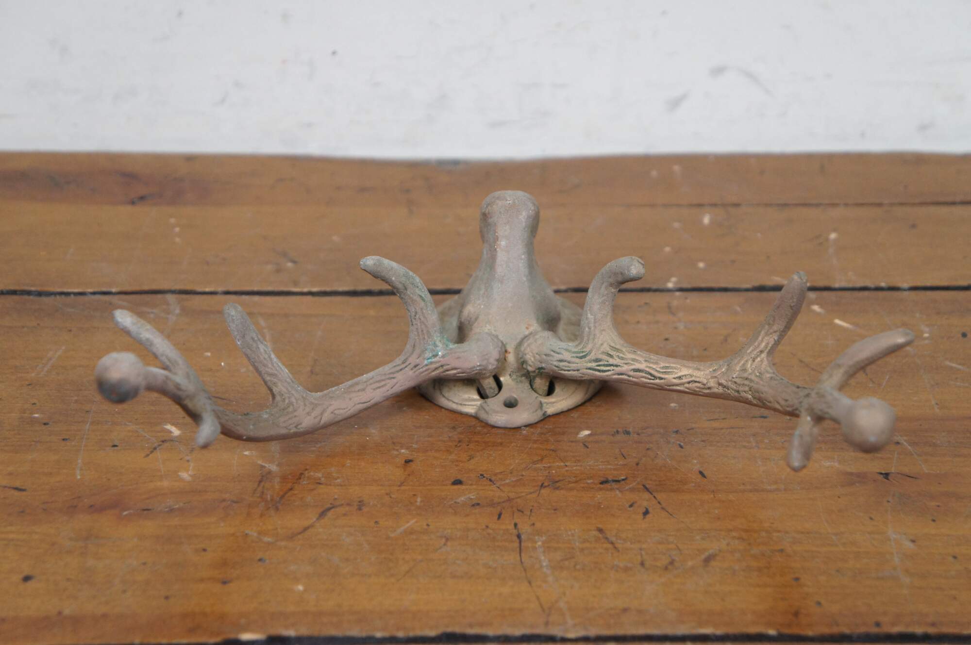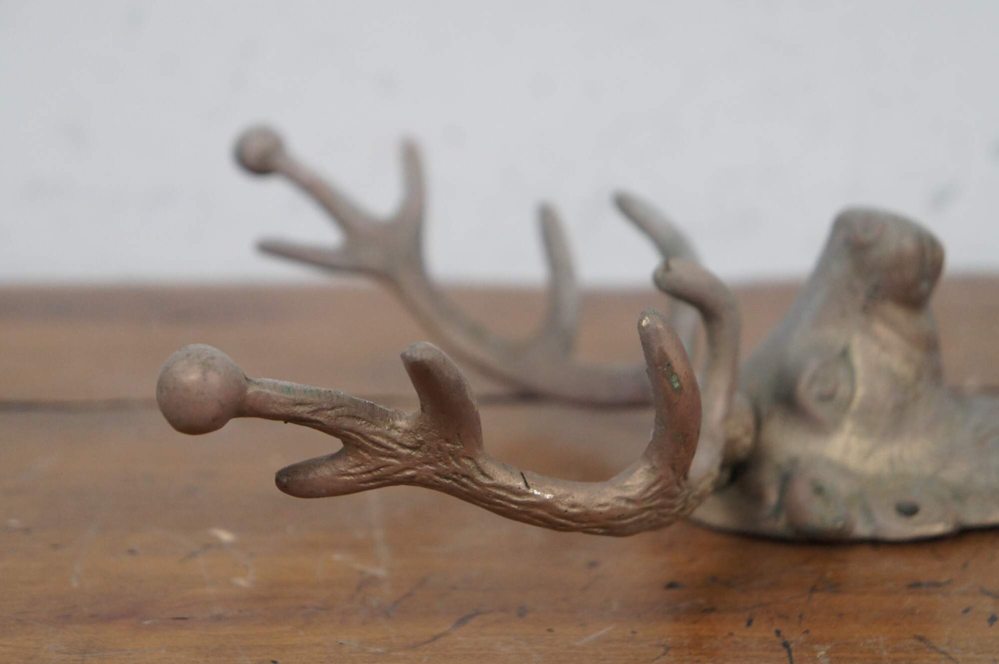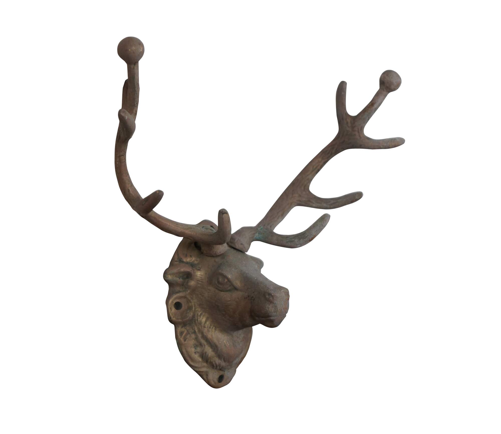 Vintage large cast brass hunt theme hat / coat hook or key rack in the shape of a mounted deer / elk / stag / reindeer with ten point antlers.