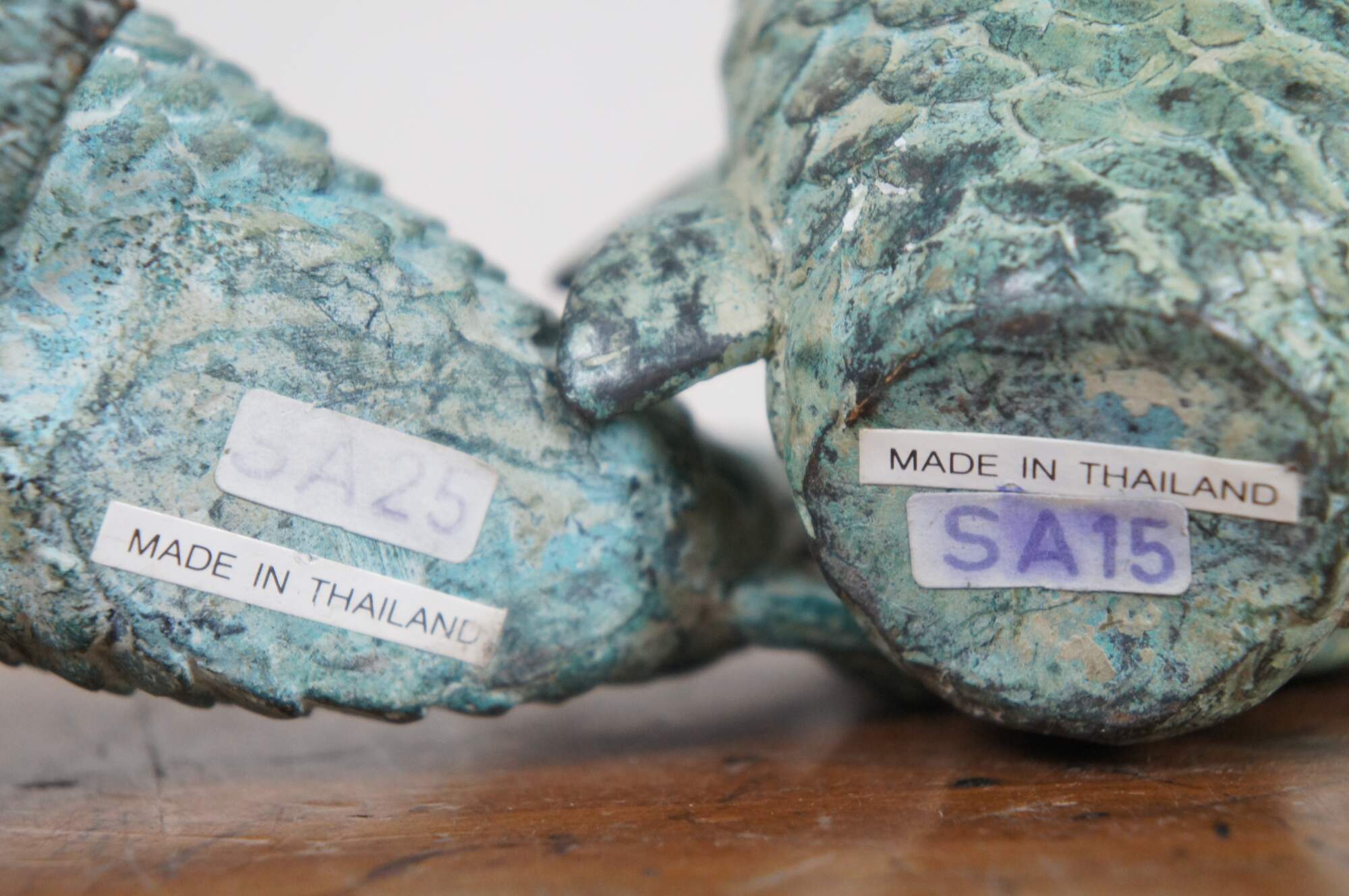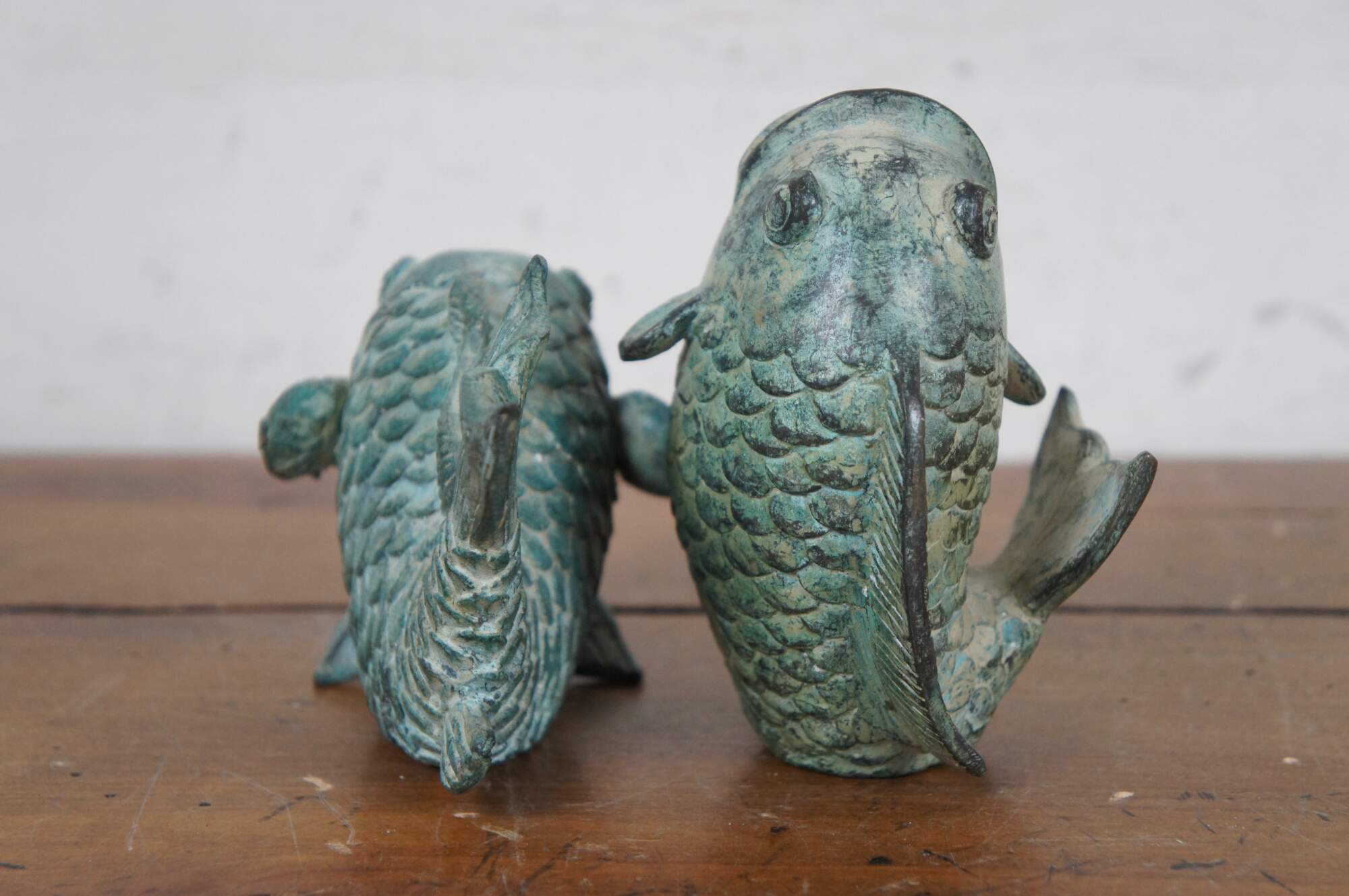 Pair of vintage cast metal figurines in the shape of koi fish, one perched on his belly, one upright on his tail. Made in Thailand. SA25