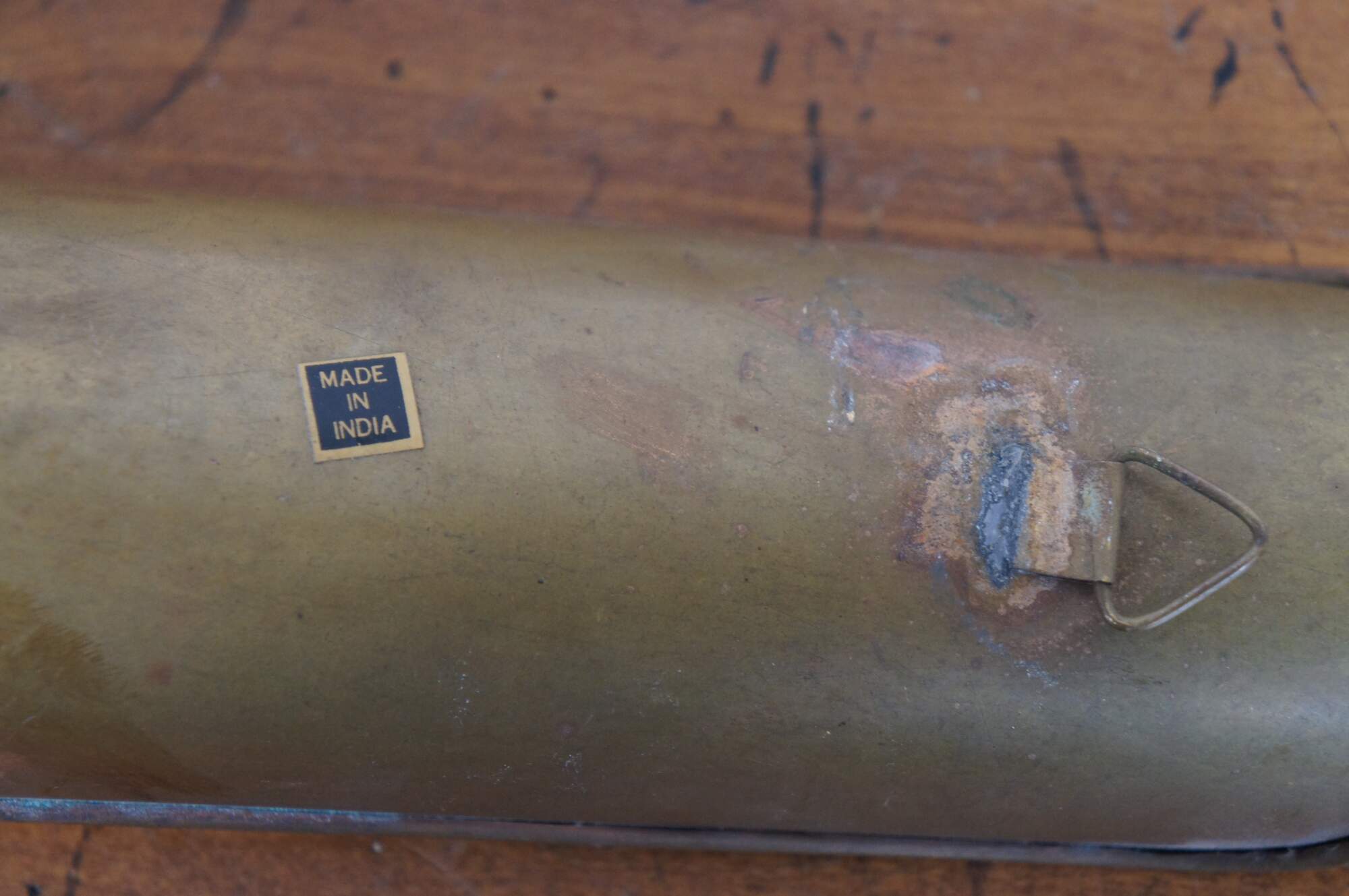 Vintage wall hanging candle holder crafted to resemble an antique brass grain scoop with turned wood handle. Single taper candle cup in base of scoop, which acts as a reflector. Hook on back for display. Made in India.