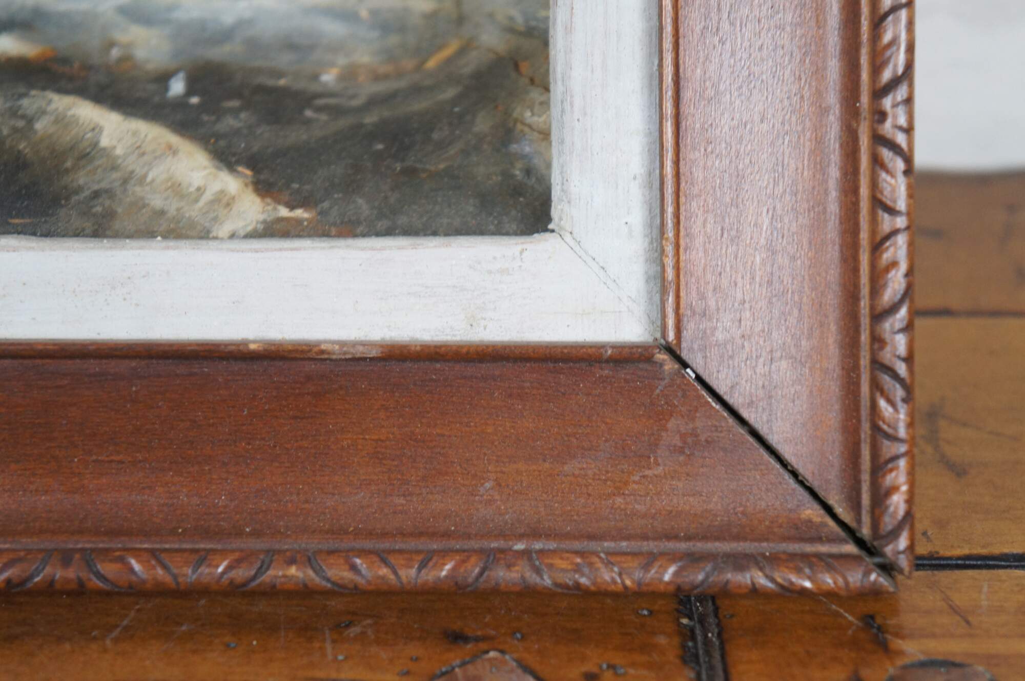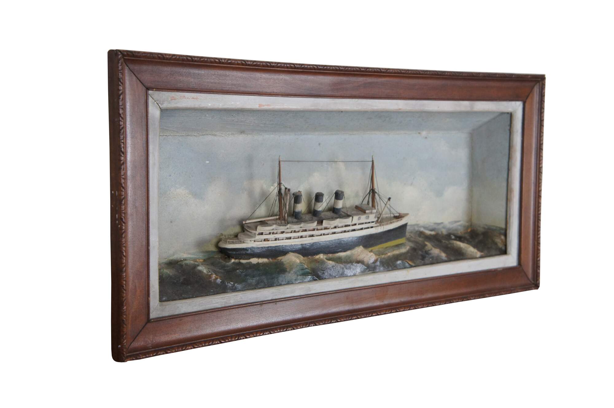 Antique three dimensional folk art diorama portraying a steam boat / oceanliner / ship on a choppy sea. The model is set in a rectangular shadowbox with white trim and brown wood frame with carved border.