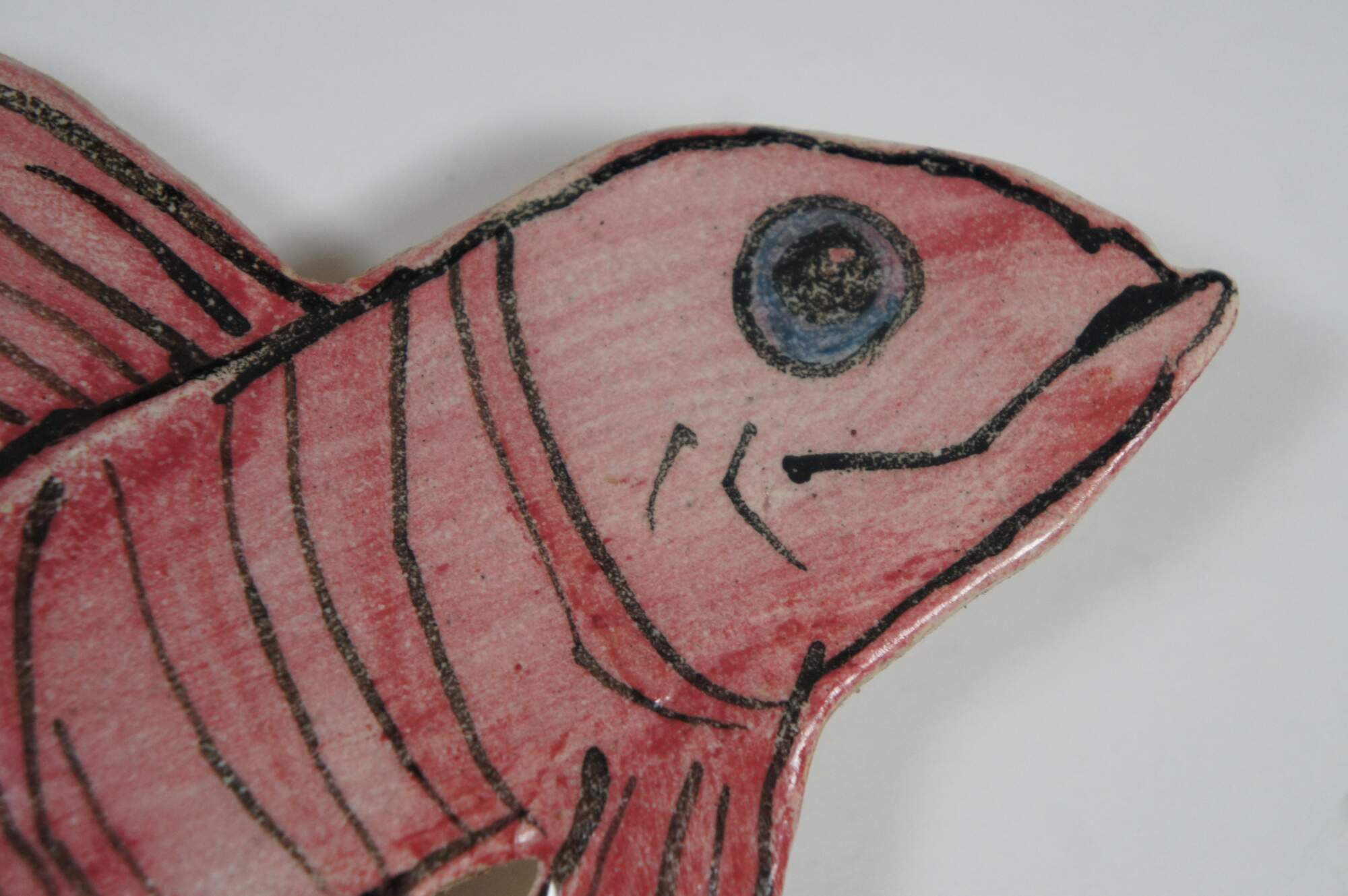 Pair of vintage 1995 hand painted ceramic art & crafts pottery fish - one pink betta fish and one blue fish with spots and yellow stripes - adapted into decorative garden stakes. Signatures on reverse are obscured by the addition of metal rods, glued and sealed to the surface with a swirl of caulk. Circa 1995, Orcas Island.