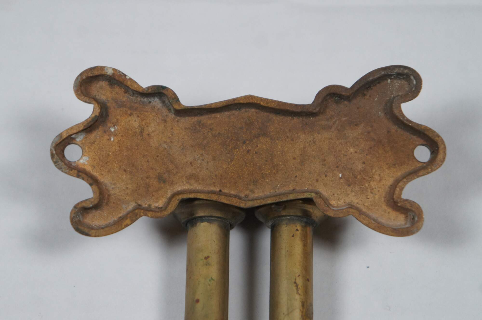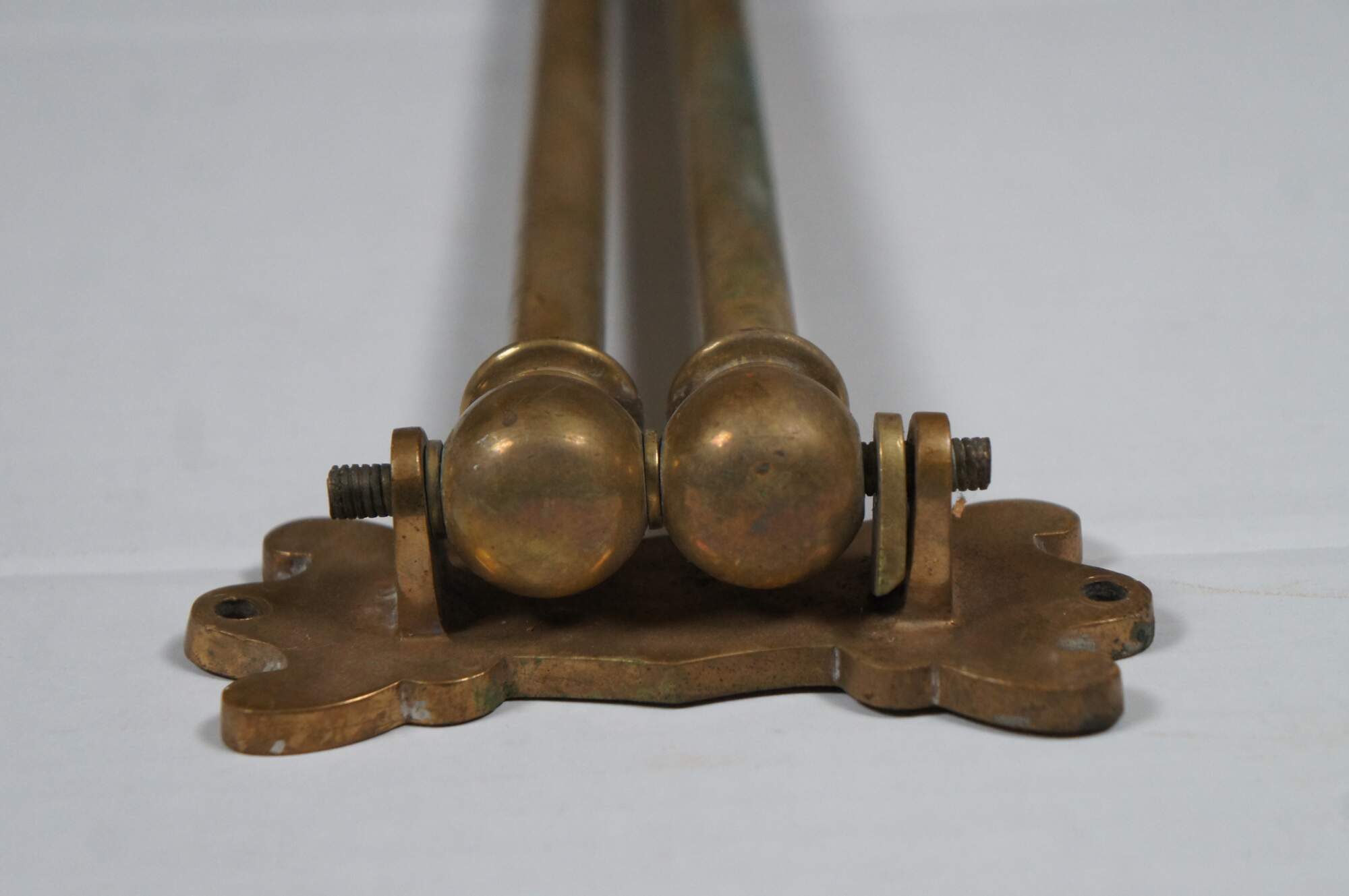 Antique drying rack / towel bar featuring a decorative scalloped edge wall mount and two swiveling arms with simply decorated caps.