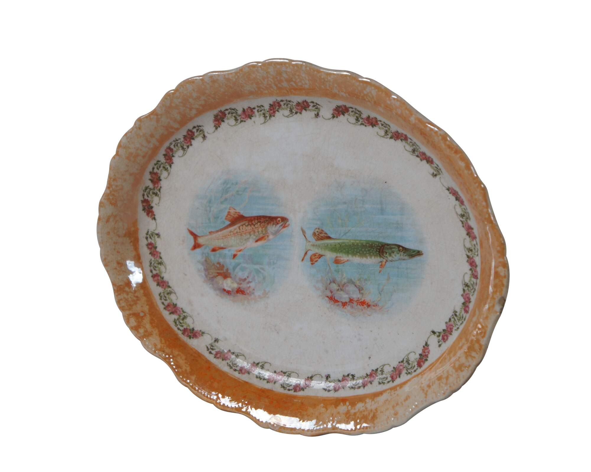 Late 19th - early 20th century semi-vitreous porcelain oval serving platter by Knowles, Taylor and Knowles. Features an iridescent orange border and transferware garland of roses around the images of a trout and a pike.
