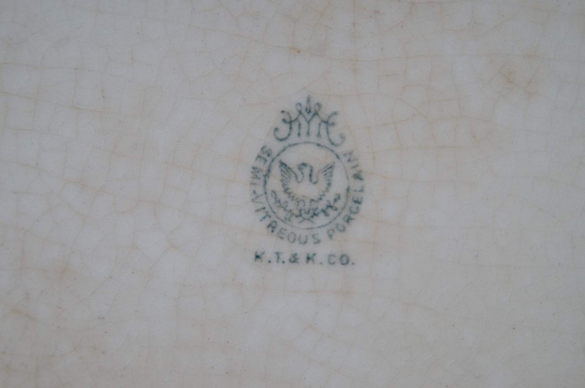 "Knowles, Taylor & Knowles (KT&K) was a pottery company in East Liverpool, Ohio from 1854 to 1931. The original owners were: Issac Knowles, John Taylor, (Issac's son-in-law) and Homer Knowles (Issac's son). The pottery produced all types of wares from yellow ware, ironstone, and semi-vitreous dinnerware, but it is best known for the light-weight, translucent Lotus Ware. Produced mainly in the 1890s, Lotus was meant to compete with the successful Belleek porcelain made in Ireland. High cost and breakage forced K&TK to halt production of Lotus. KT&K is not to be confused with Knowles China of Newell, WV. Even though Edwin M. Knowles of Knowles China was the son of Issac, the two companies operated independently of each other. In 1929, KT&K merged with several other potteries to form the American China Corporation, but the company folded due to the Great Depression." (Source: Laurel Hollow Park)