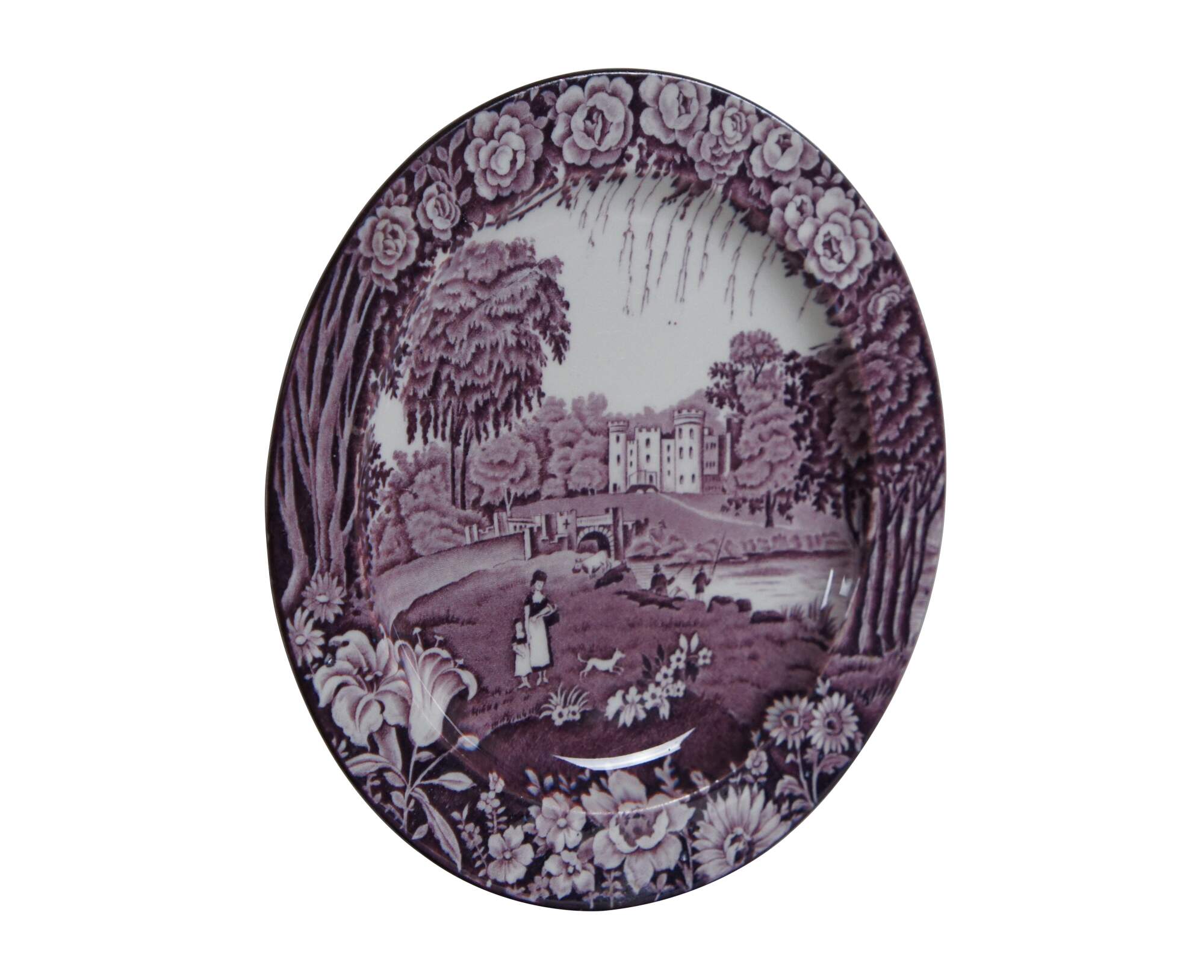 Circa mid 20th century purple transferware dinner plate by Wood & Sons in the Enoch Woods Castles line, Dalguise pattern, showing a picturesque landscape with figures by a bridge over a river, leading to a castle, all framed by the lush foliage of trees and flowers.