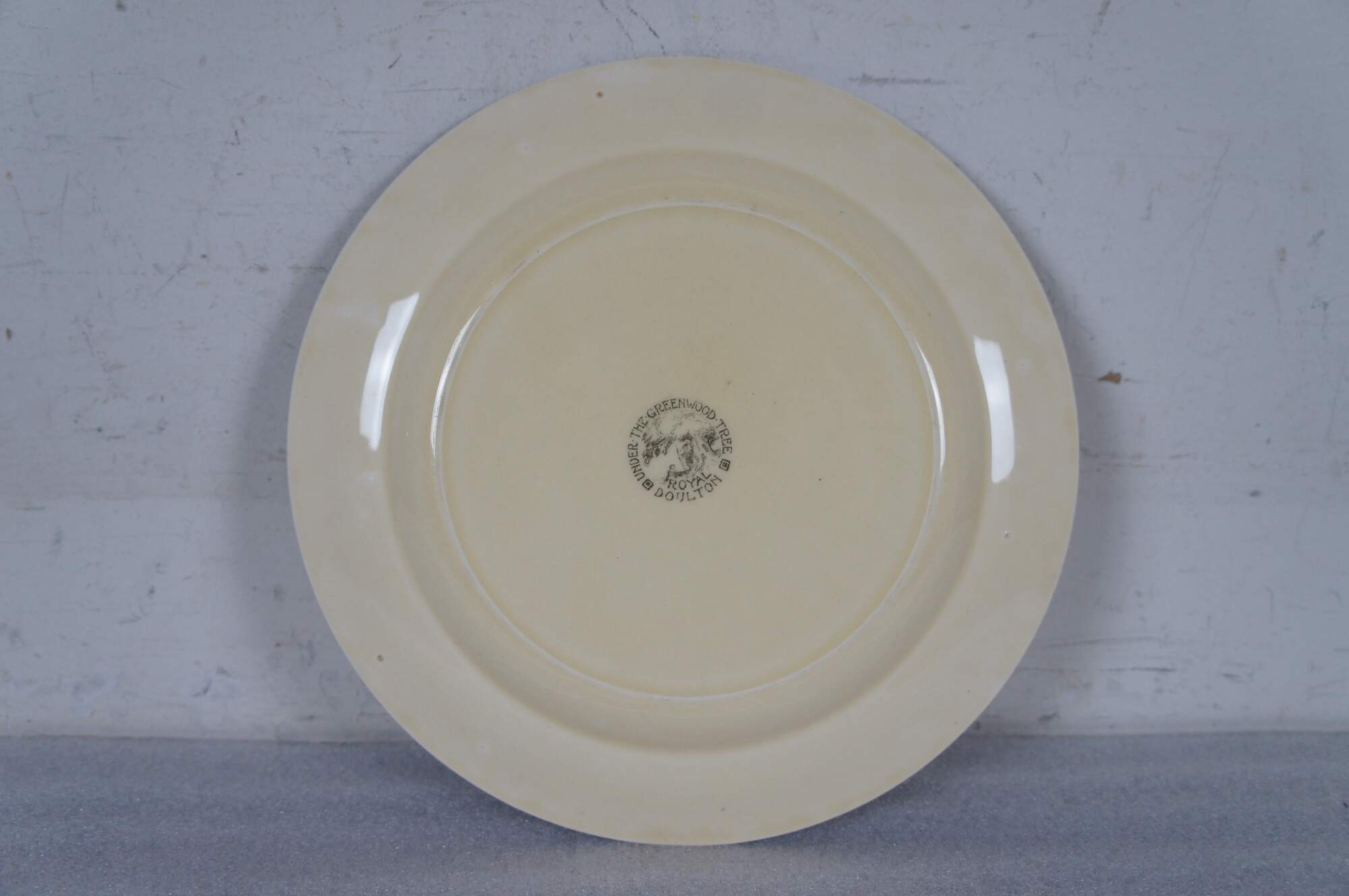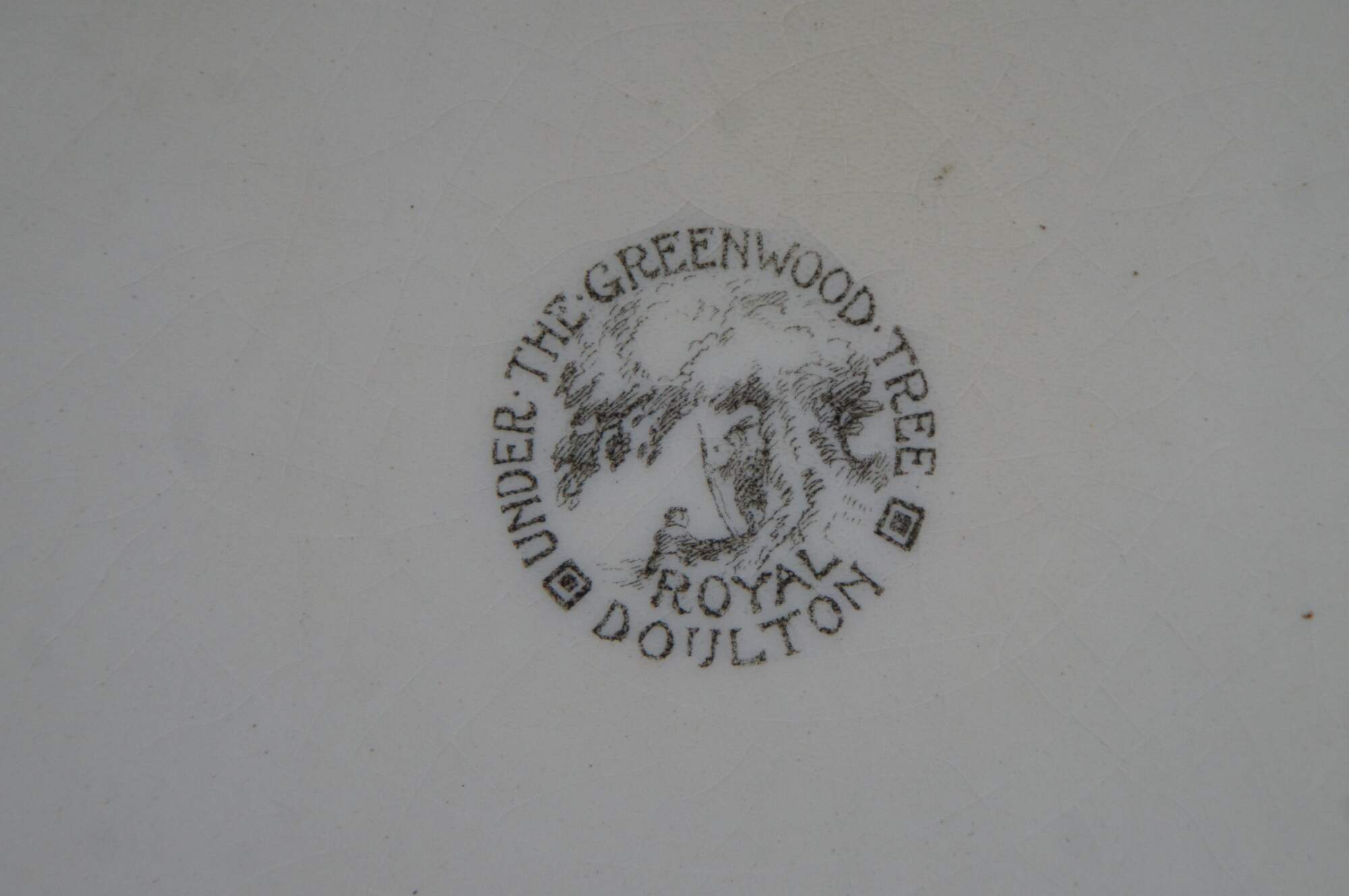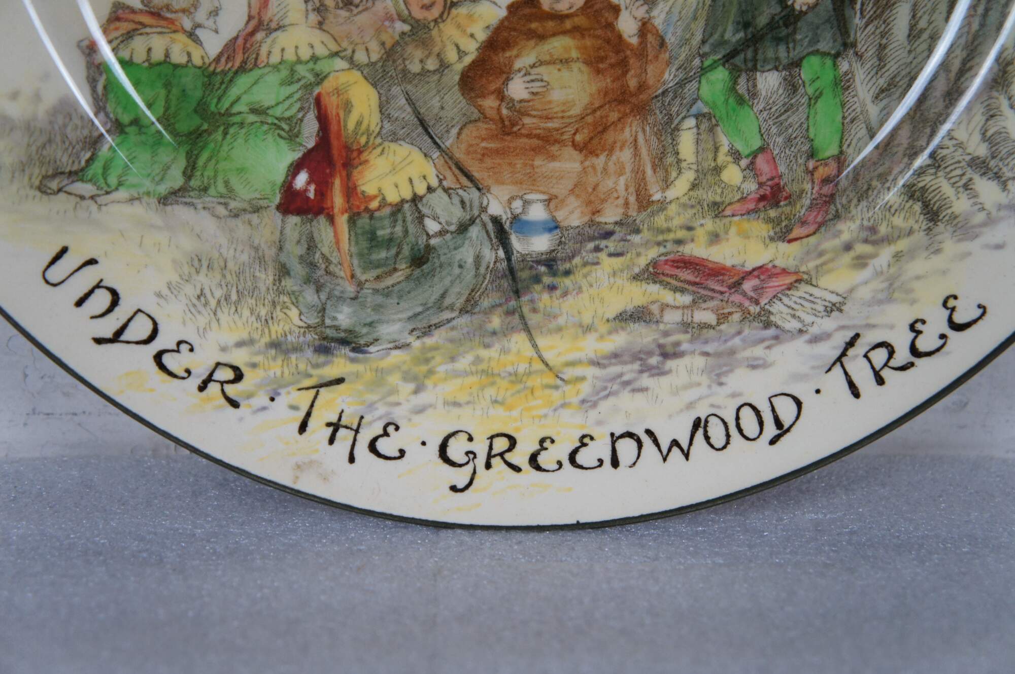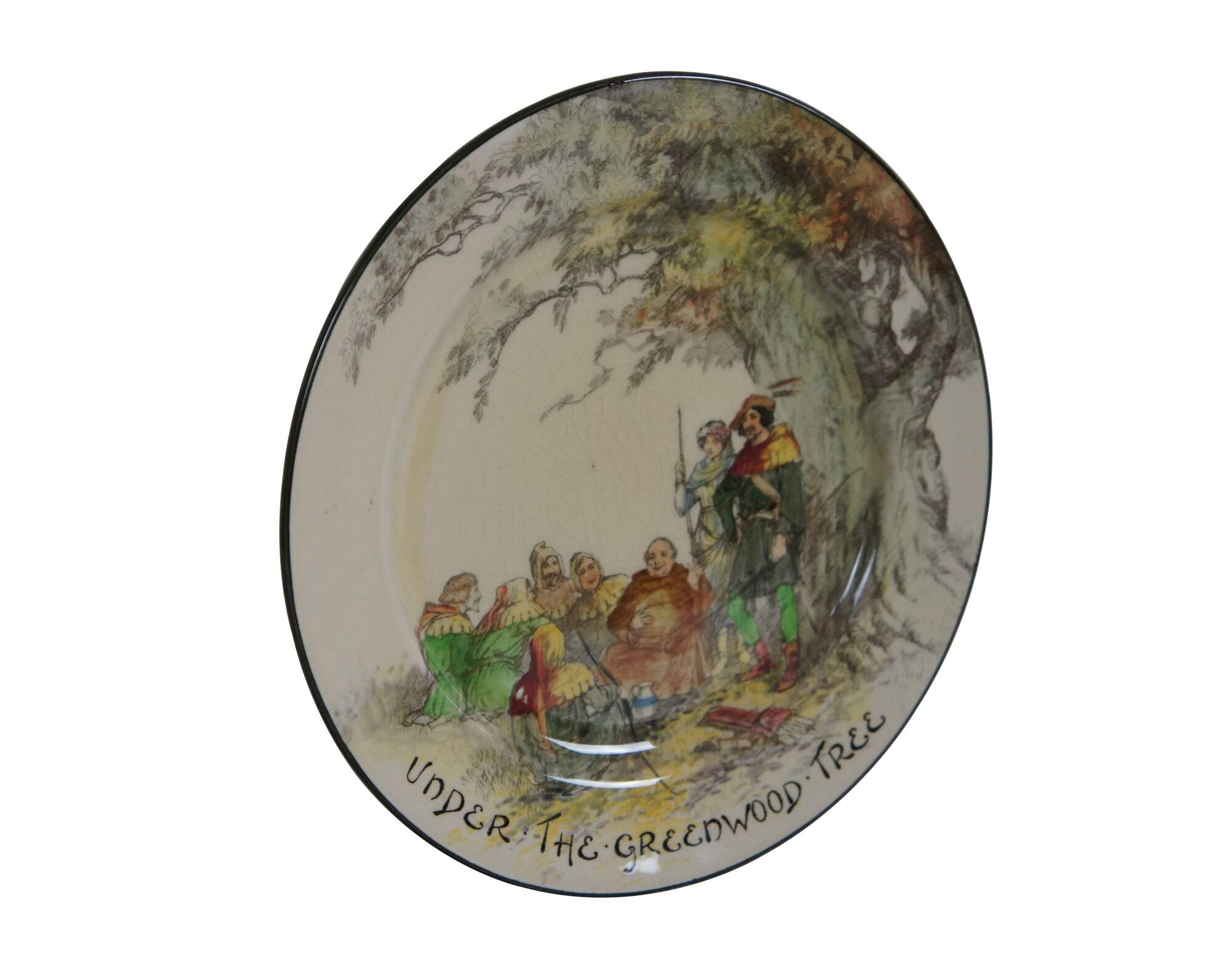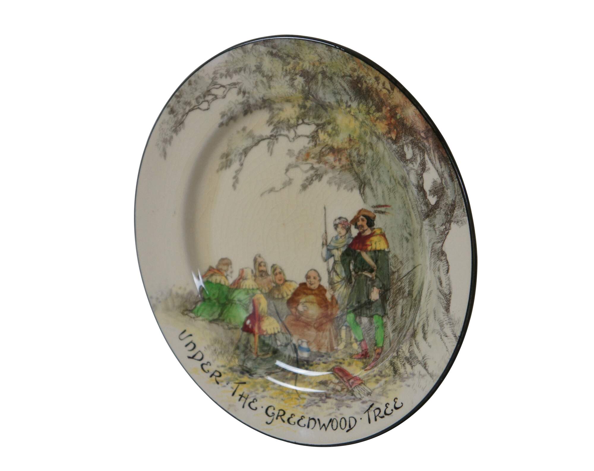 Early to mid 20th century Royal Doulton "Under the Greenwood Tree" dinner plate / charger showing a charming illustration of Robin Hood, Maid Marian, Friar Tuck and the merry band of outlaws in Sherwood Forest. The design was produced from about 1914-1967.