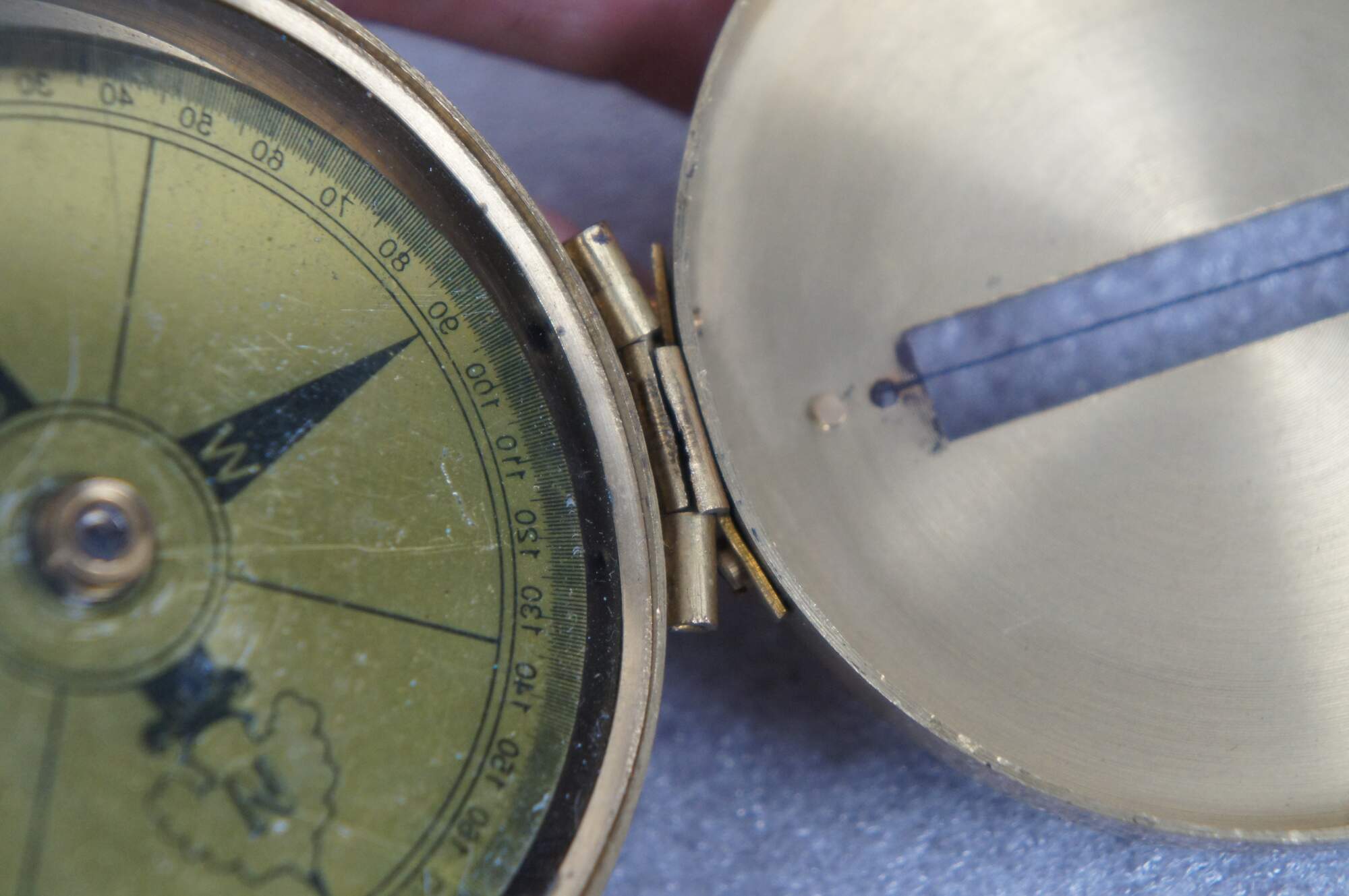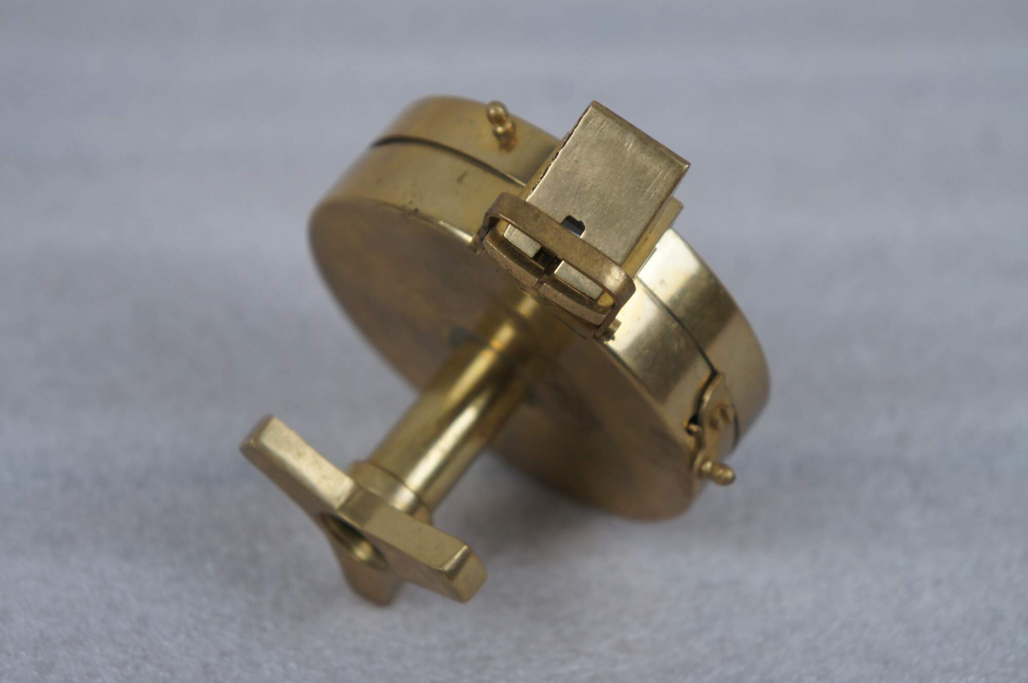 Vintage T. Cooke of London prismatic compass. Brass case with pierced sight line in the lid, folding prism, metallic gold tone face, and short stand able to be screwed onto a tripod for stabilization.