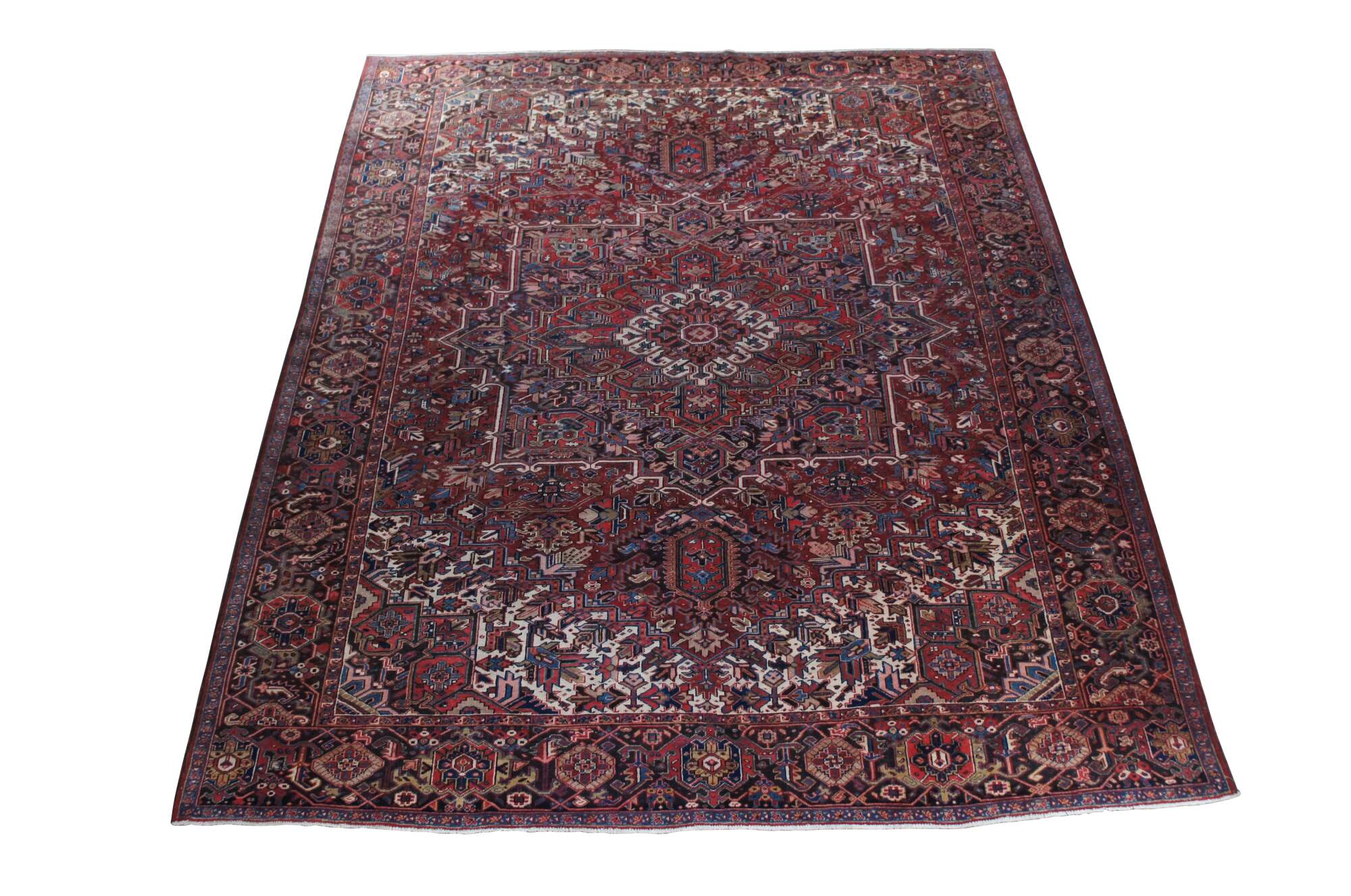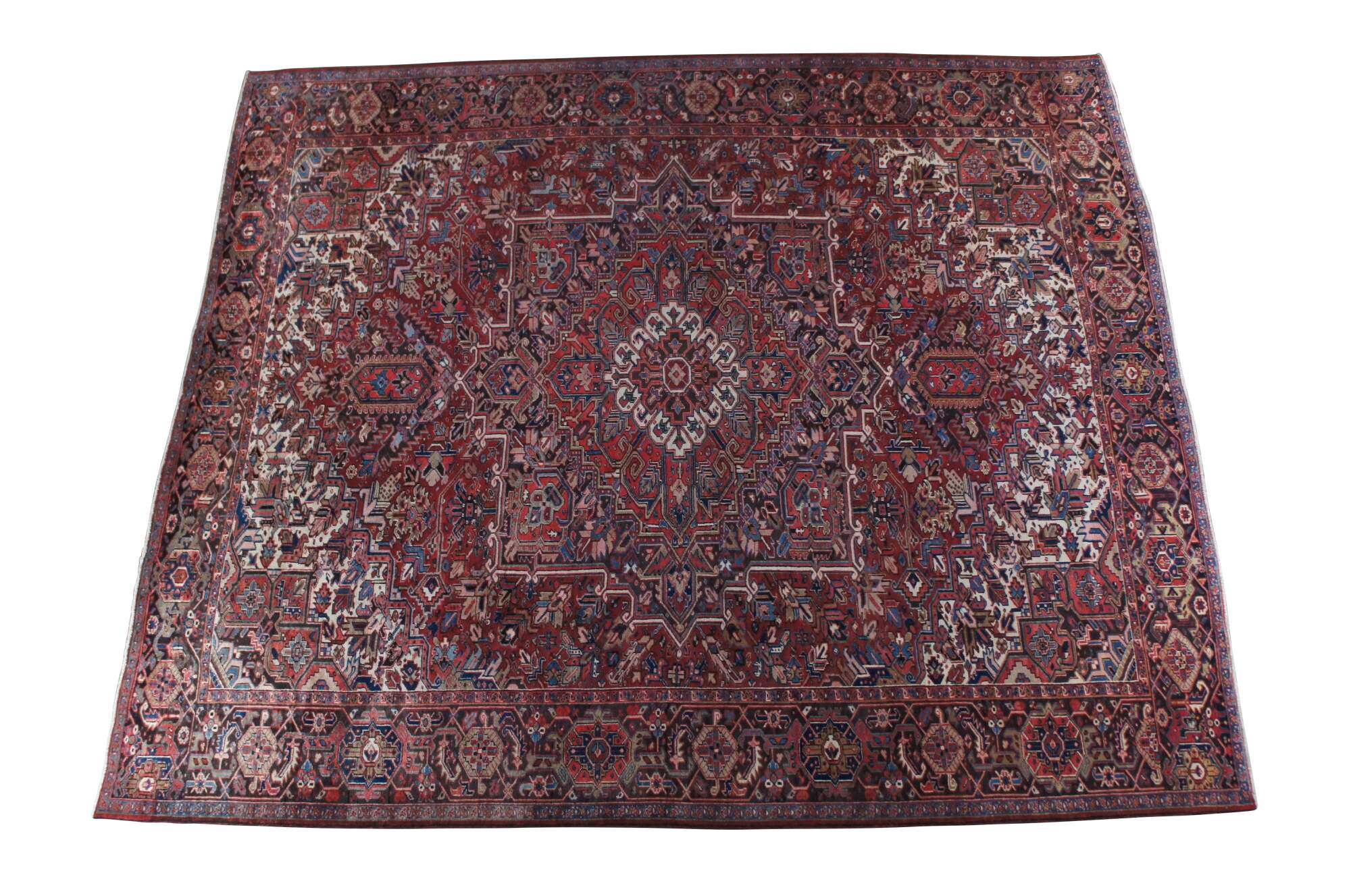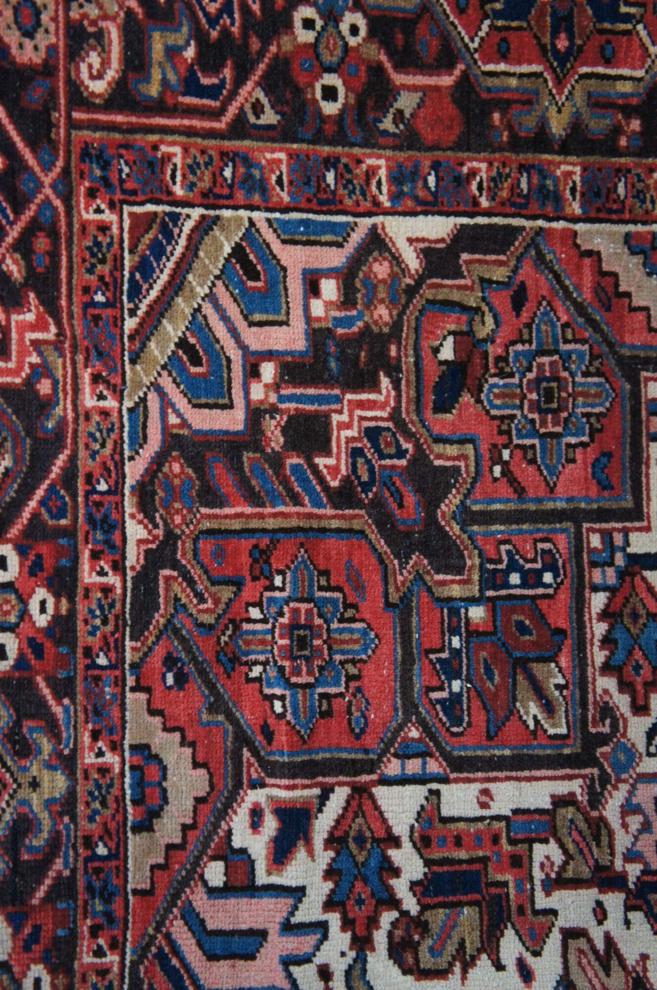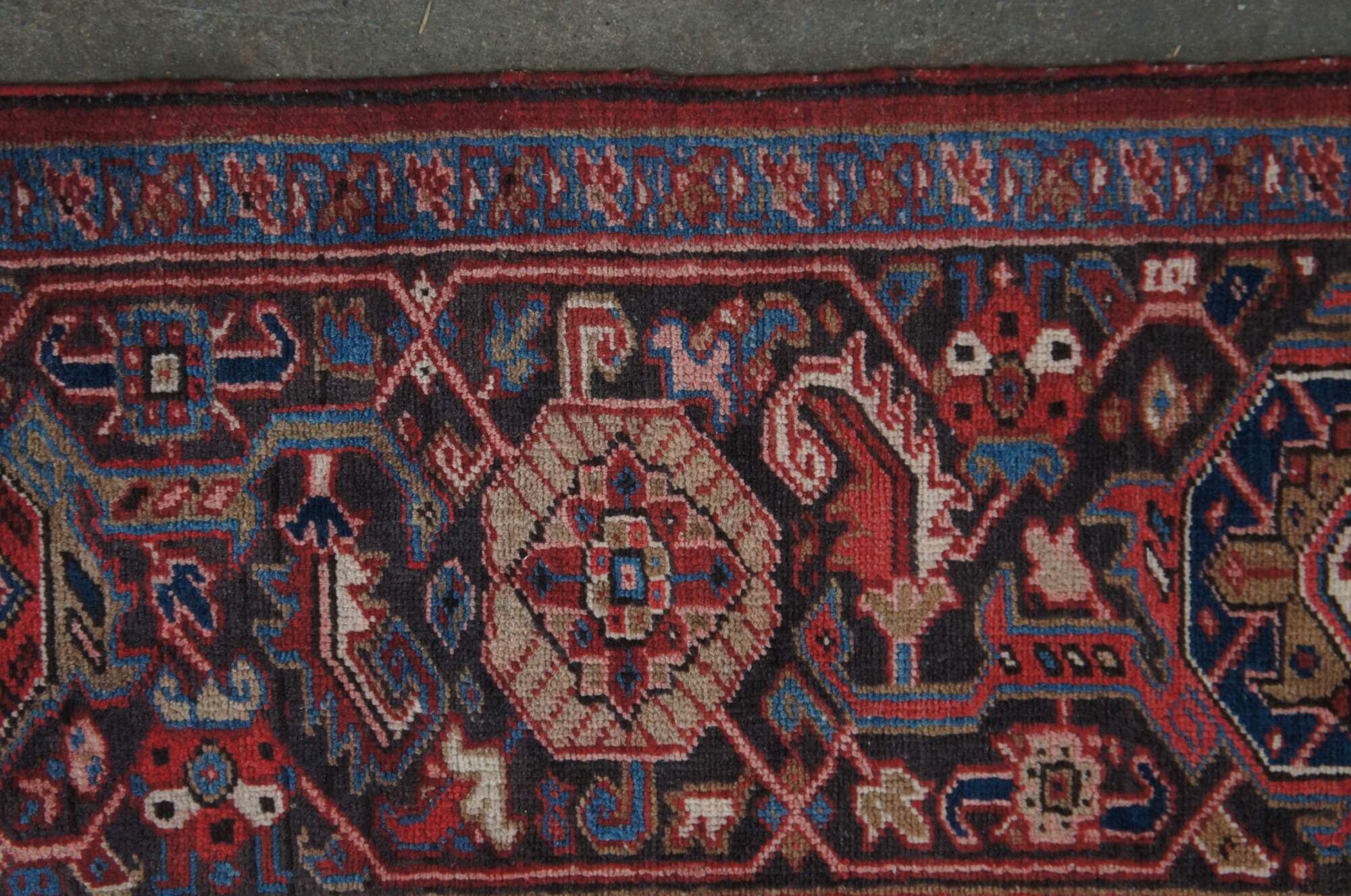 Heriz rug weavers often make them in geometric, bold patterns with a large medallion dominating the field. Such designs are traditional and often woven from memory.