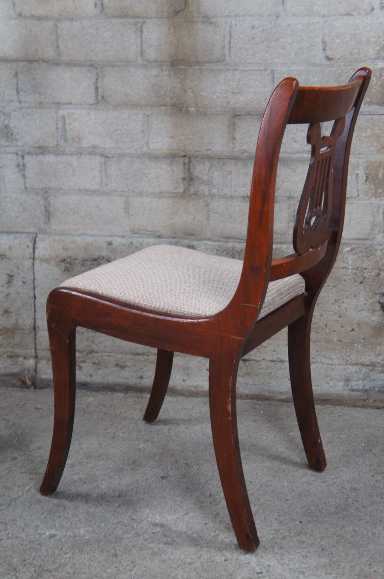 1940s Duncan Phyfe / Regency Style dining side chair. Made from mahogany with a harp / lyre back. Features an upholstered seat and saber legs.