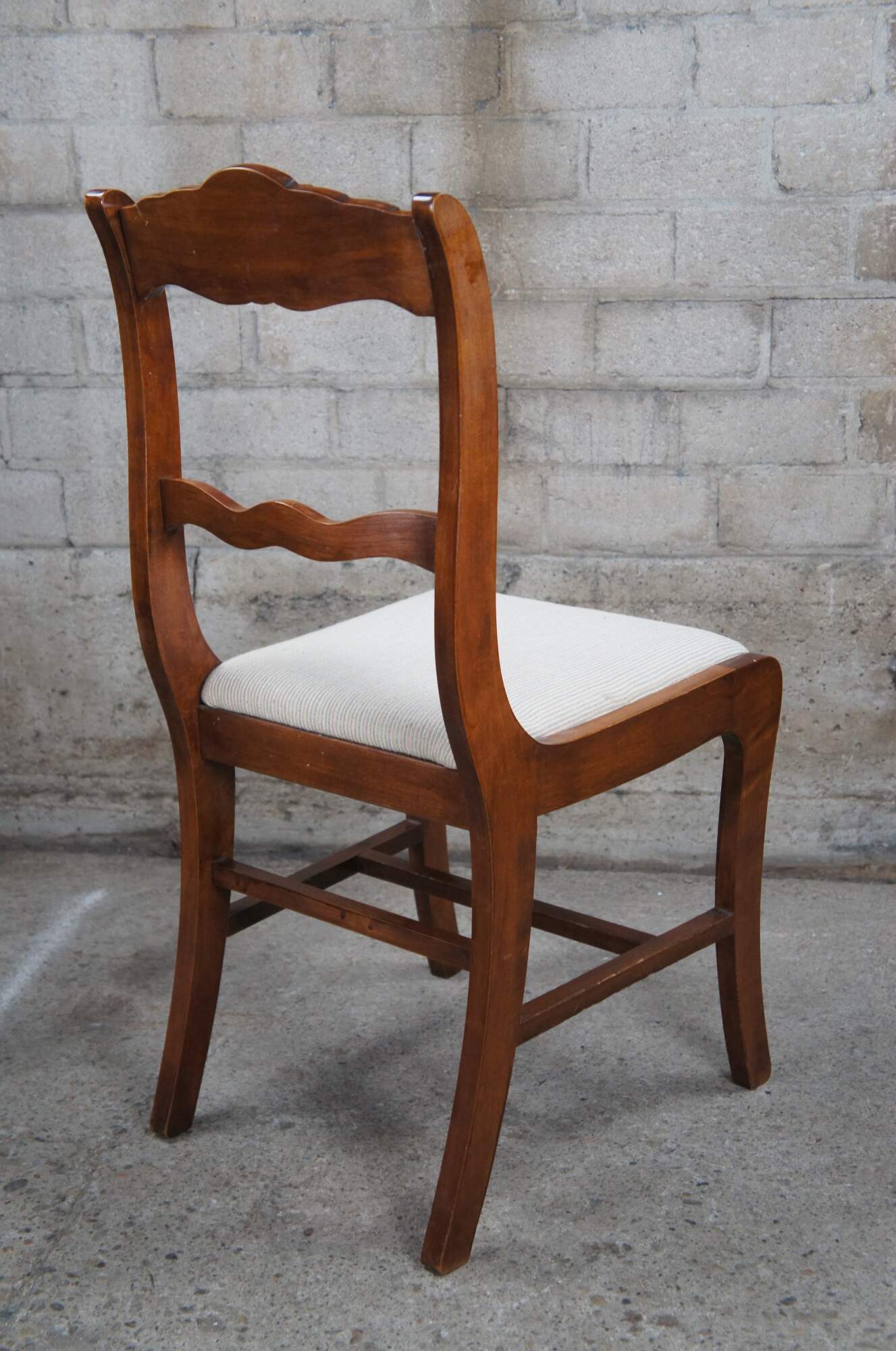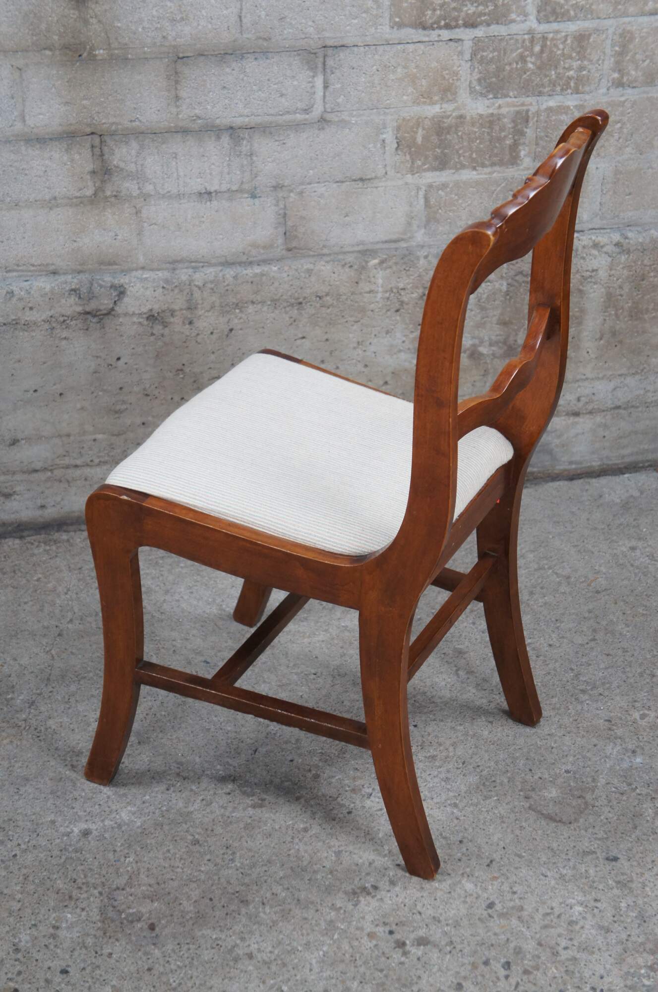 1940s Duncan Phyfe / Regency Style dining side chair. Made from mahogany with a rose carved crest rail. Features an upholstered seat with striped pattern. Front and rear legs are saber shaped and connected by an H stretcher.