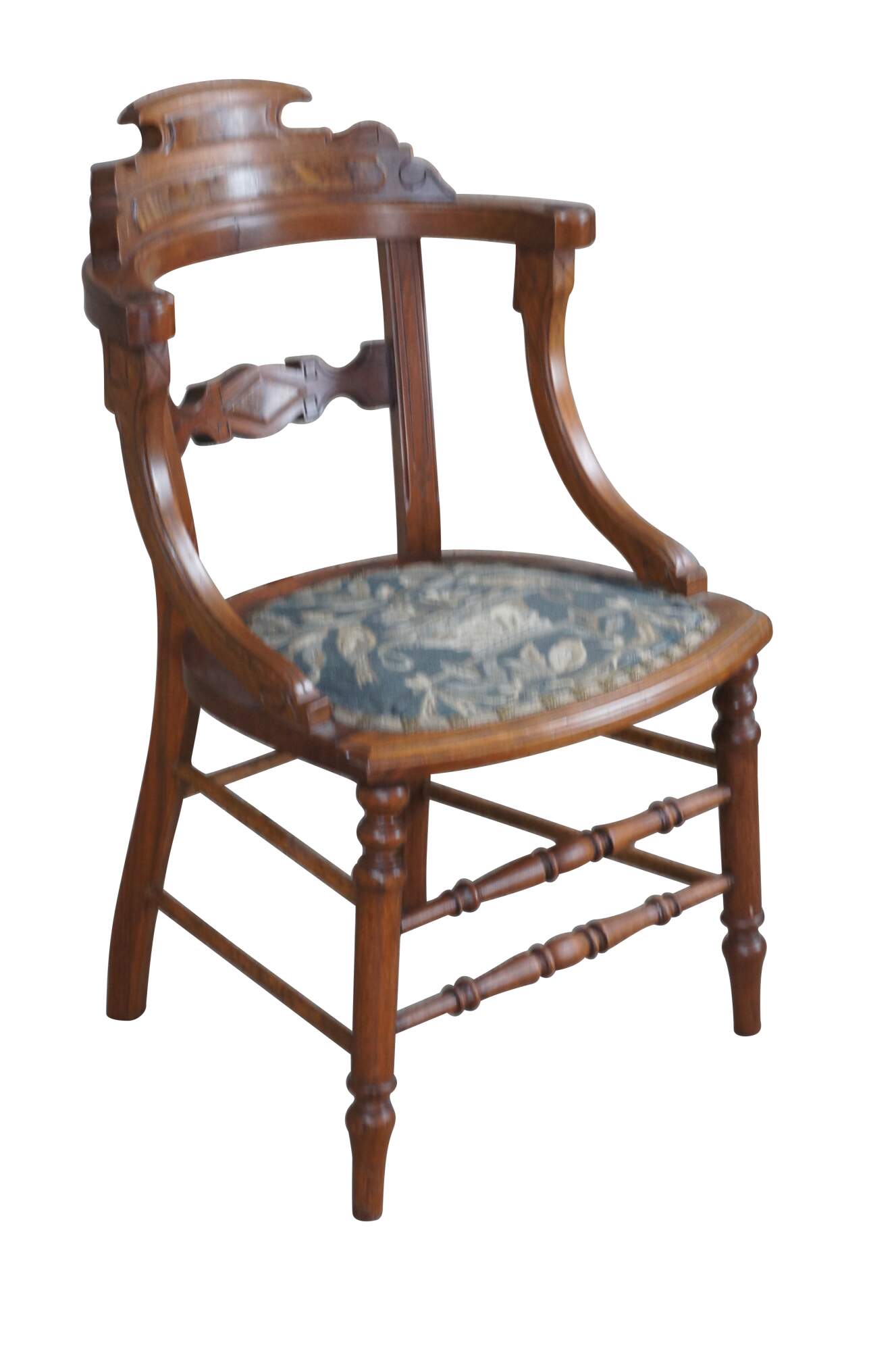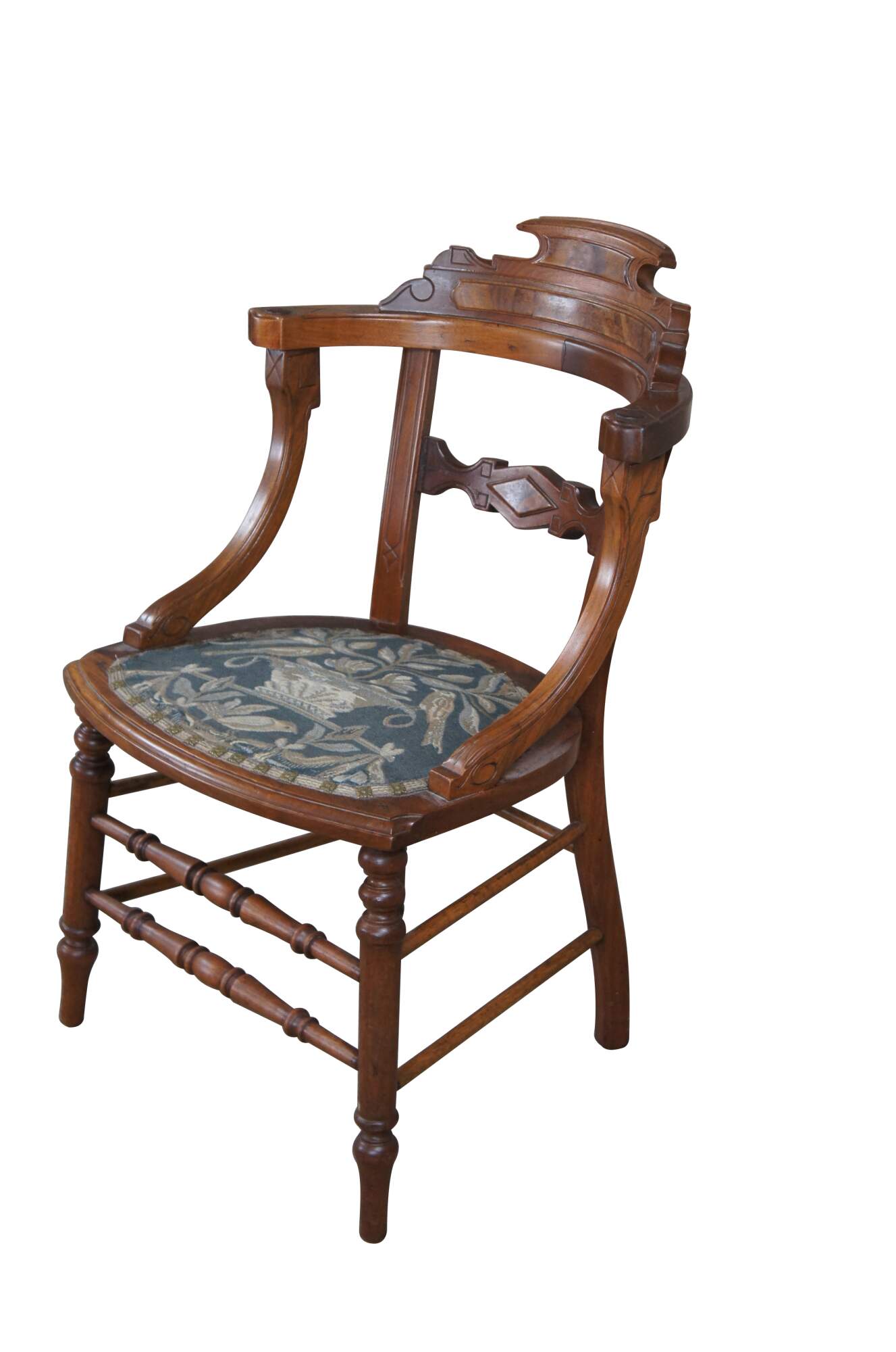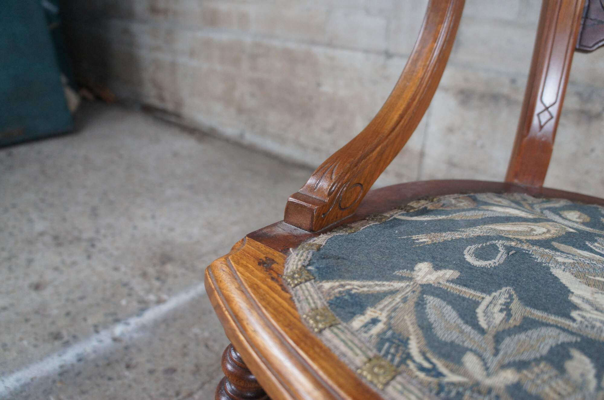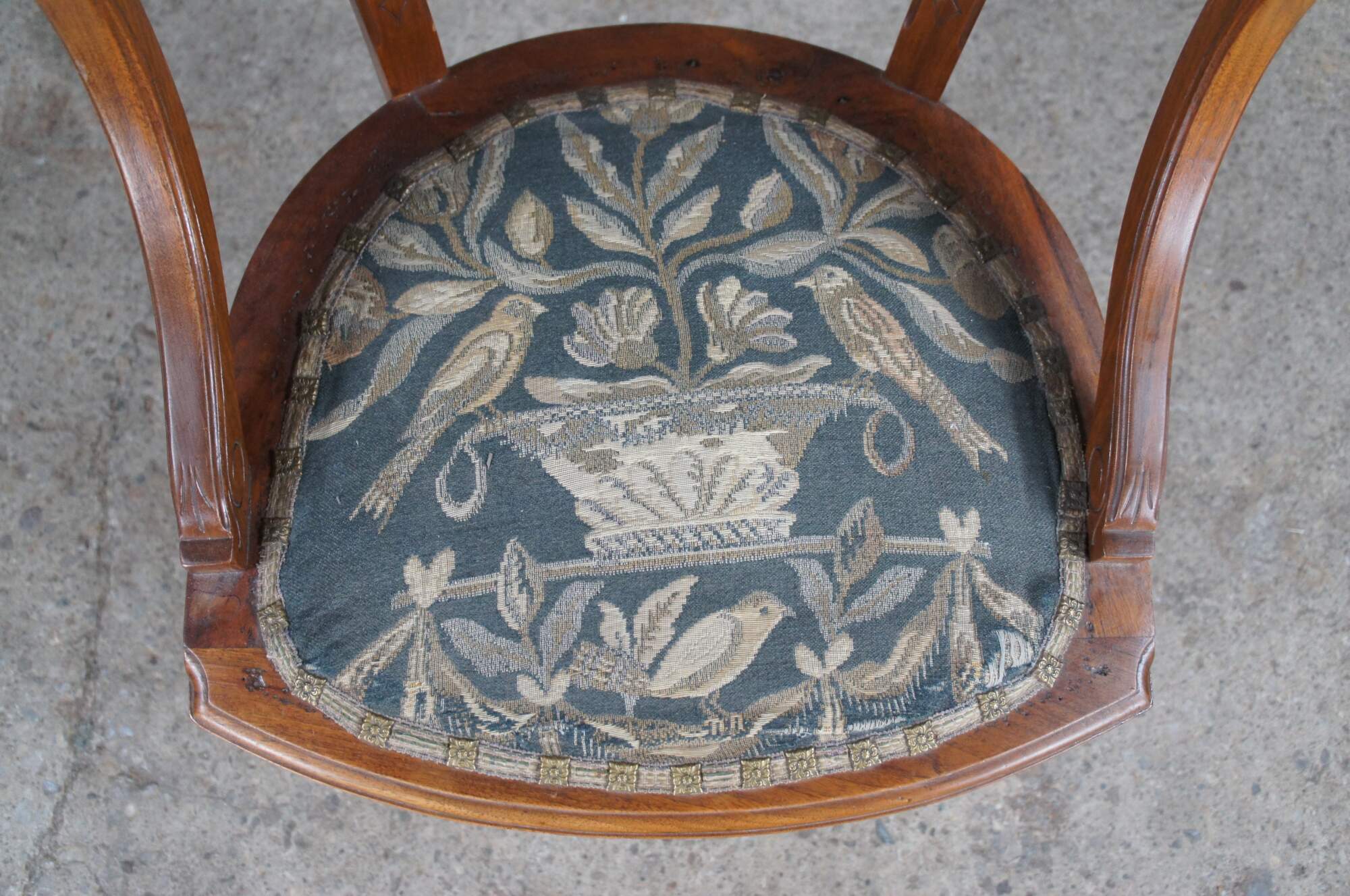 A quaint late 19th century Renaissance Revival side chair. Made from walnut with burled panels. Features a curved back with downswept arms and embroidered seat. Seat features a scene of birds and flowers with ornate metal fasteners on the cording. The chair is supported by turned legs along the front with turned stretchers.