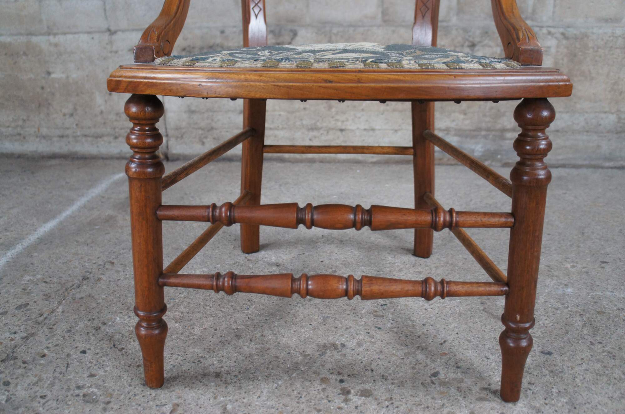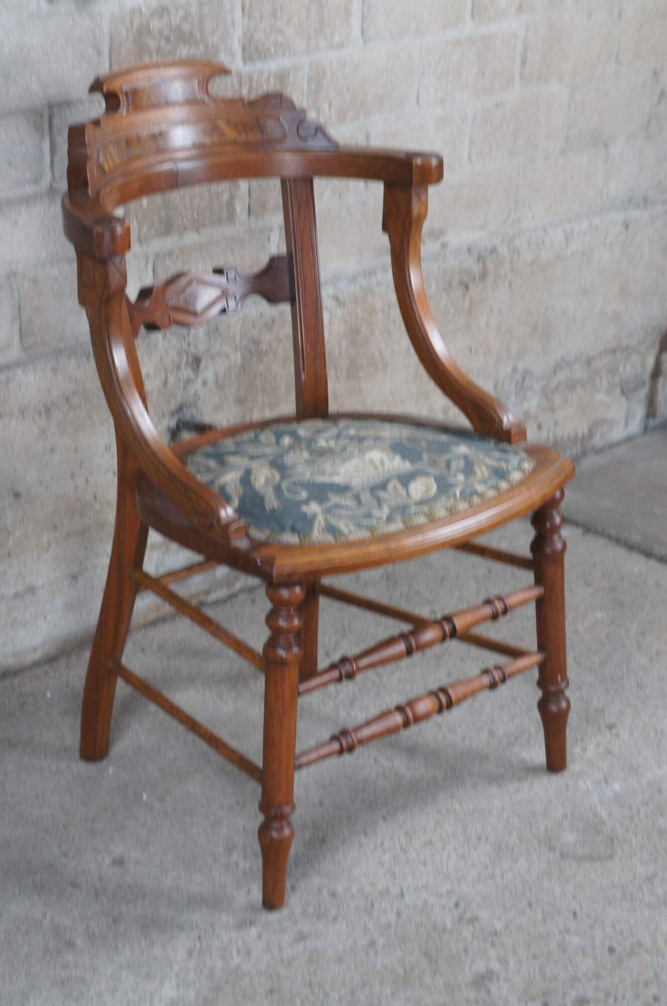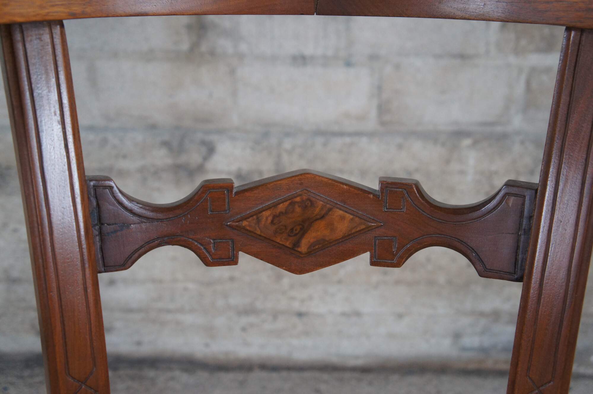 A quaint late 19th century Renaissance Revival side chair. Made from walnut with burled panels. Features a curved back with downswept arms and embroidered seat. Seat features a scene of birds and flowers with ornate metal fasteners on the cording. The chair is supported by turned legs along the front with turned stretchers.